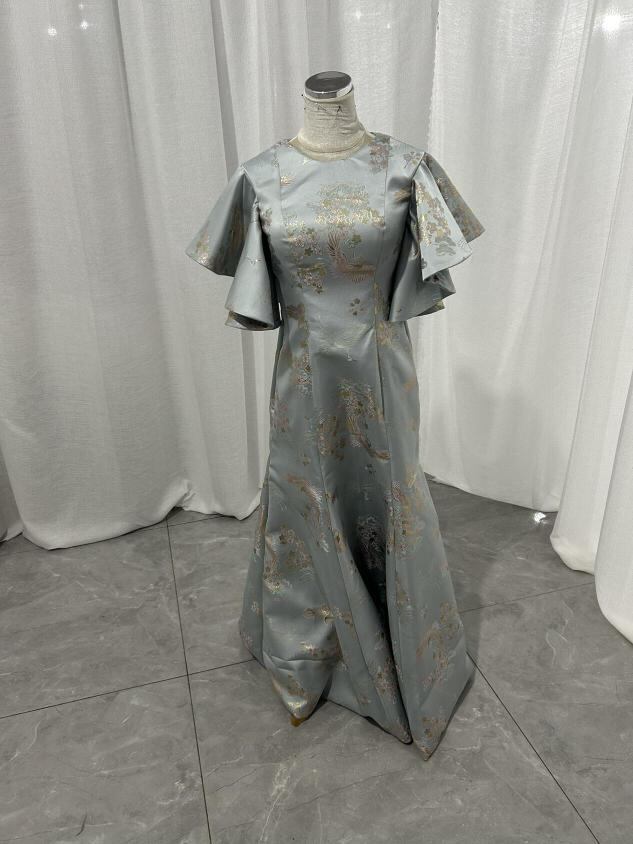実例写真!着物ドレス、和風ドレス ブルー フリル袖 ラウンドネック ソフトマーメイドライン 床付く 前撮り