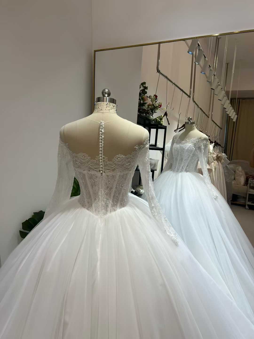 フランス風 ウエディングドレス ロングスリーブ くるみボタン チュールスカート 流れる透け花レース 拳式/前撮り