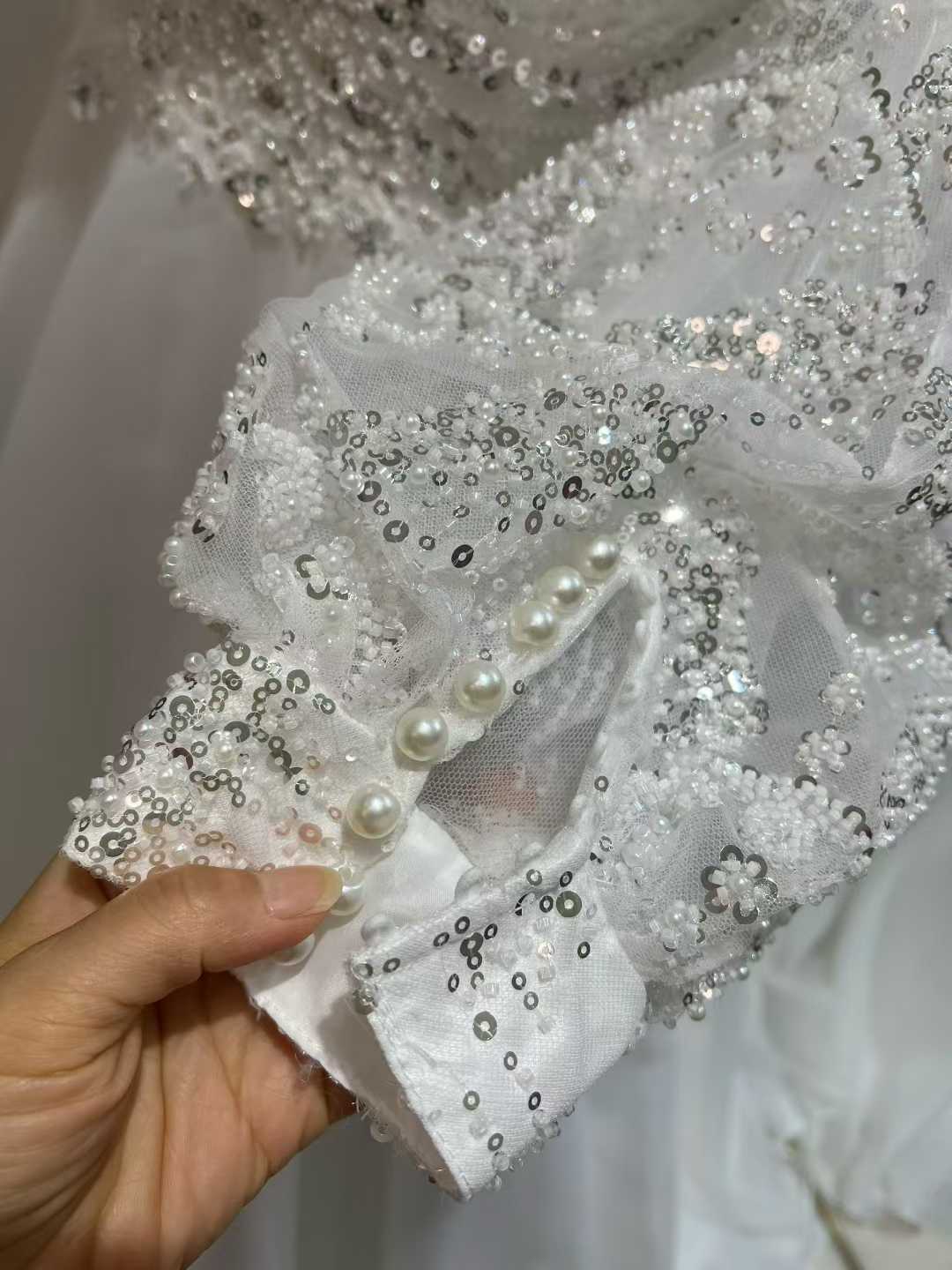 ウェディングドレス ロングスリーブ ハイネック 3D立体レース刺繍 キラキラスパンコール ファスナー 教会式