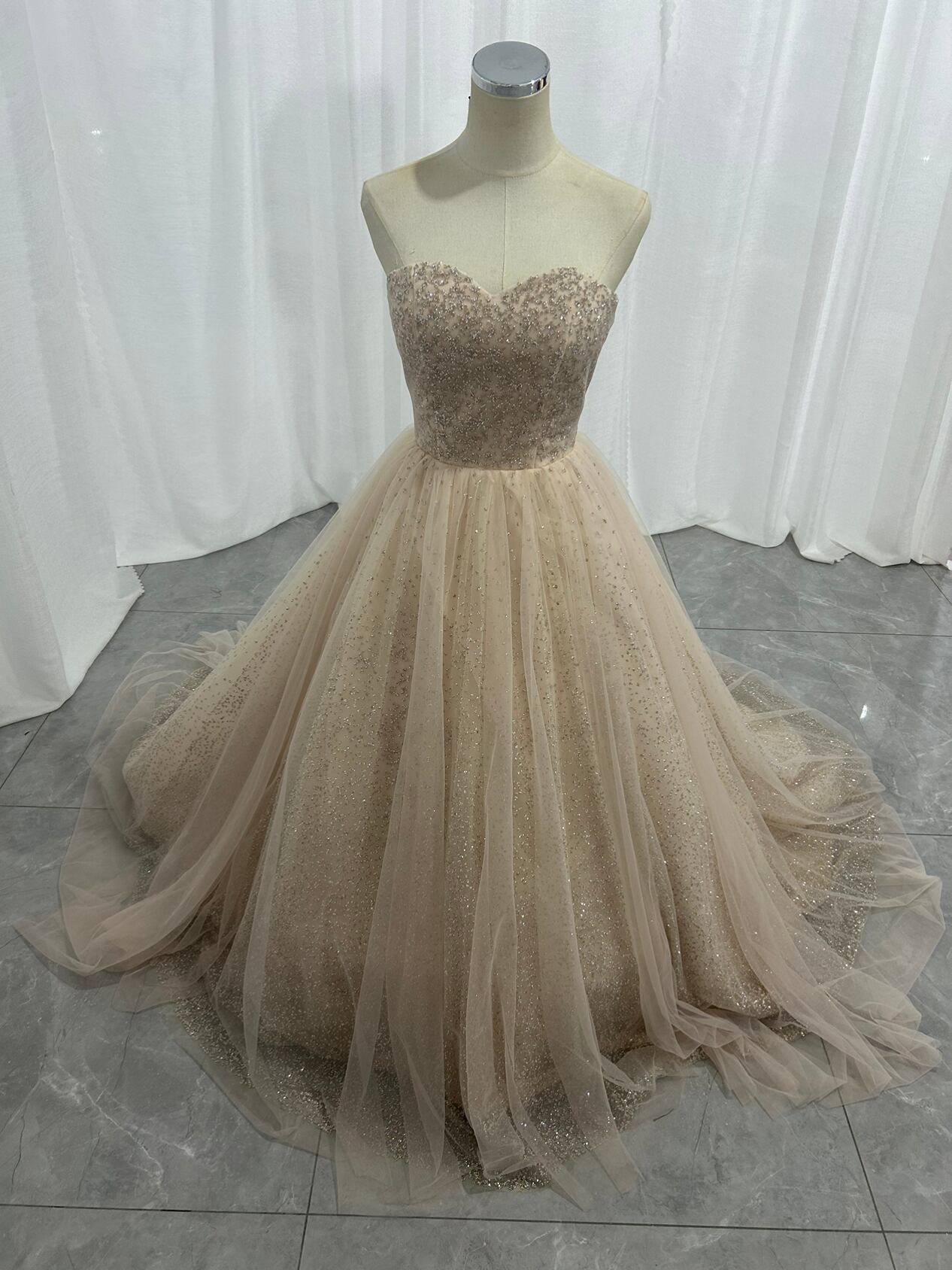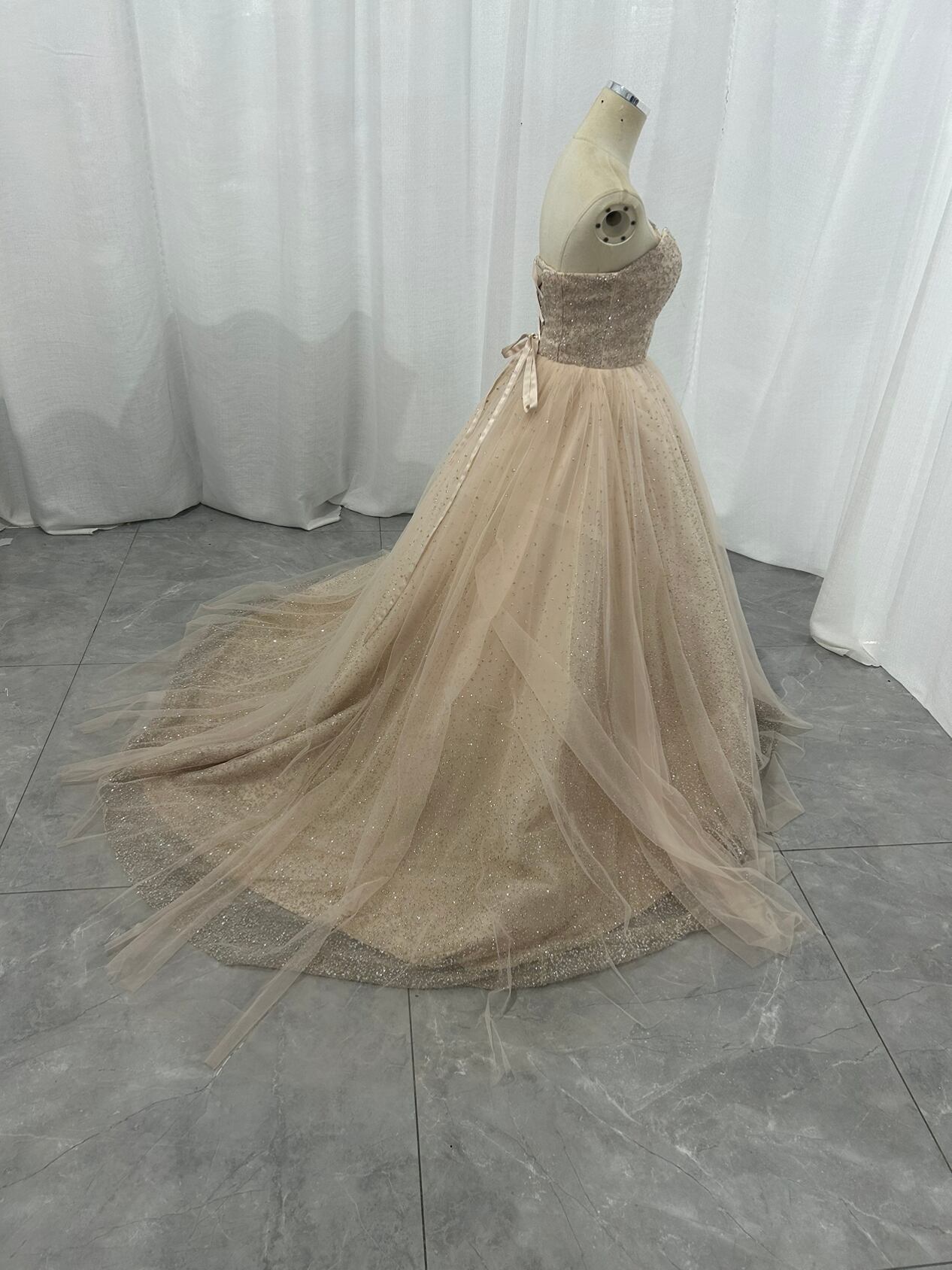 カラードレス 薄シャンパン色 ベアトップ ビジュー シークインチュール 花嫁 抜群におしゃれ度が際立つ