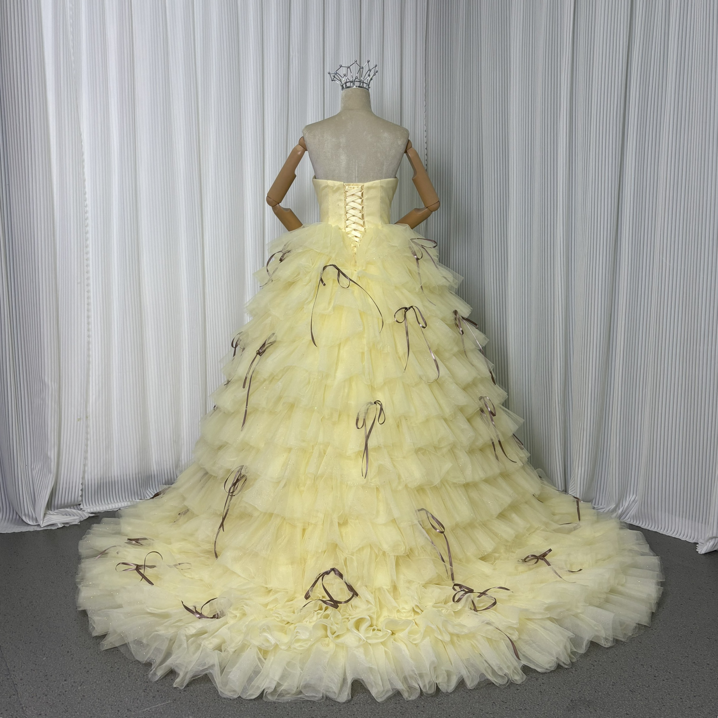 カラードレス パステルイエロー ベアトップ 柔らかく重ねたチュールスカート リボン キラキラチュール 前撮り
