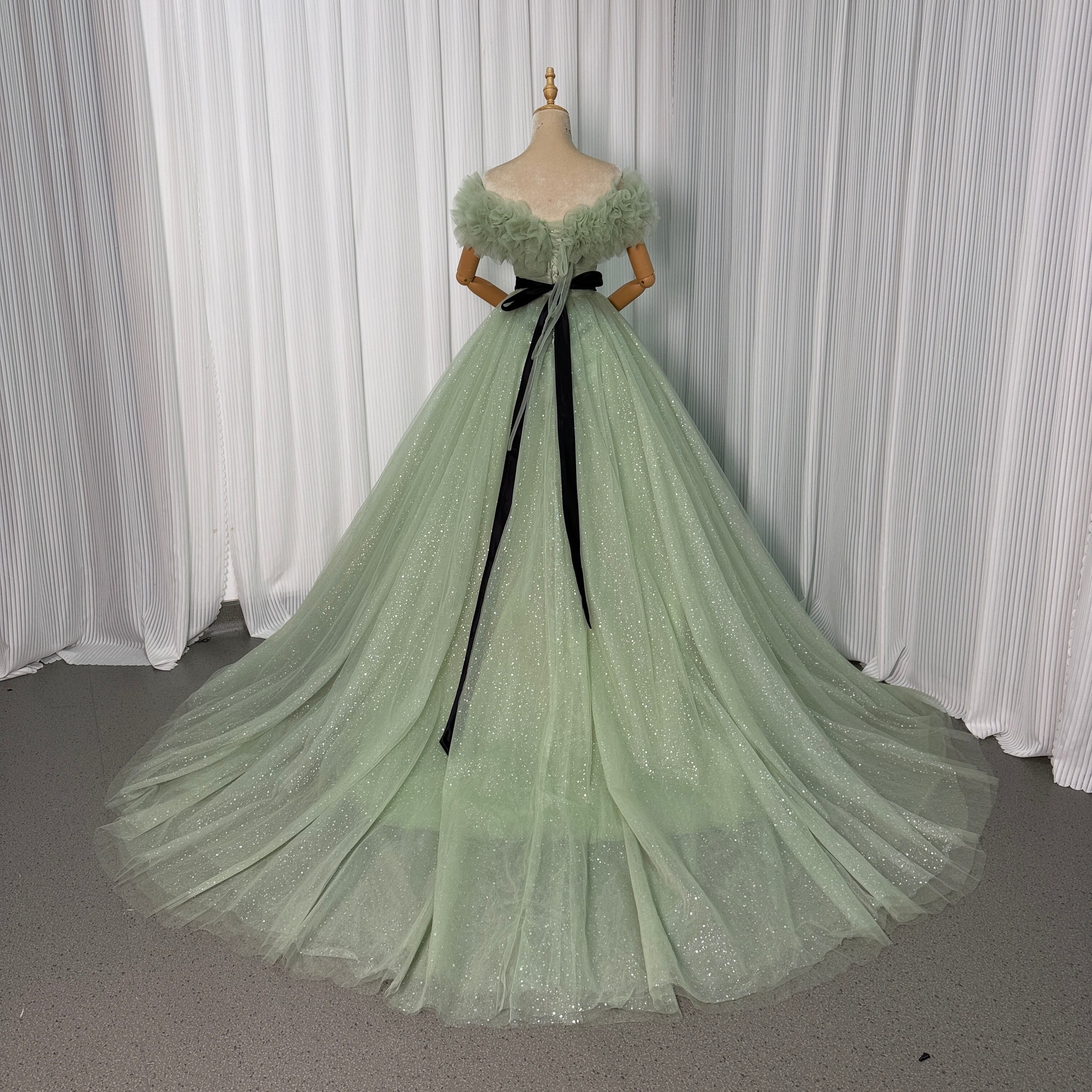 美品!カラードレス ミントグリーン 取り外しオフショルダー サッシュベルト シークインチュール ロングトレーン 花嫁