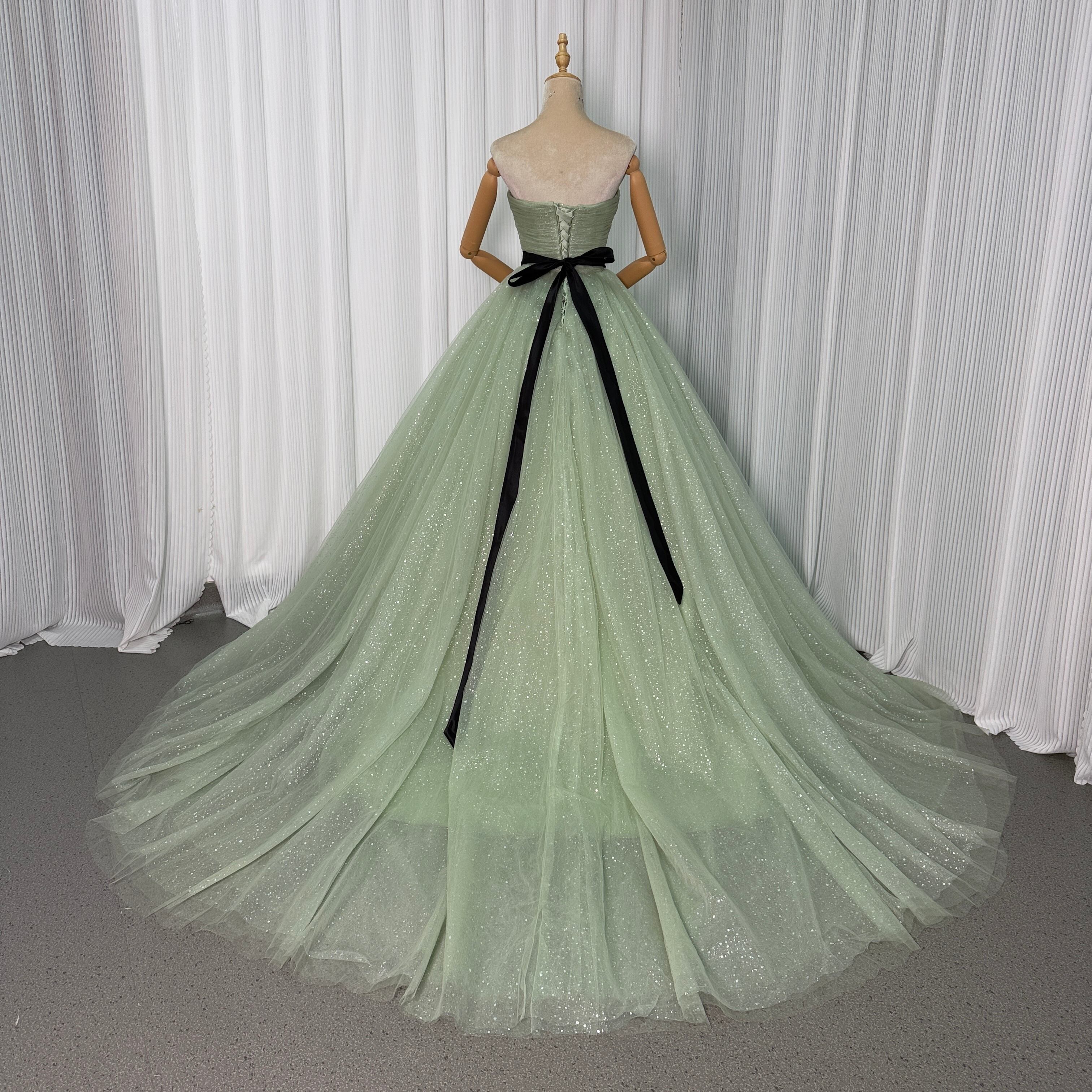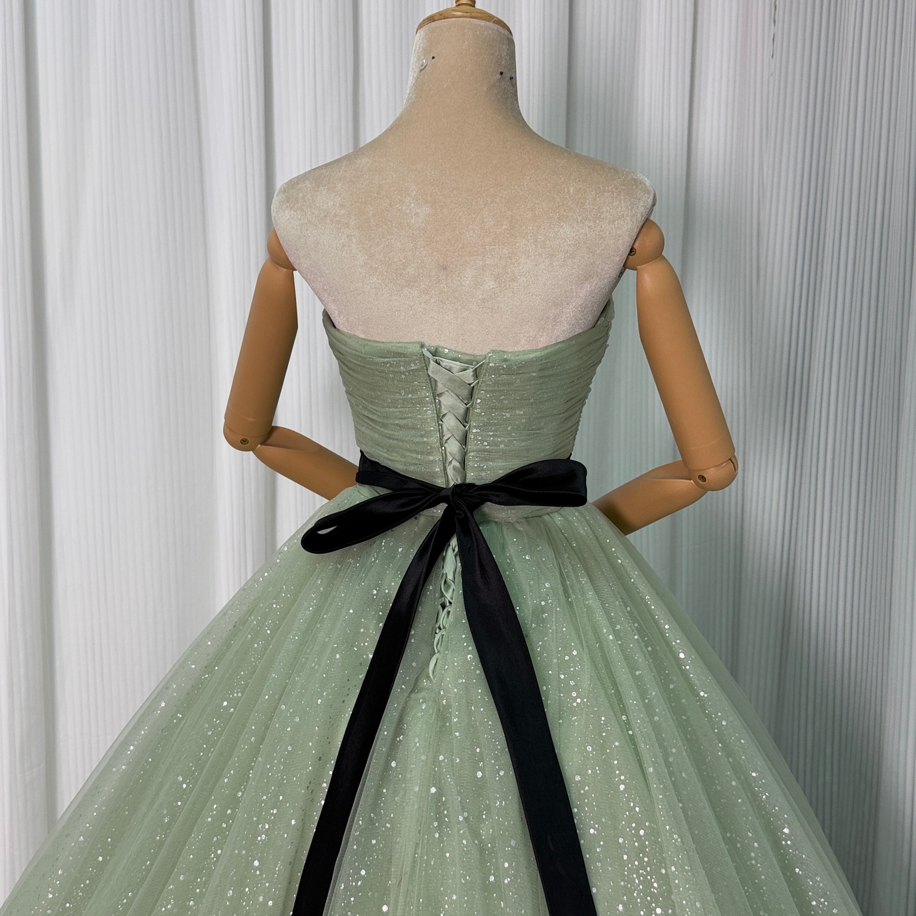 カラードレス ミントグリーン ベアトップ サッシュベルト シークインチュール ロングトレーン 花嫁