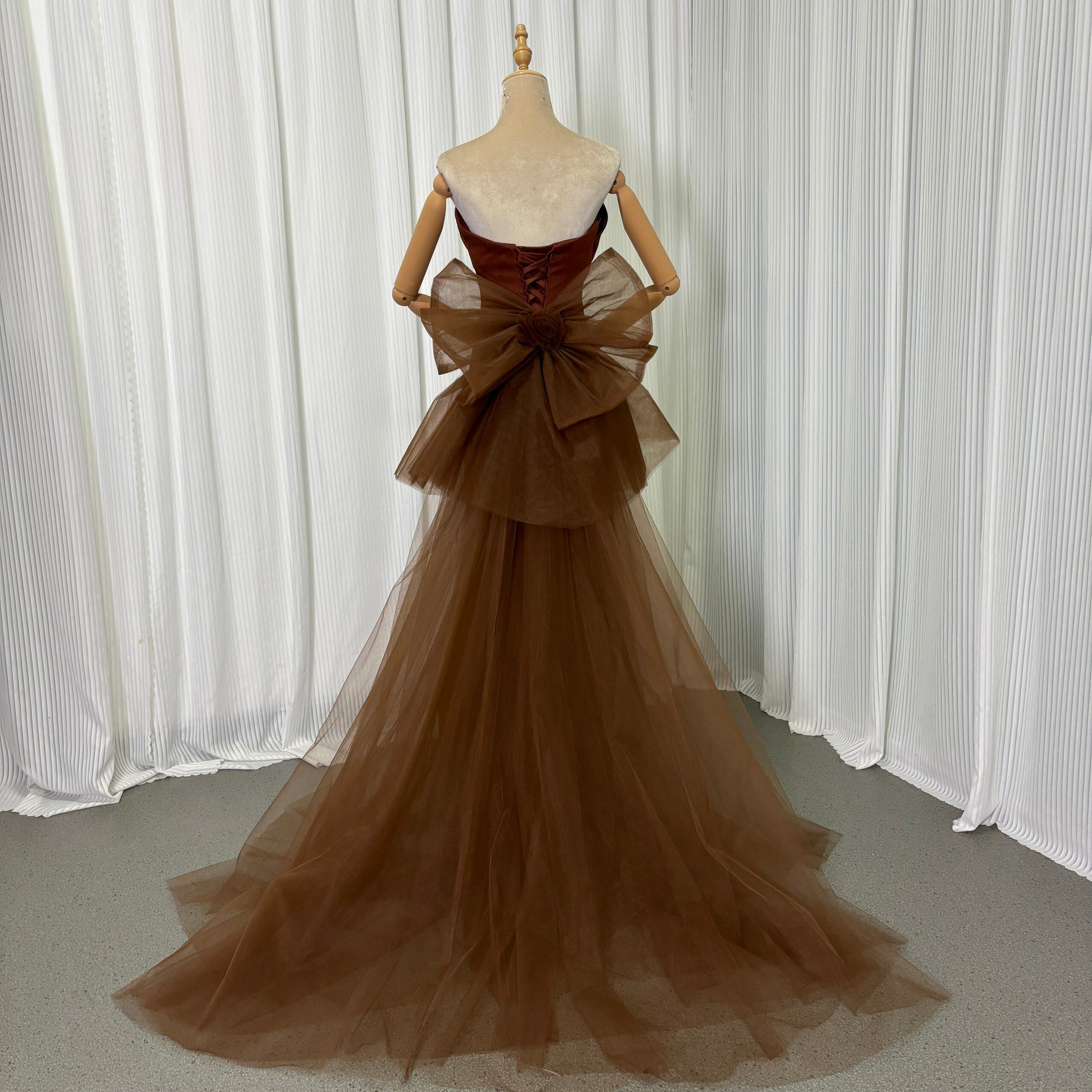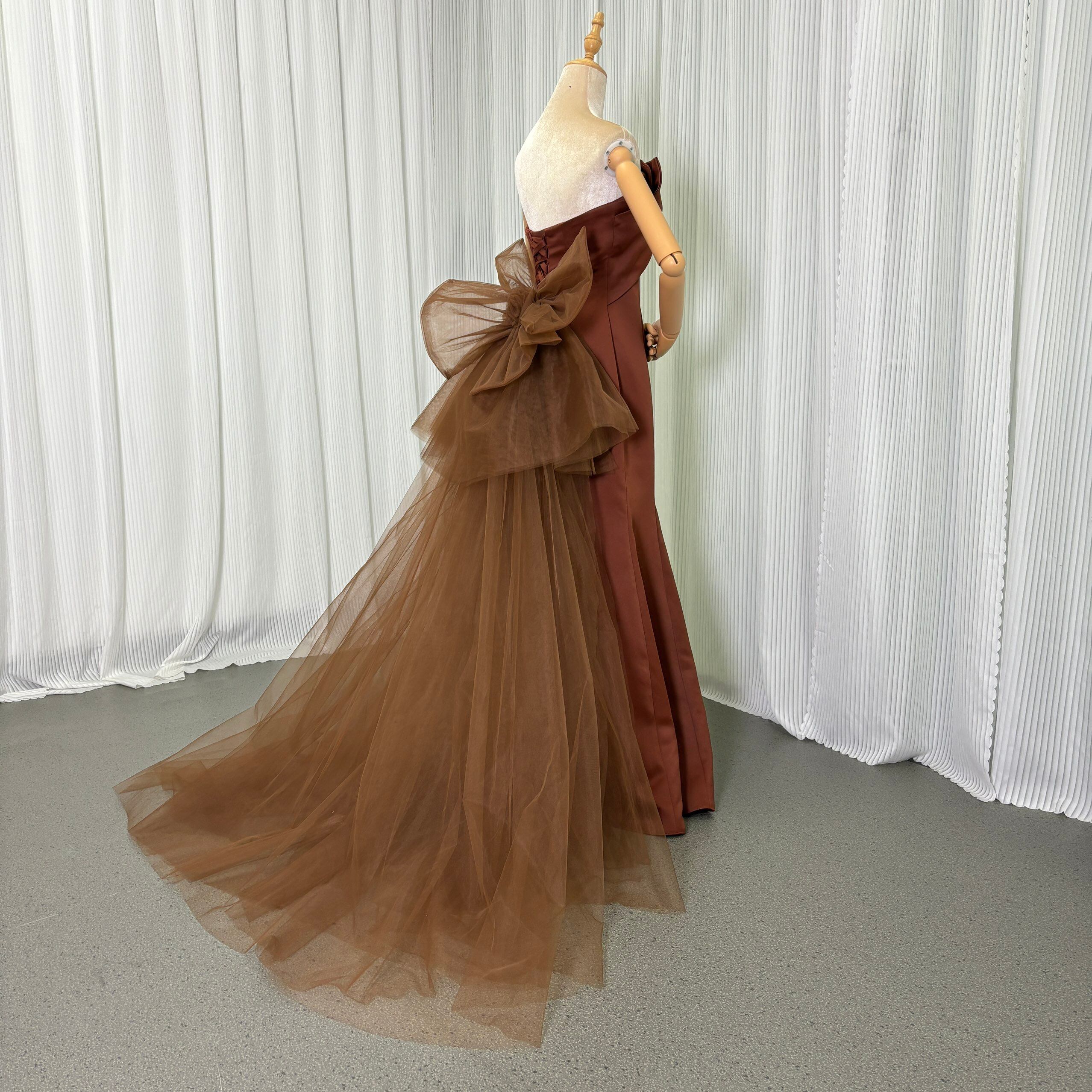 カラードレス テラコッタ色 ベアトップ ふっくら柔らかなバックリボン 編み上げ 細見えシルエット デザイン感 前撮り