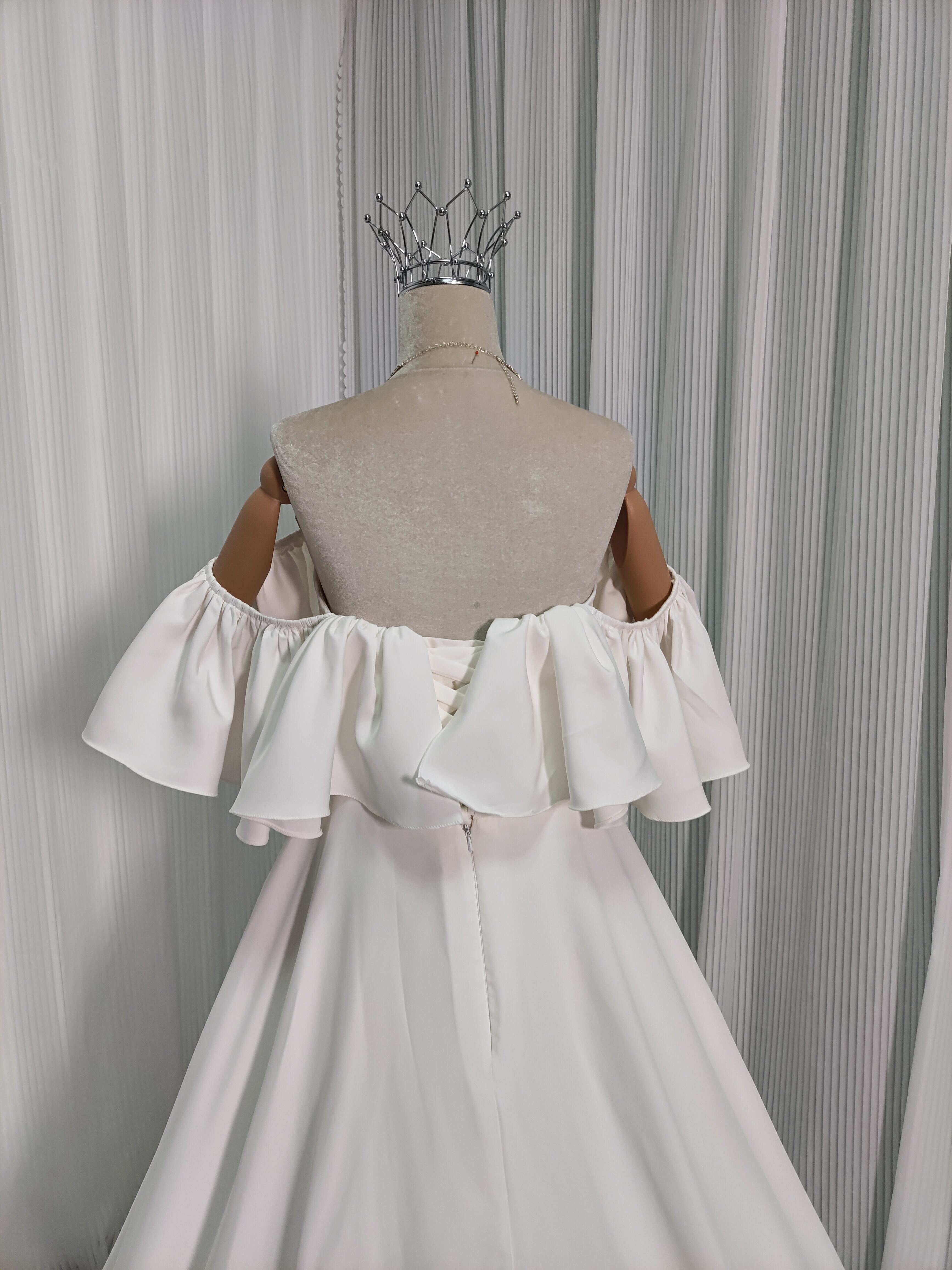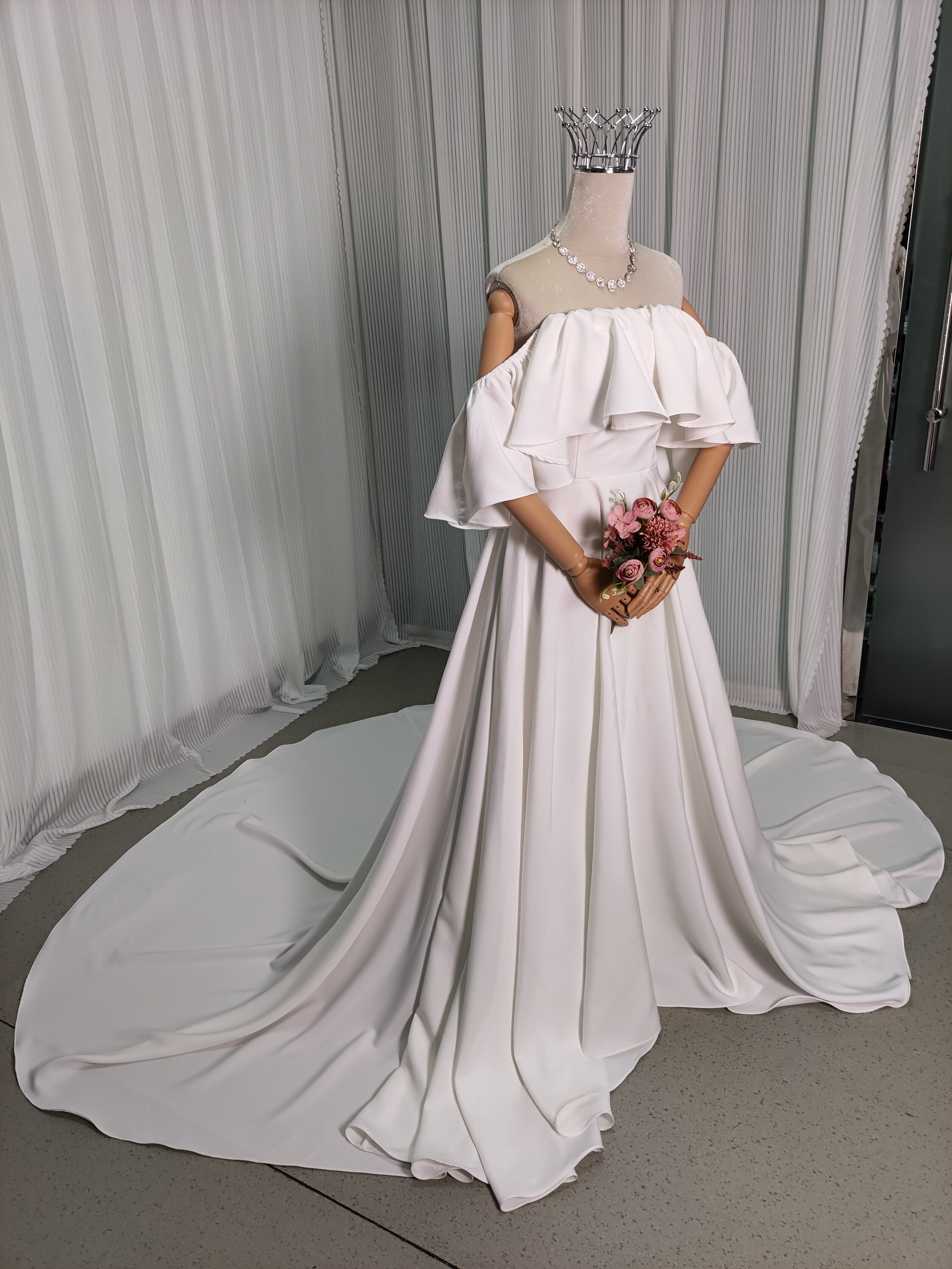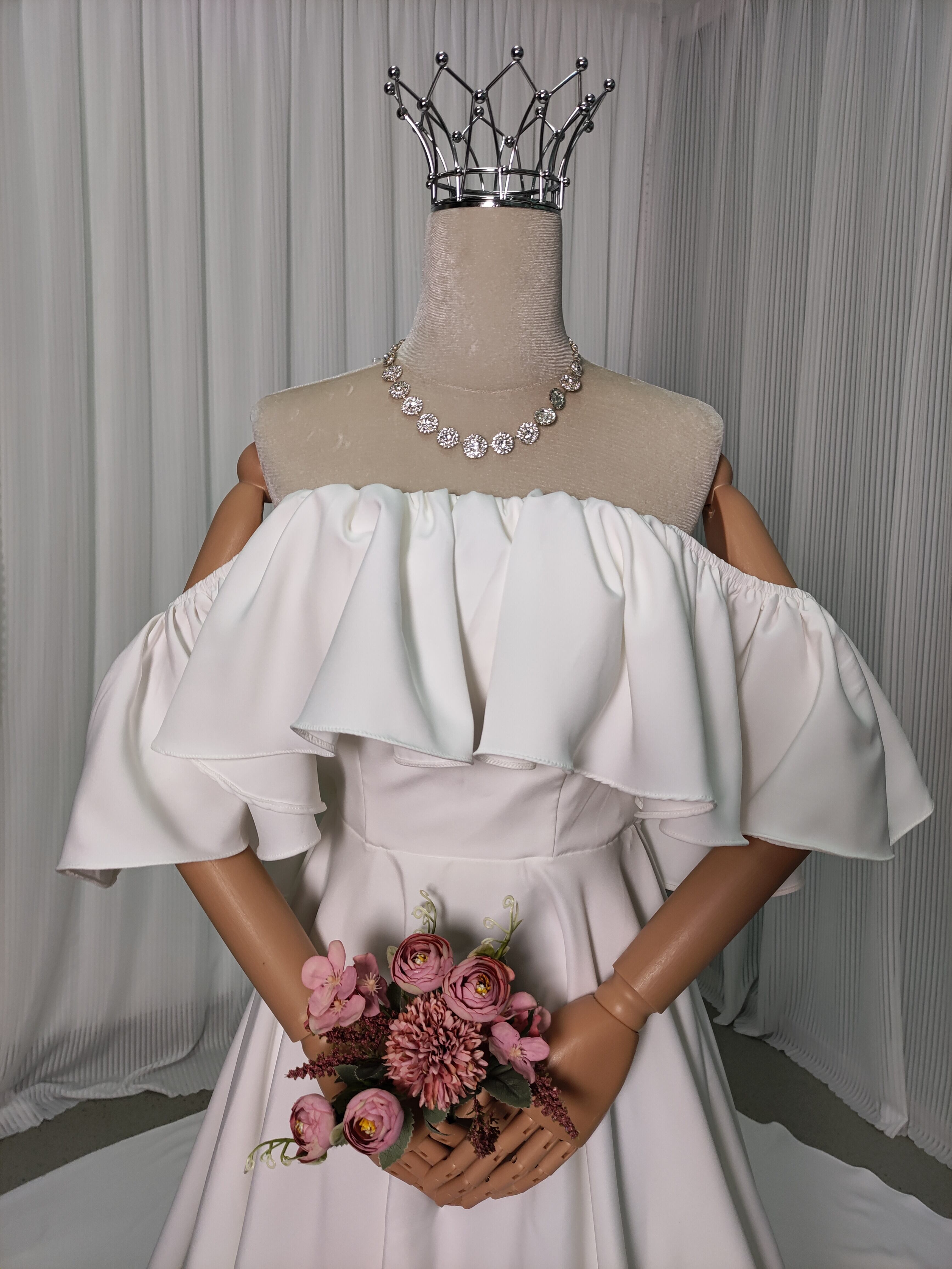 パーティードレス オフホワイト オフショルダー 編み上げ クレープ生地 ロングトレーン 披露宴 前撮り