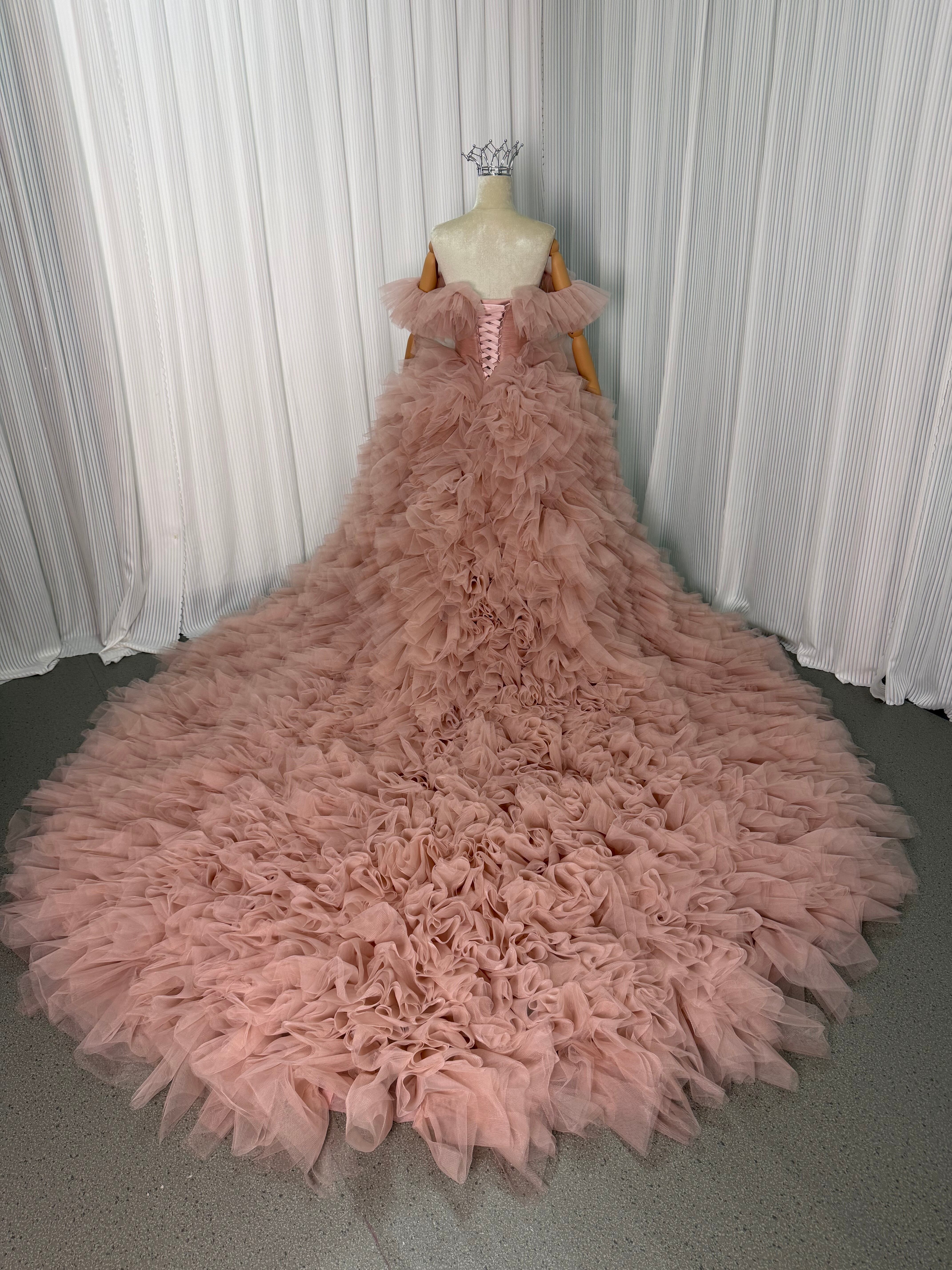 豪華!カラードレス ピンク オフショルダー 柔らかく重ねたチュールスカート ロングトレーン デザイン感 花嫁