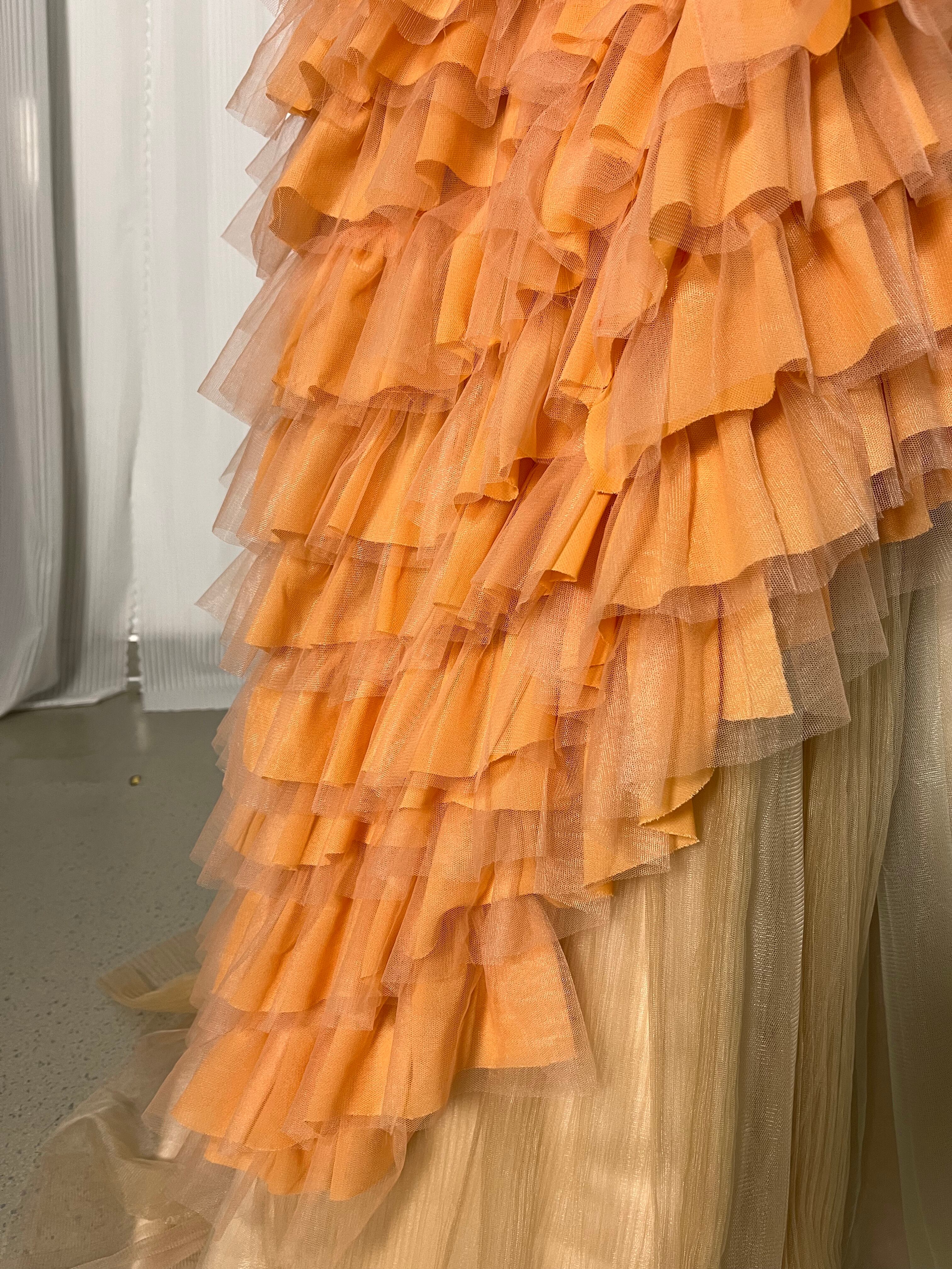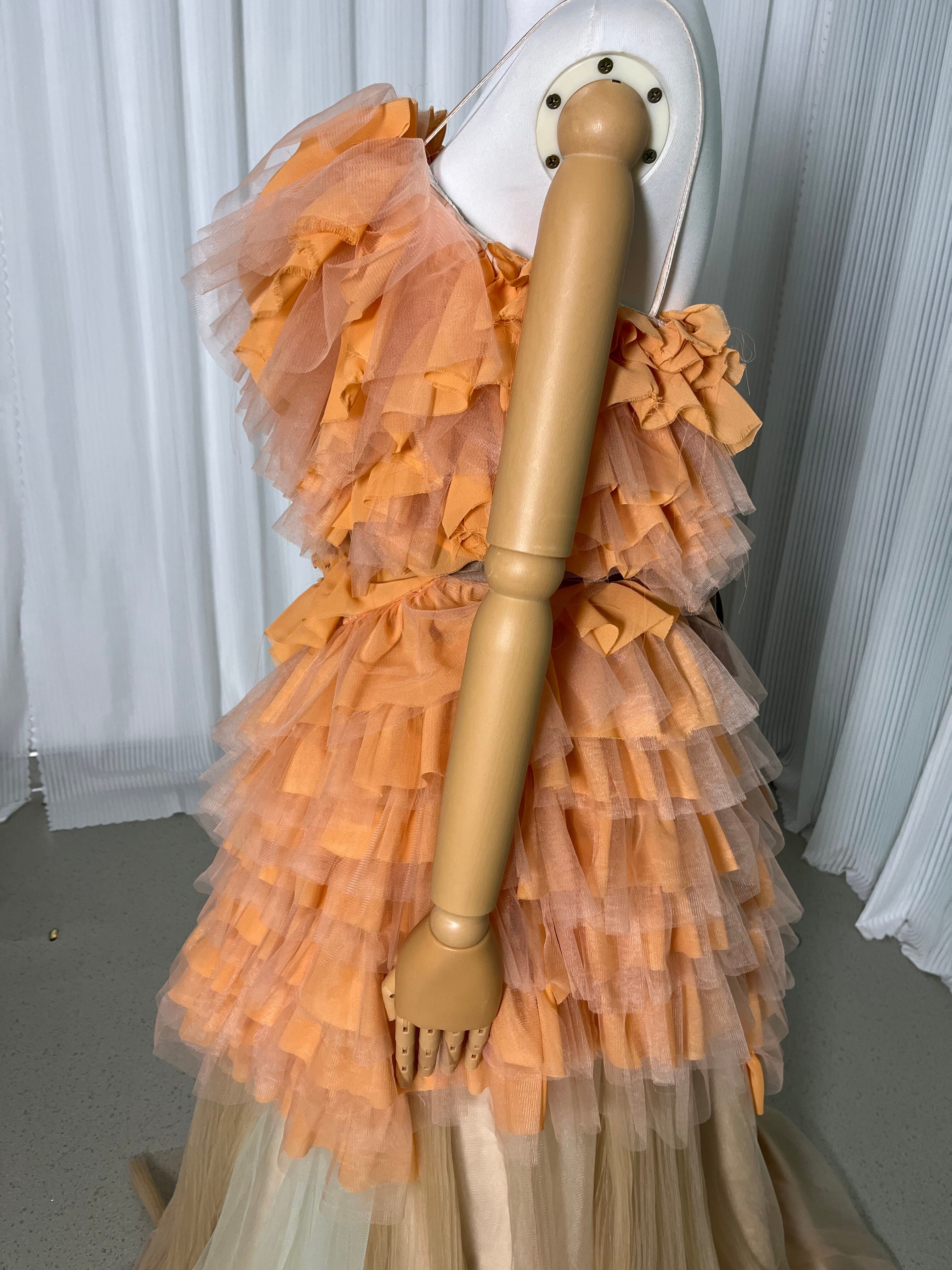 豪華!パーティードレス オレンジ キャミソール ラッフルフリル デザイン感 プリーツスカート 前撮り 二次会