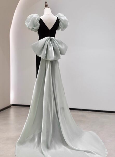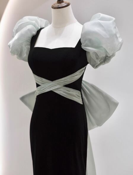 パーティードレス パフスリーブ ブラック スクエアネック ふっくら柔らかなバックリボン 優雅なシルエット 前撮り