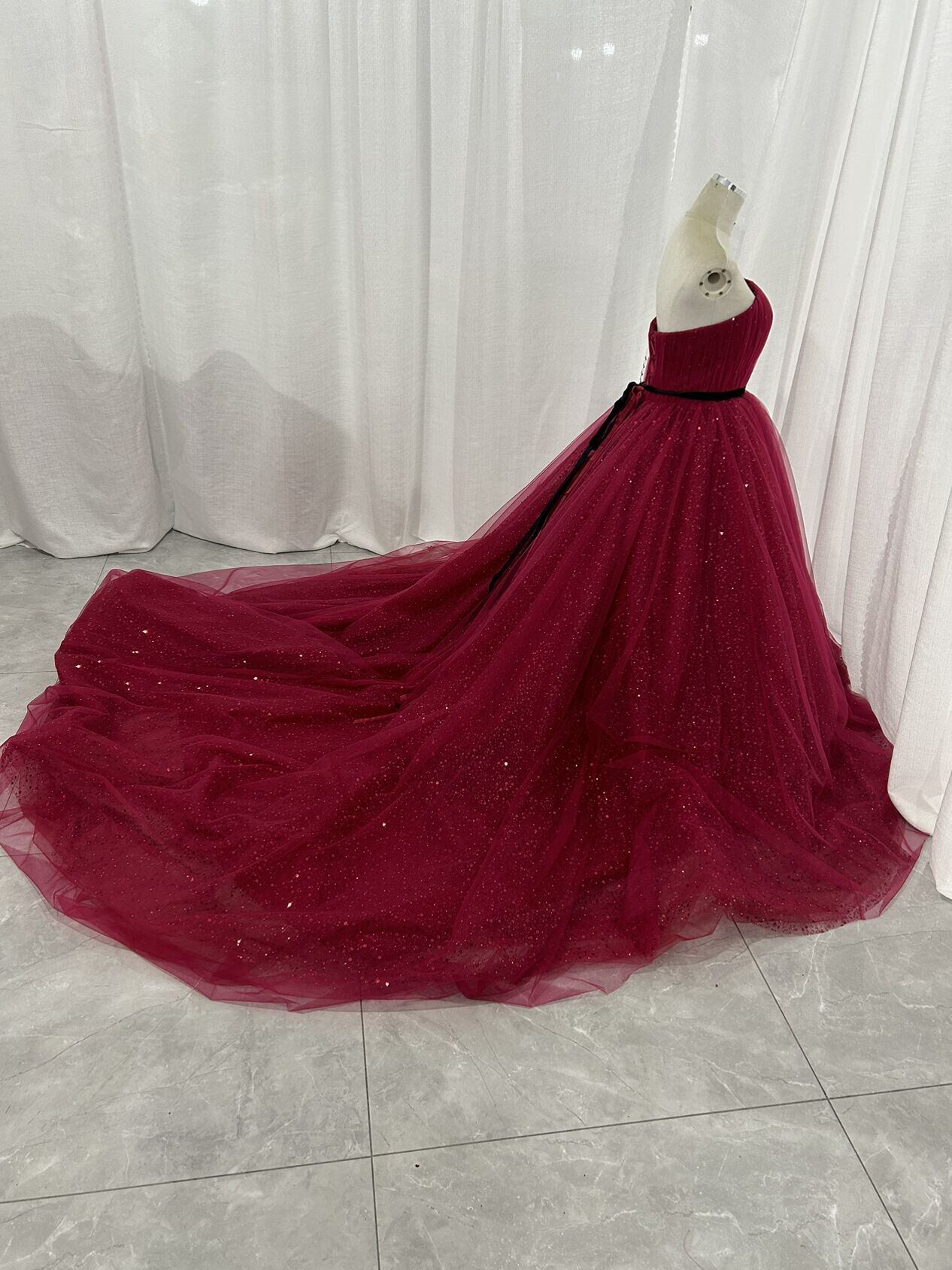 人気上昇!カラードレス ボルドー色 ベアトップ シークインチュール ロングトレーン 編み上げ 花嫁 披露宴