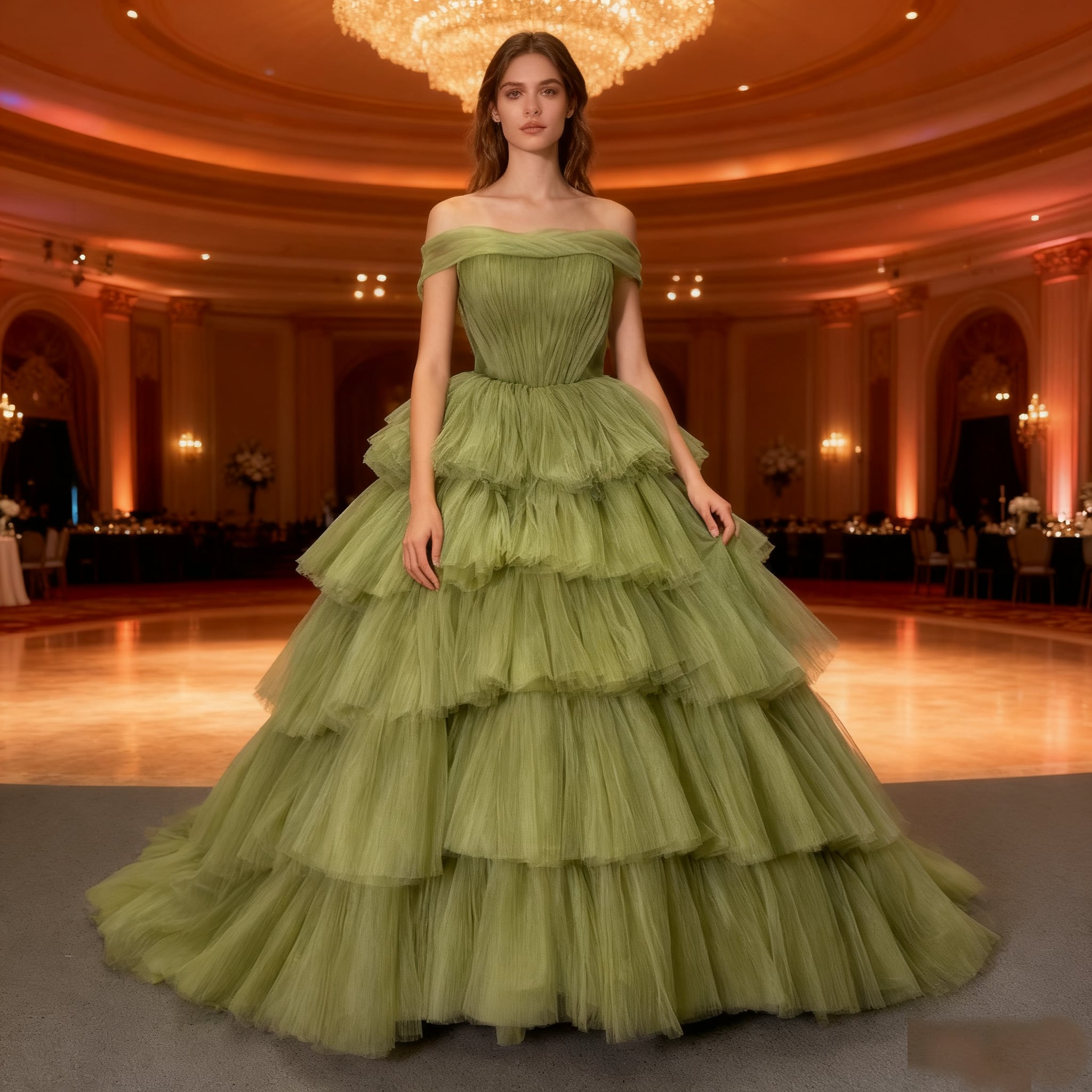 人気上昇!カラードレス グリーン 取り外しオフショルダー 柔らかく重ねたチュールスカート 花嫁