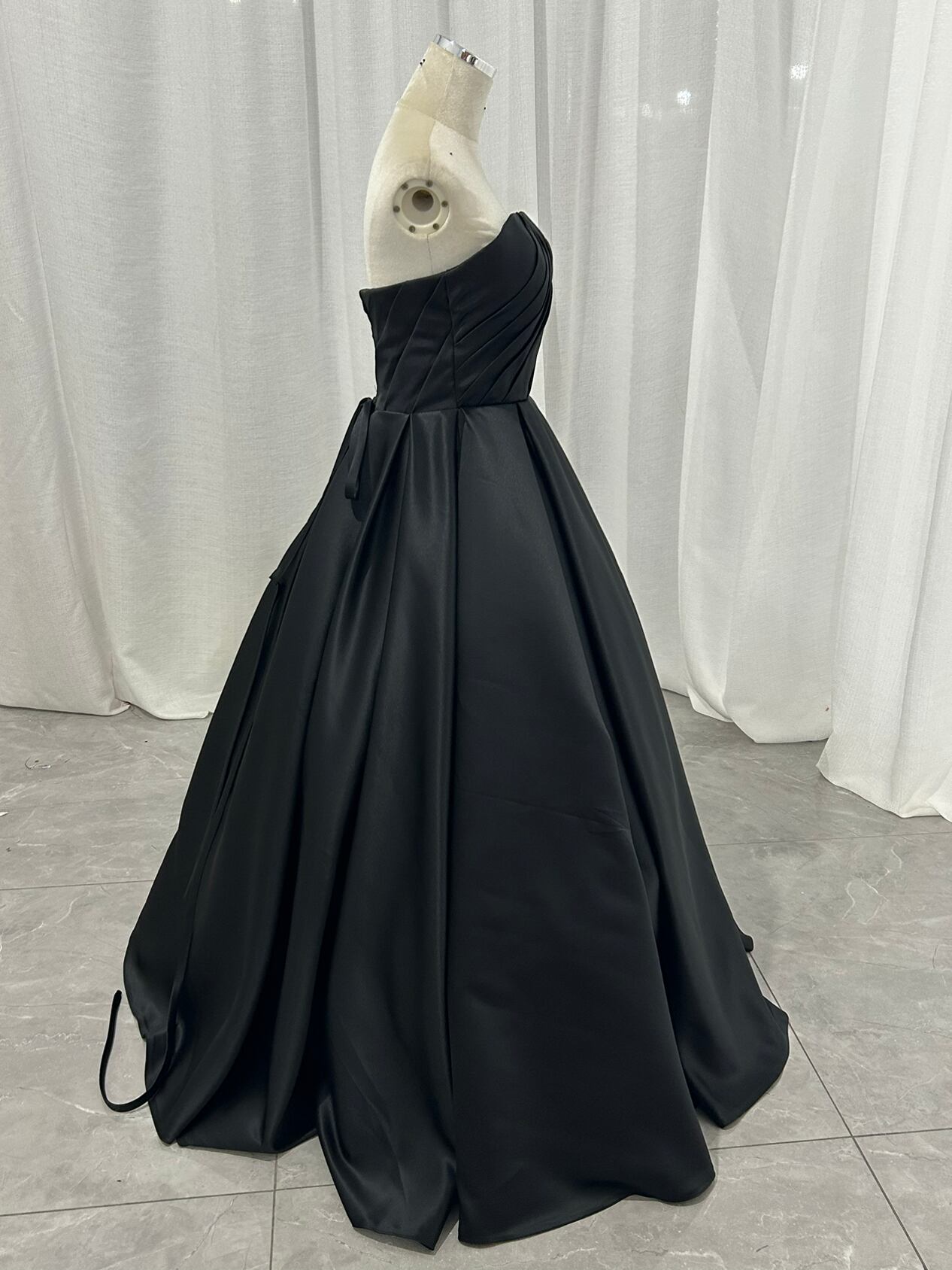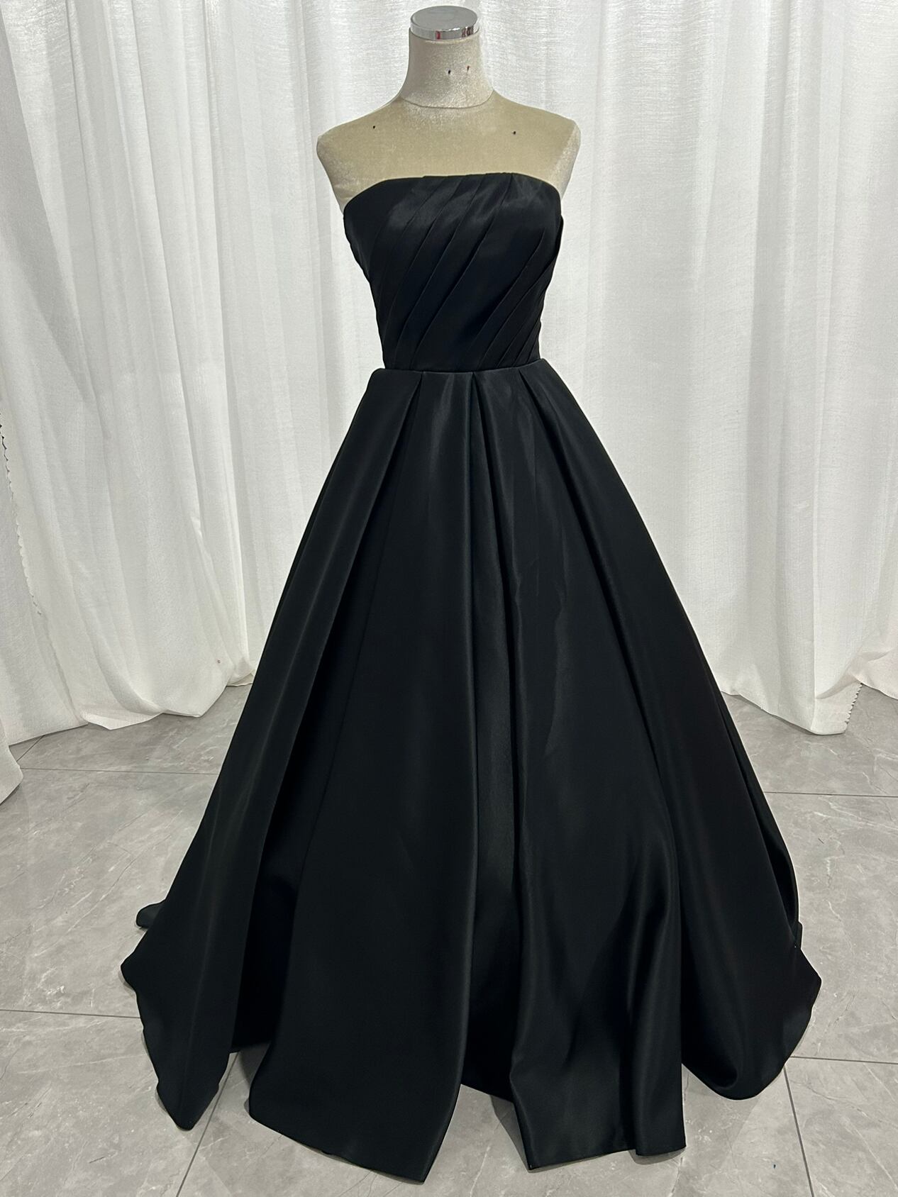 パーティードレス ブラック ベアトップ ハンドドレープ Aライン 光沢サテン 謝恩会 編み上げ