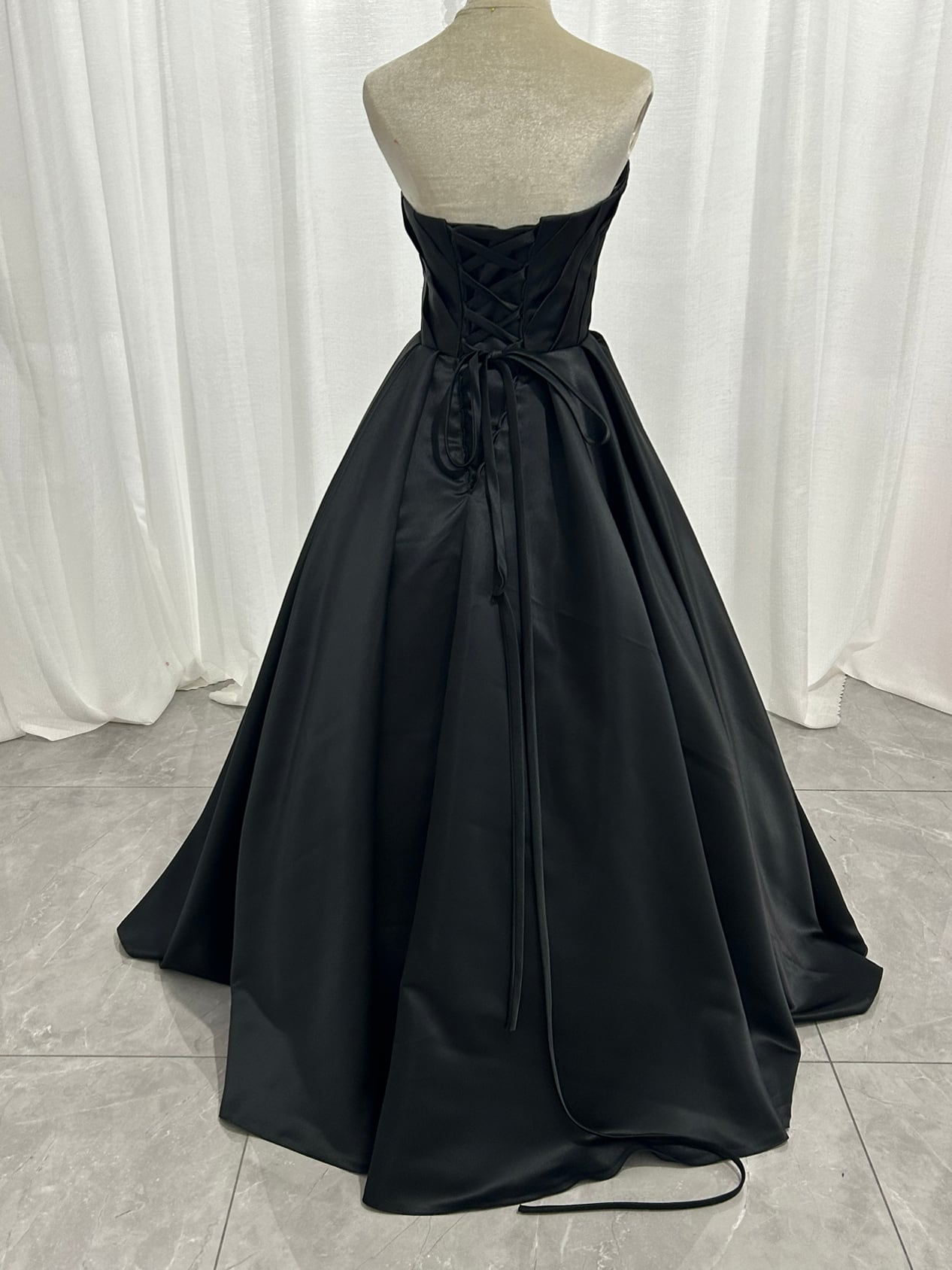 パーティードレス ブラック ベアトップ ハンドドレープ 柔らかく重ねたチュールスカート 取り外し 謝恩会 編み上げ
