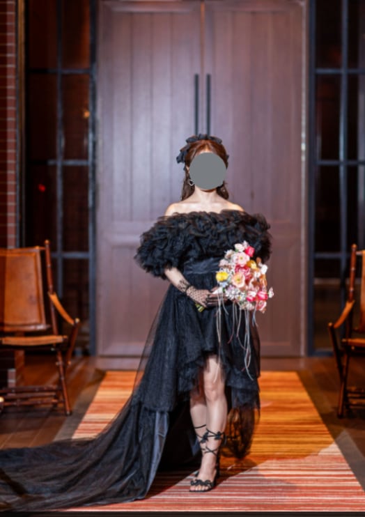 実例写真!カラードレス ブラック ハイローカット オフショルダー フィッシュテール チュールスカート ロングトレーン