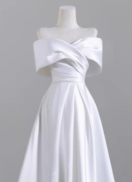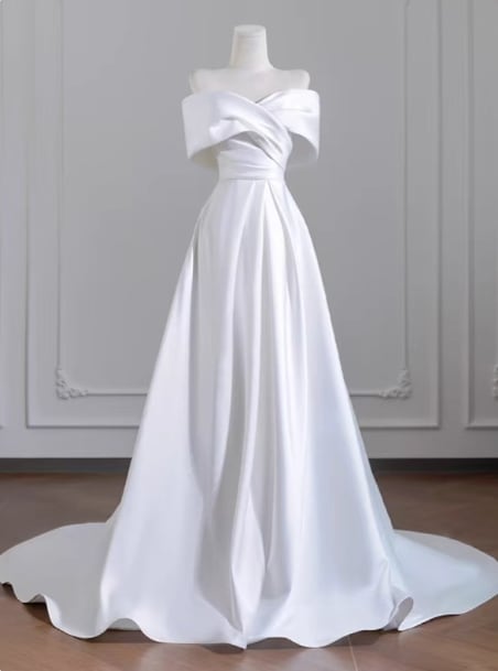 ウェディングドレス オフショルダー 光沢サテン Aライン ロングトレーン エレガント 結婚式
