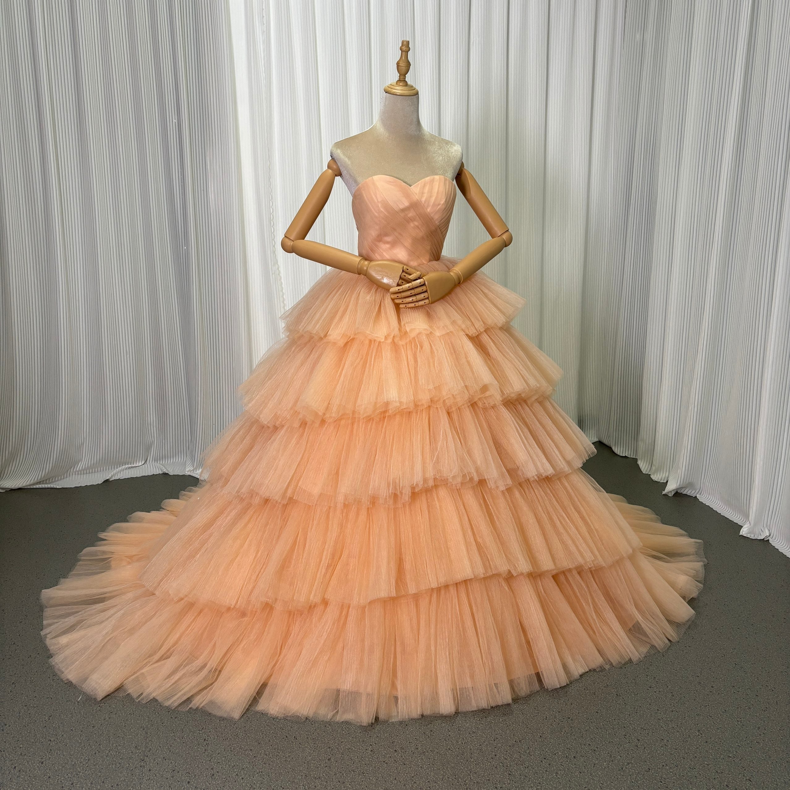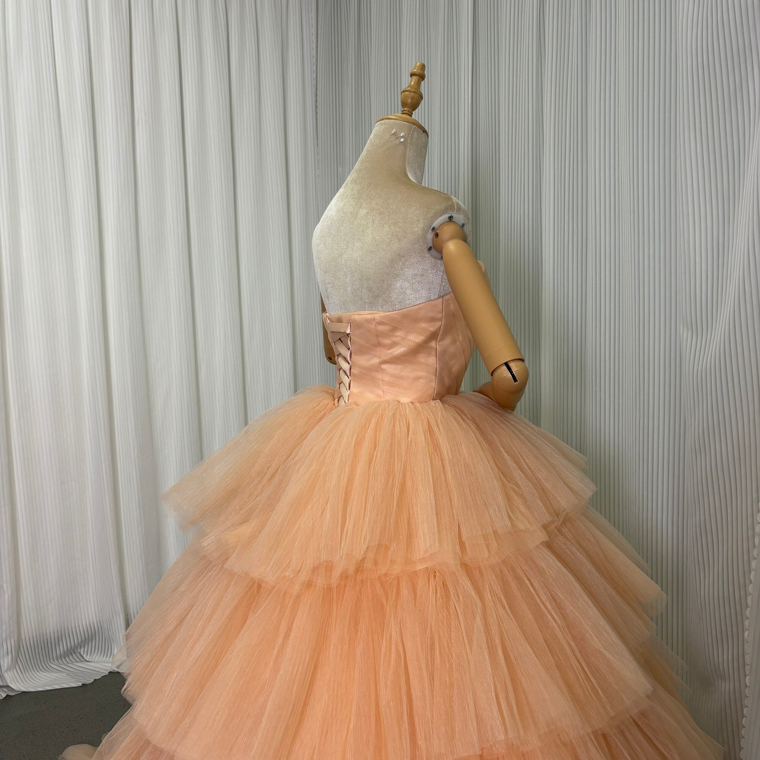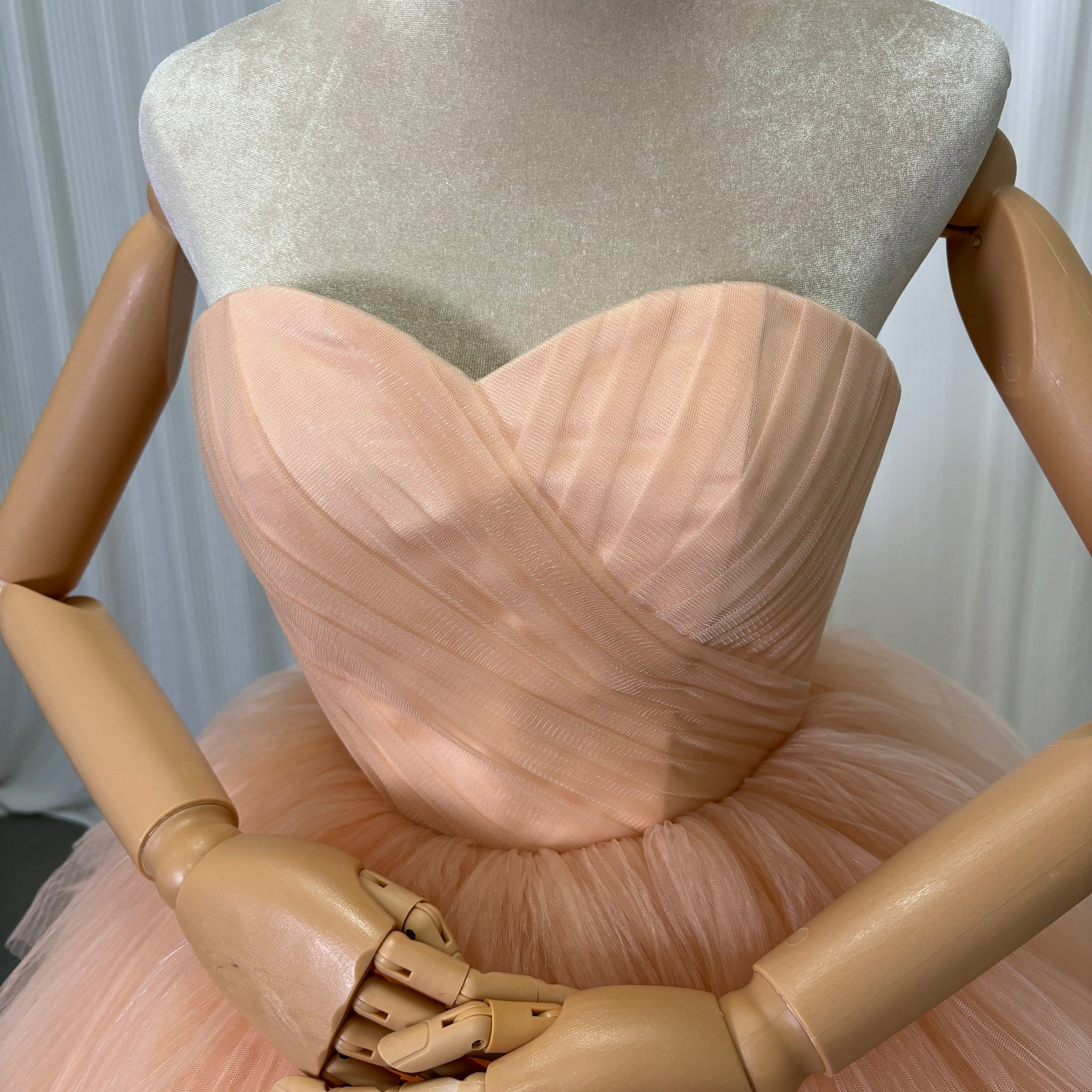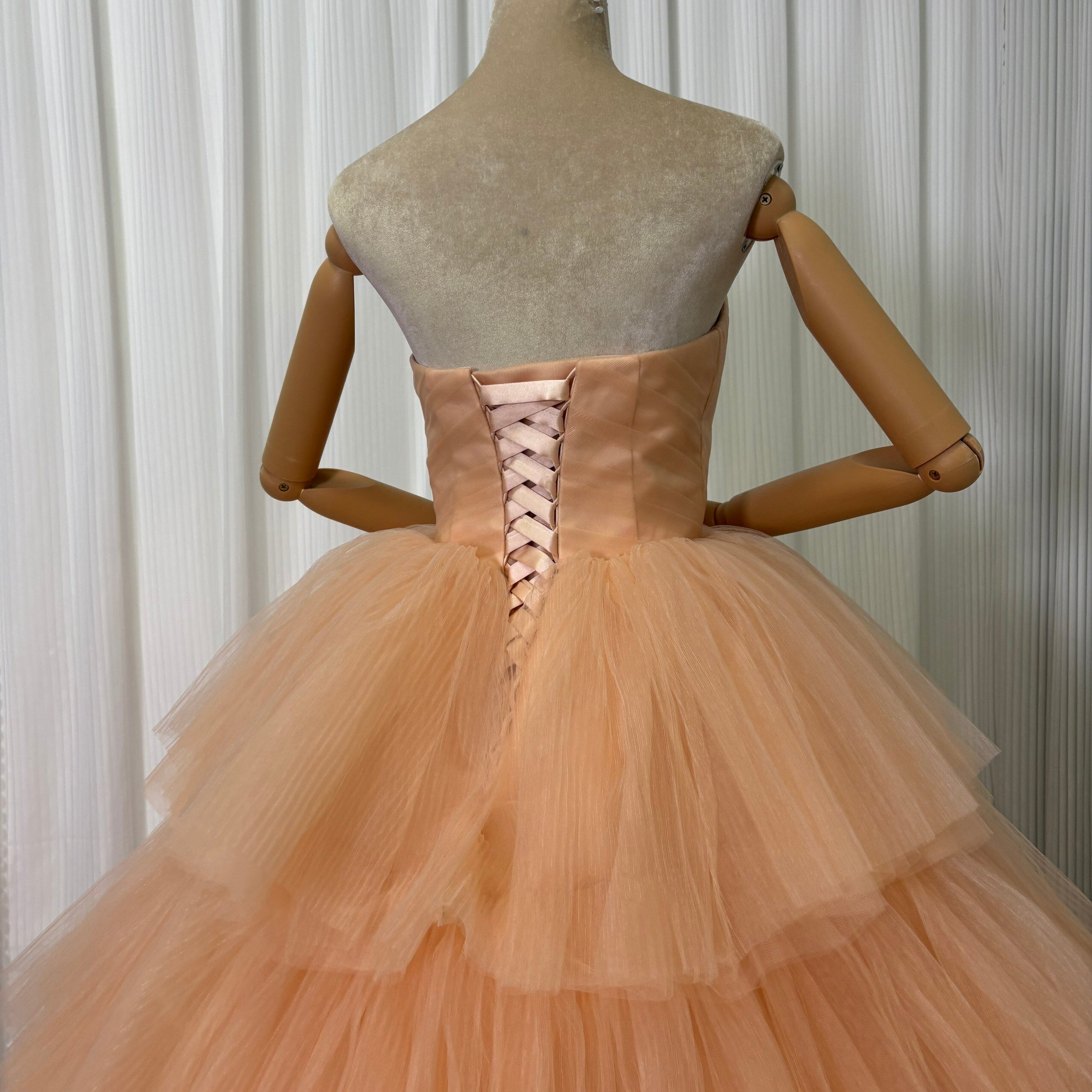 上品!カラードレス オレンジ ベアトップ 柔らかく重ねたチュールスカート 大人っぽい 編み上げ 披露宴