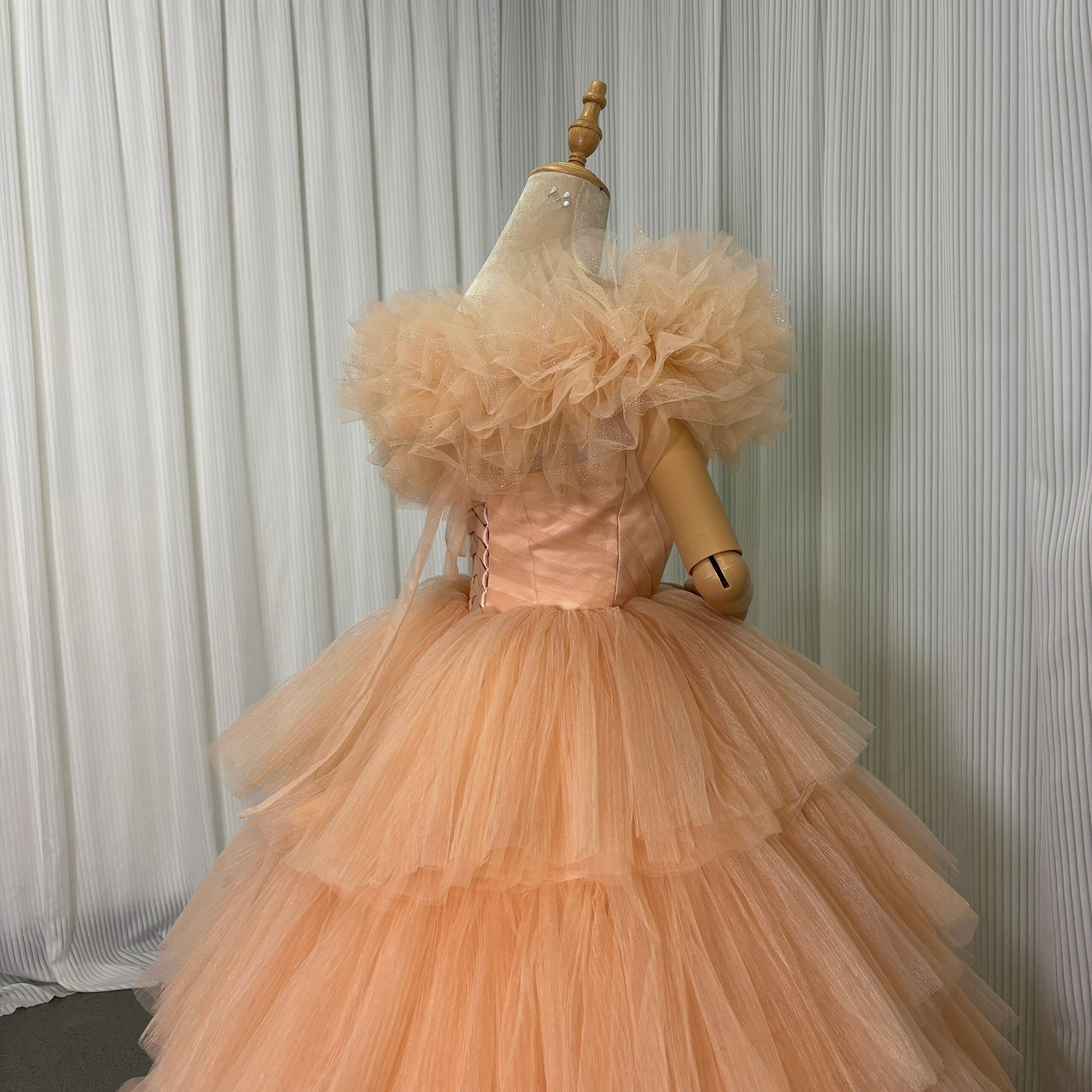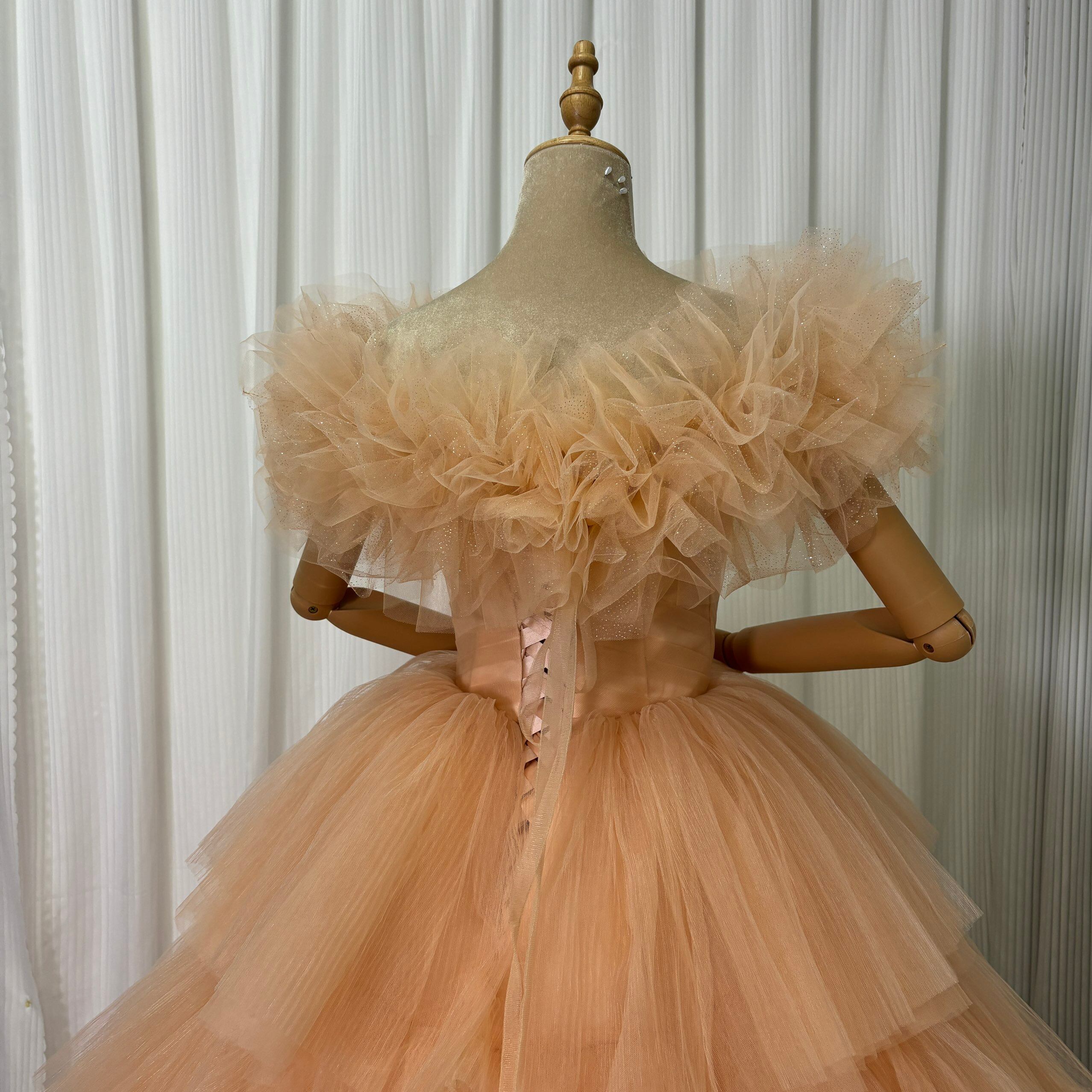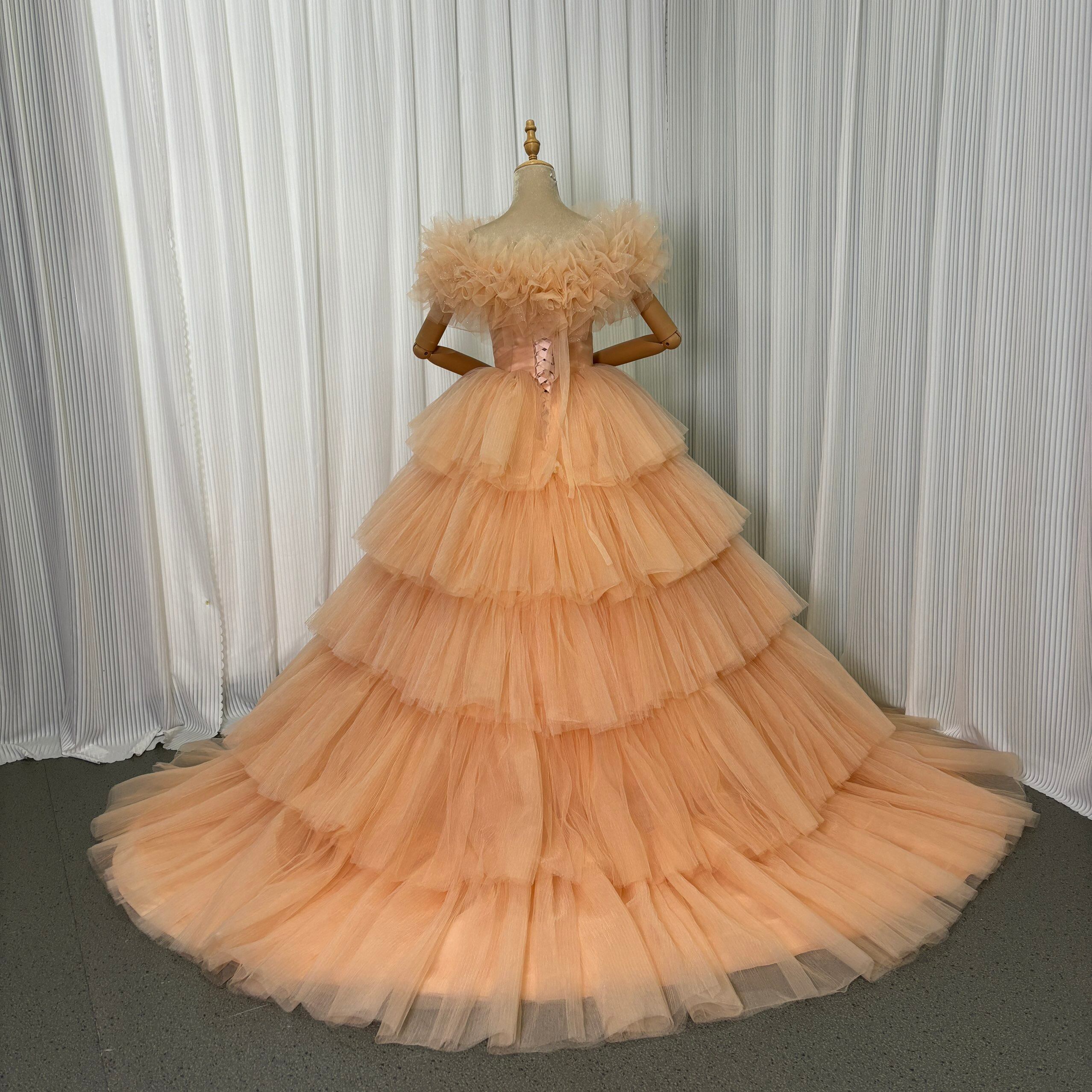 豪華!カラードレス オレンジ 取り外しオフショルダー 柔らかく重ねたチュールスカート 大人っぽい 編み上げ 披露宴