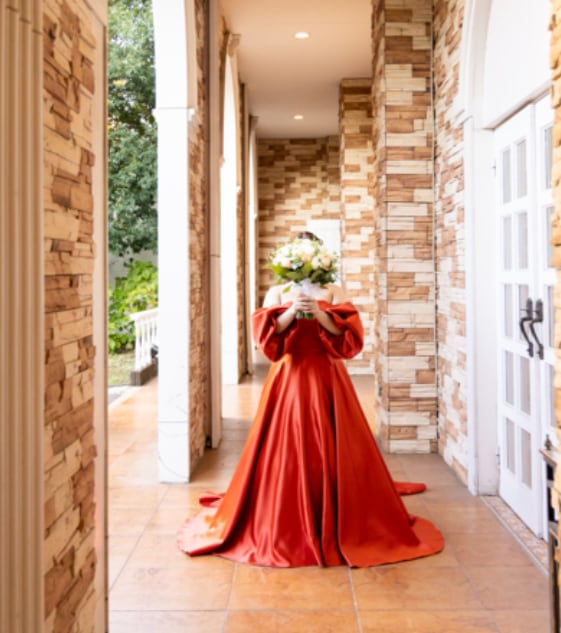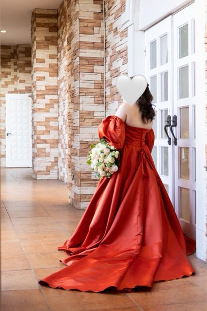 カラードレス オレンジ 光沢サテン ベアトップ パフスリーブ ロングトレーン 編み上げ 前撮り