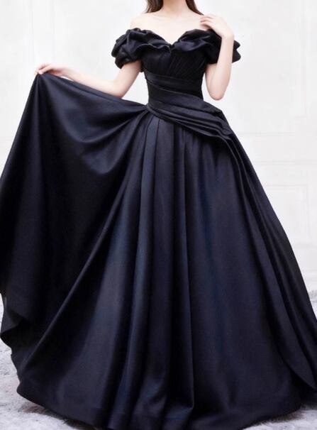 パーティードレス ブラック オフショルダー ハンドドレープ 光沢サテン デザイン感 クラシカル 披露宴