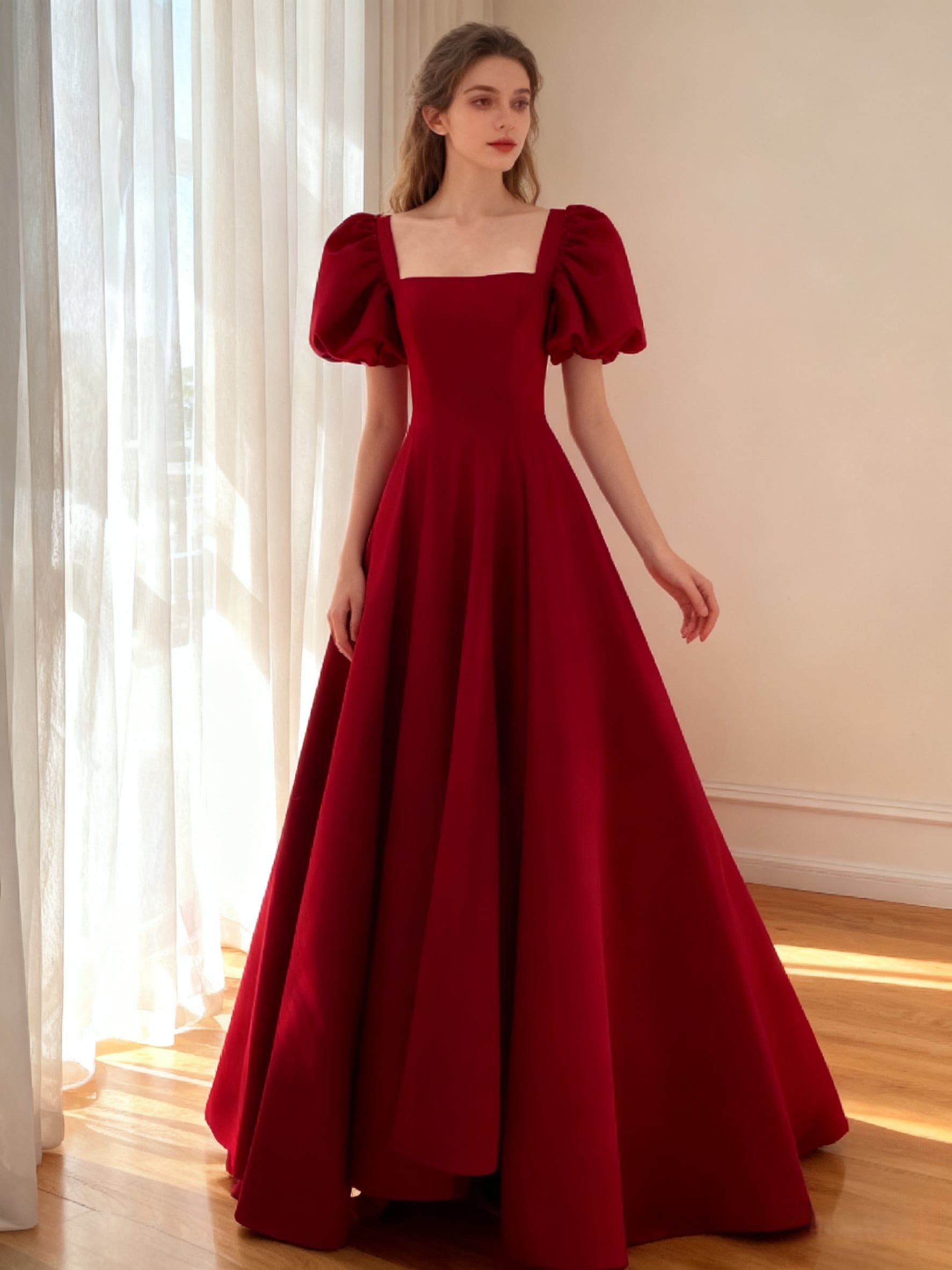 カラードレス ボルドー色 スクエアネック パフスリーブ 優雅なシルエット 披露宴