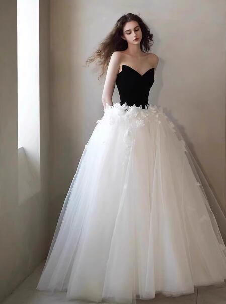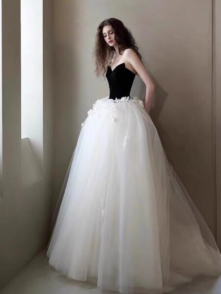 ウエディングドレス ブラック ベアトップ プリンセスライン 花モチーフ ミニトレーン 大人っぽい 結婚式