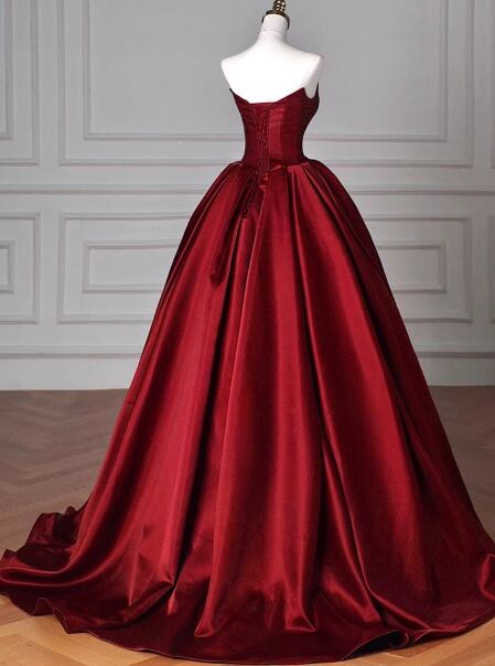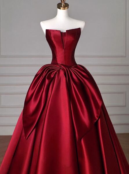 カラードレス ワインレッド 光沢サテン ベアトップ Aライン ハンドドレープ 編み上げ 披露宴