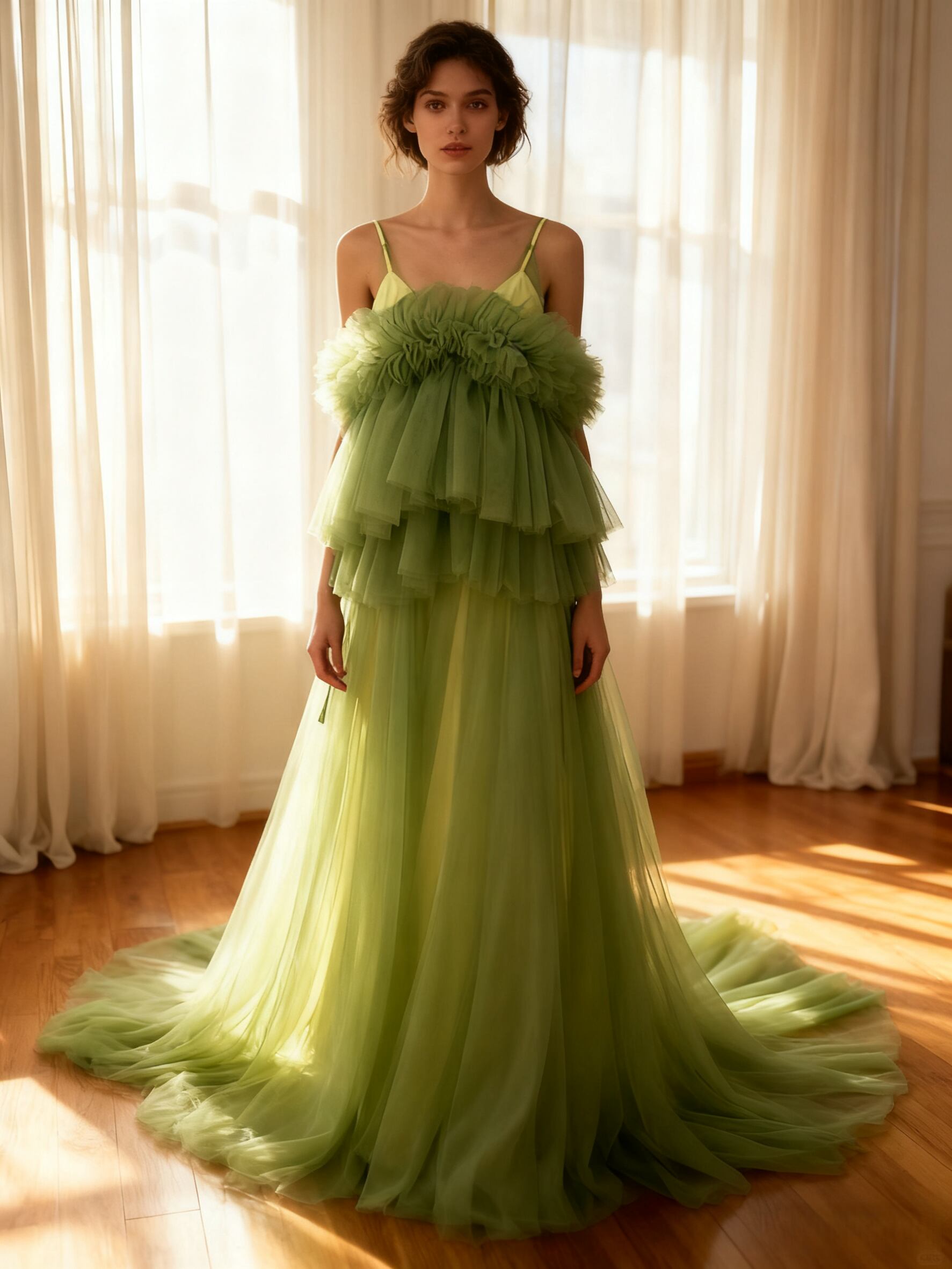パーティードレス グリーン ソフトチュール ツーピース イエロー キャミソール マタニティ 抜群のおしゃれ見え 前撮り