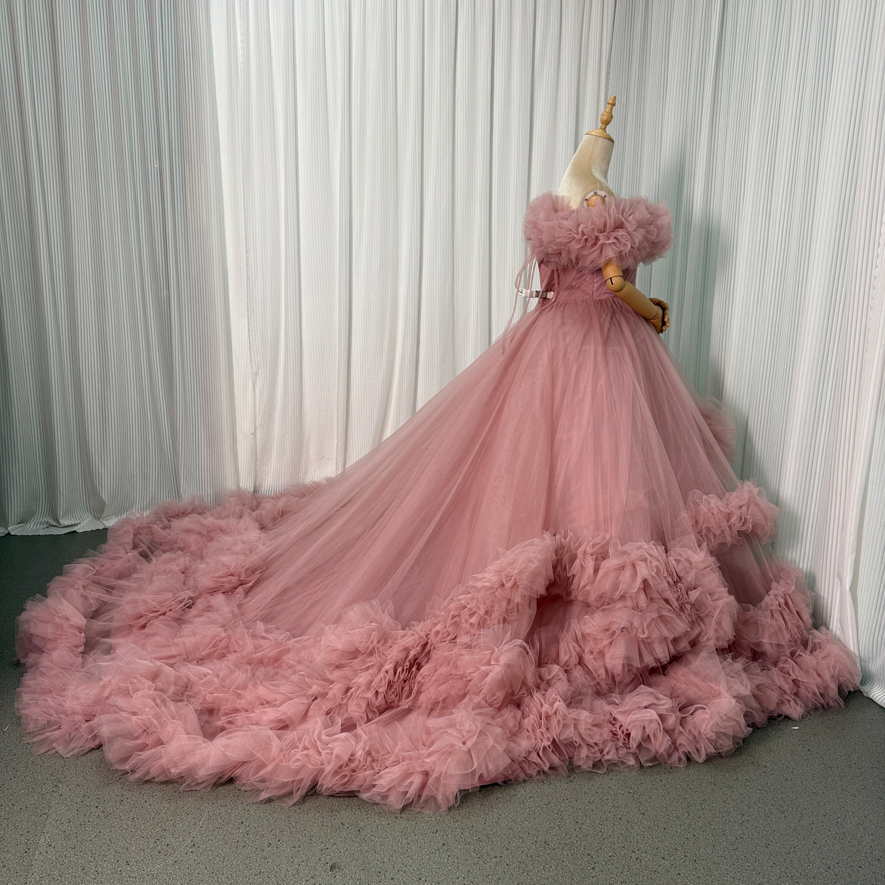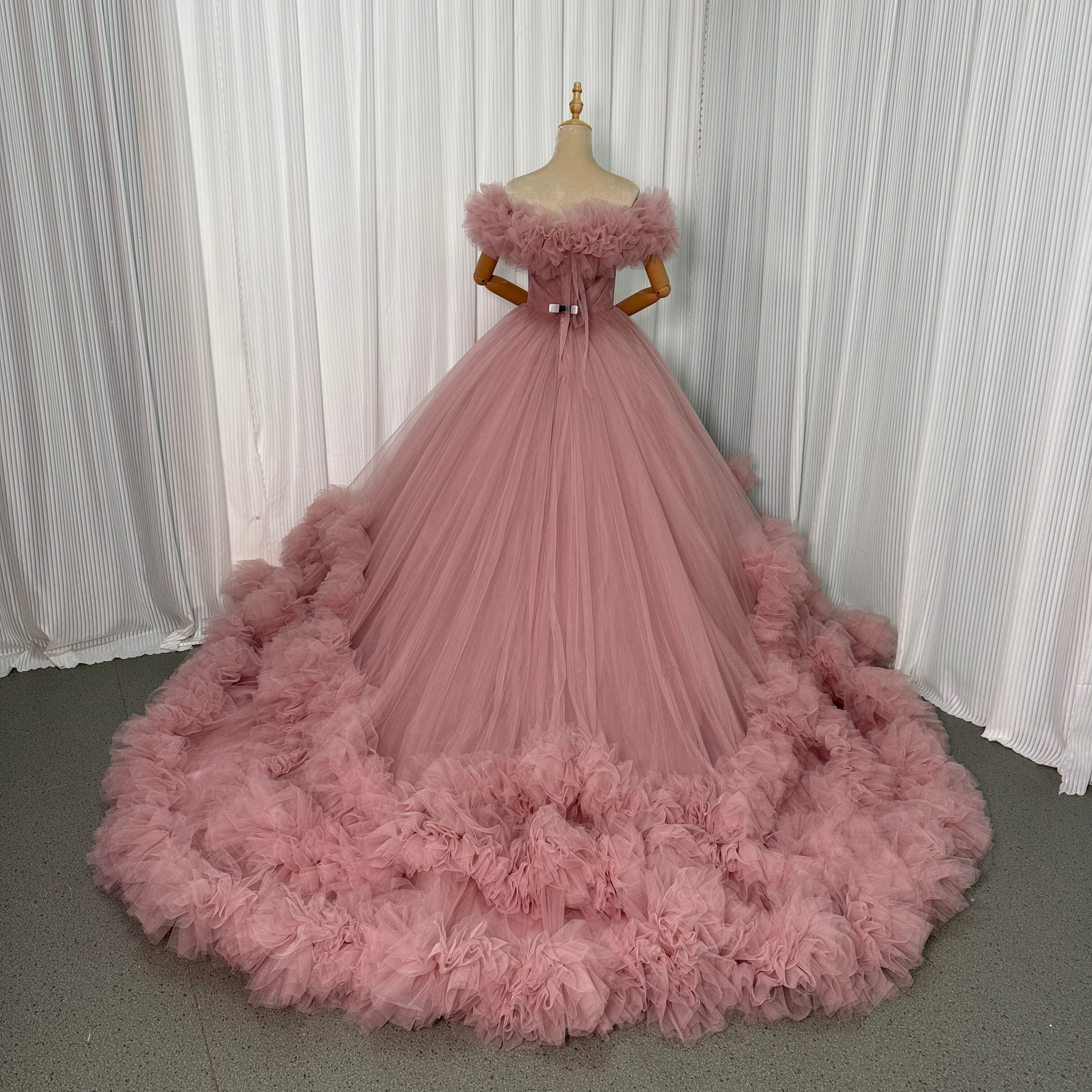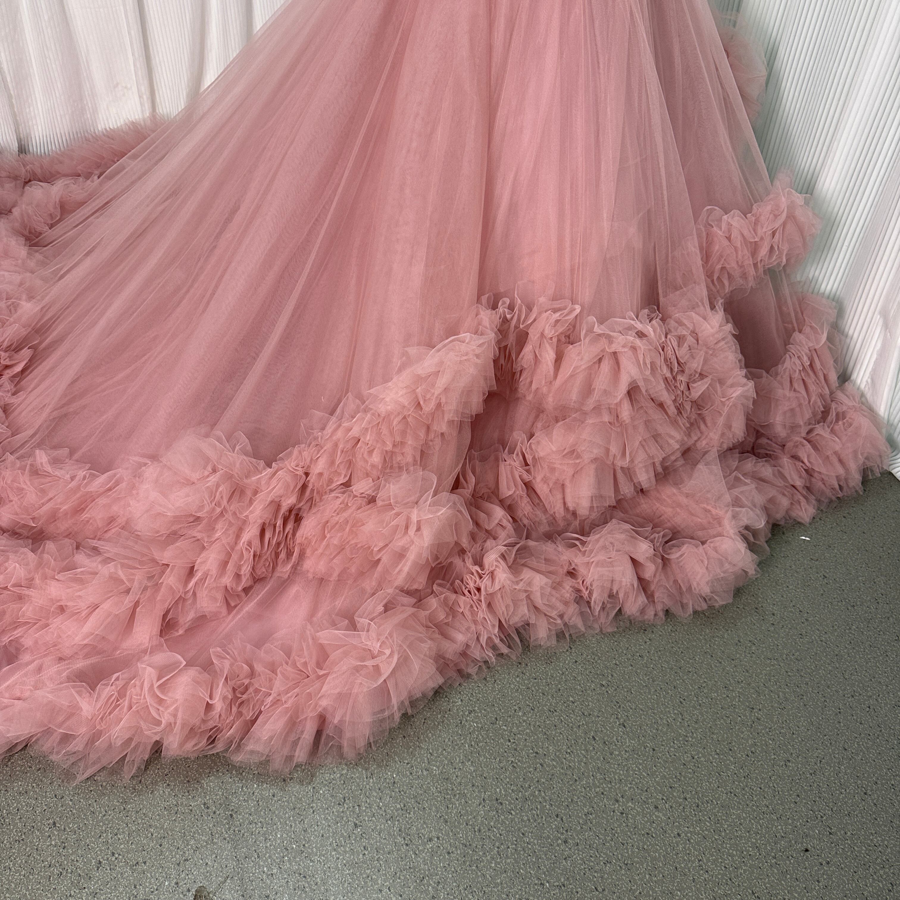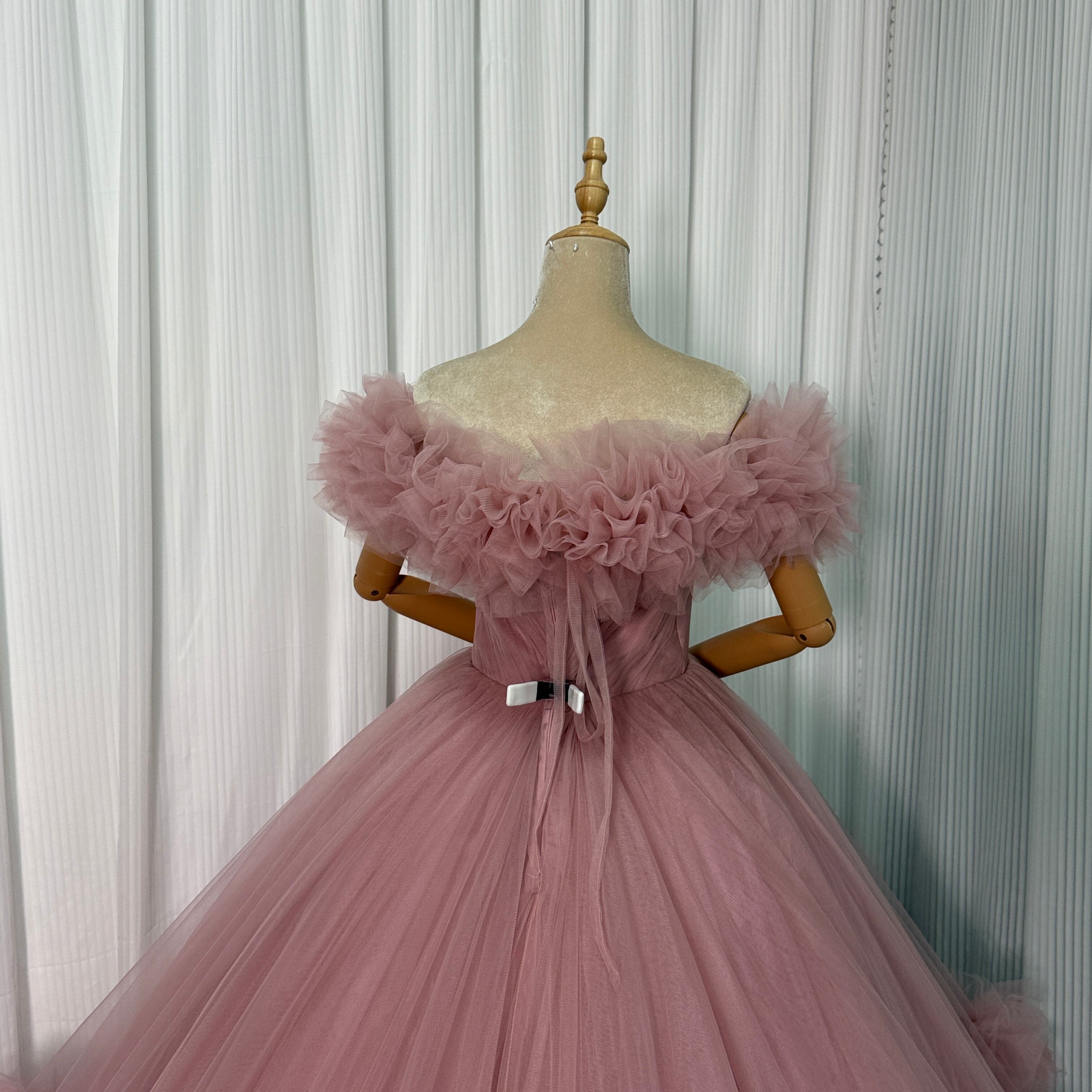 人気上昇!カラードレス ピンク 取り外しオフショルダー ラッフルフリル 華やかなトレーン 前撮り