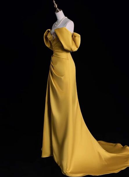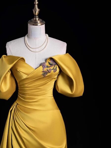 カラードレス イエロー オフショルダー ドロップショルダー 細見えシルエット 編み上げ 大人っぽい 披露宴