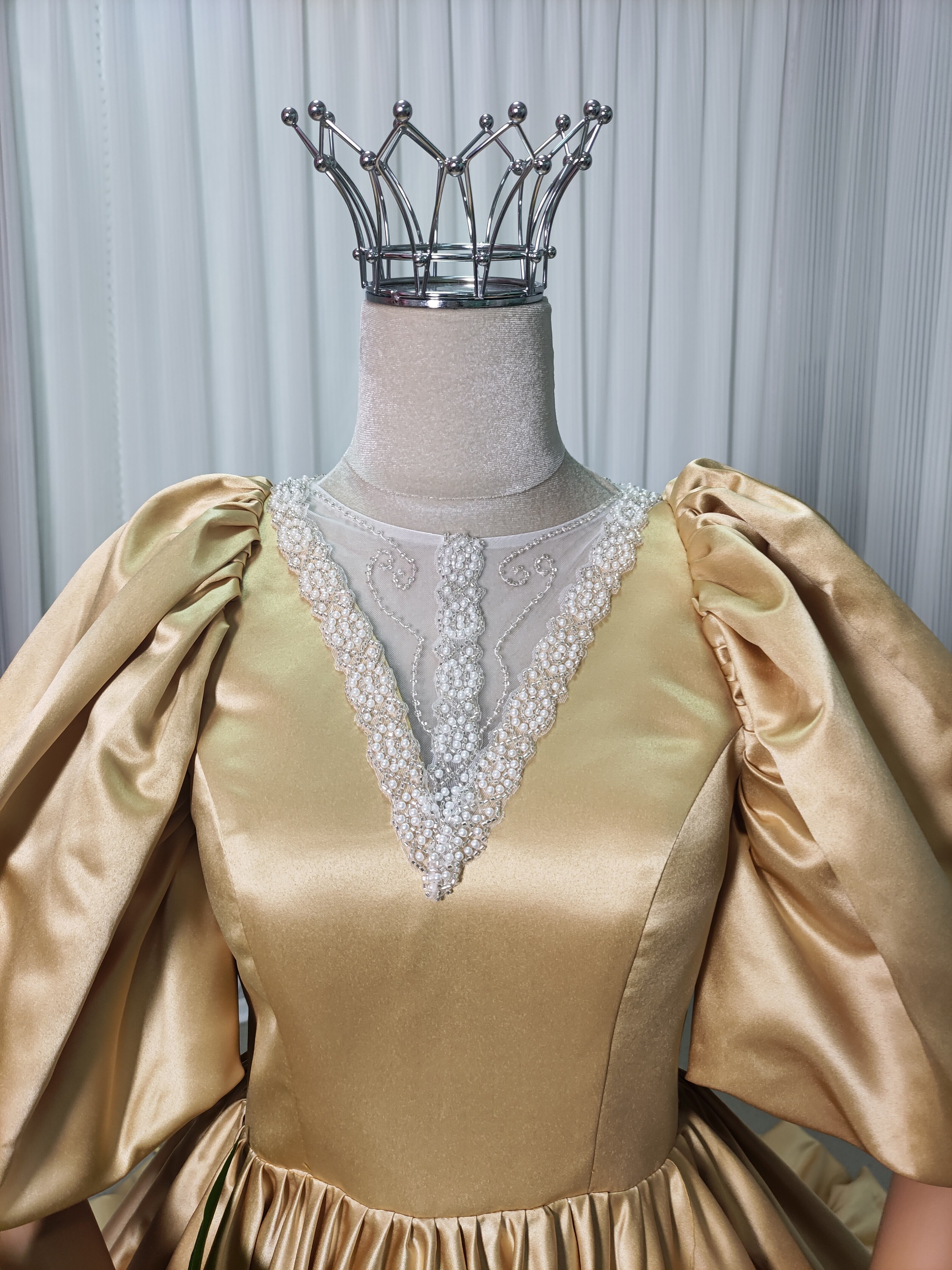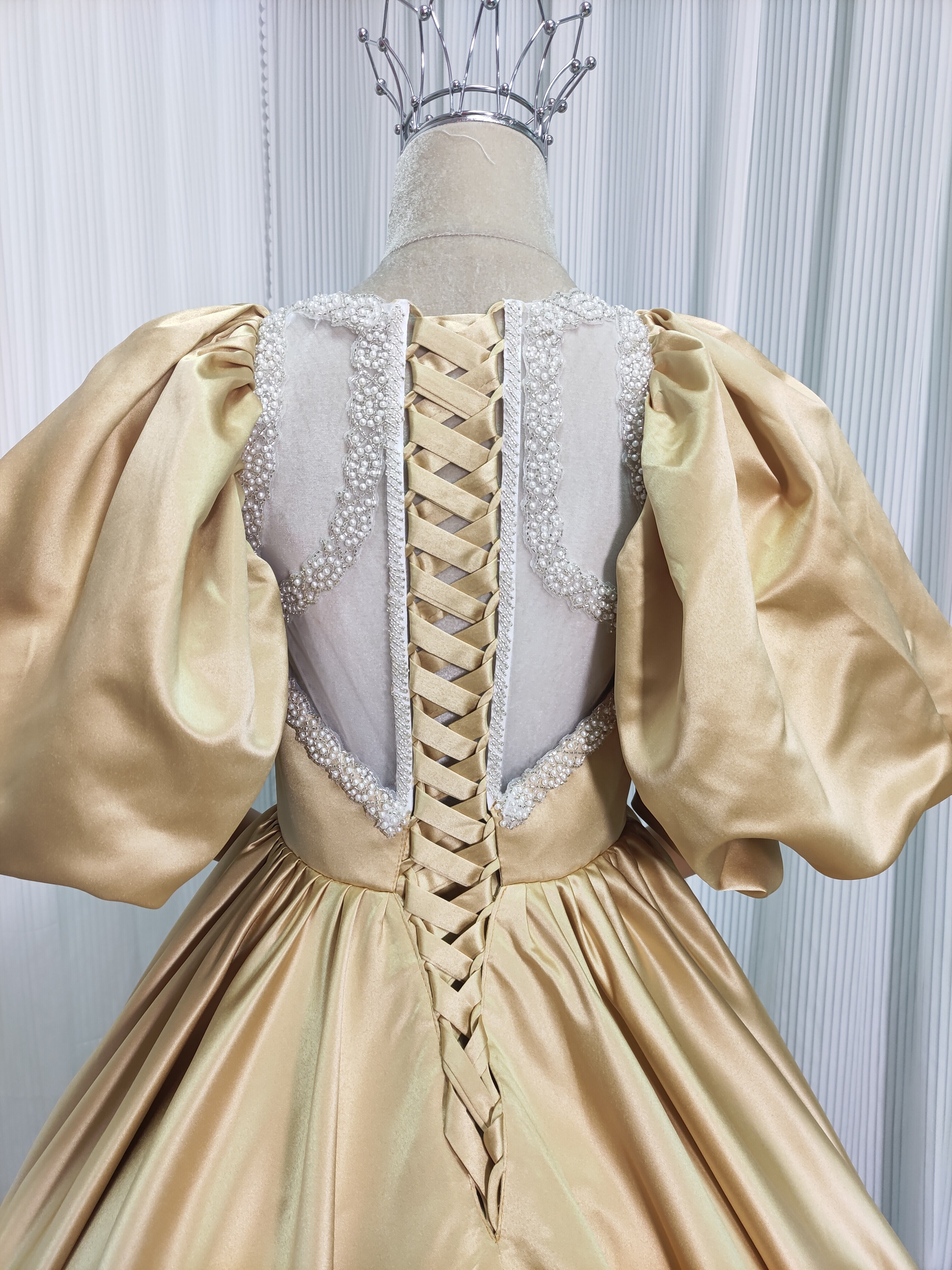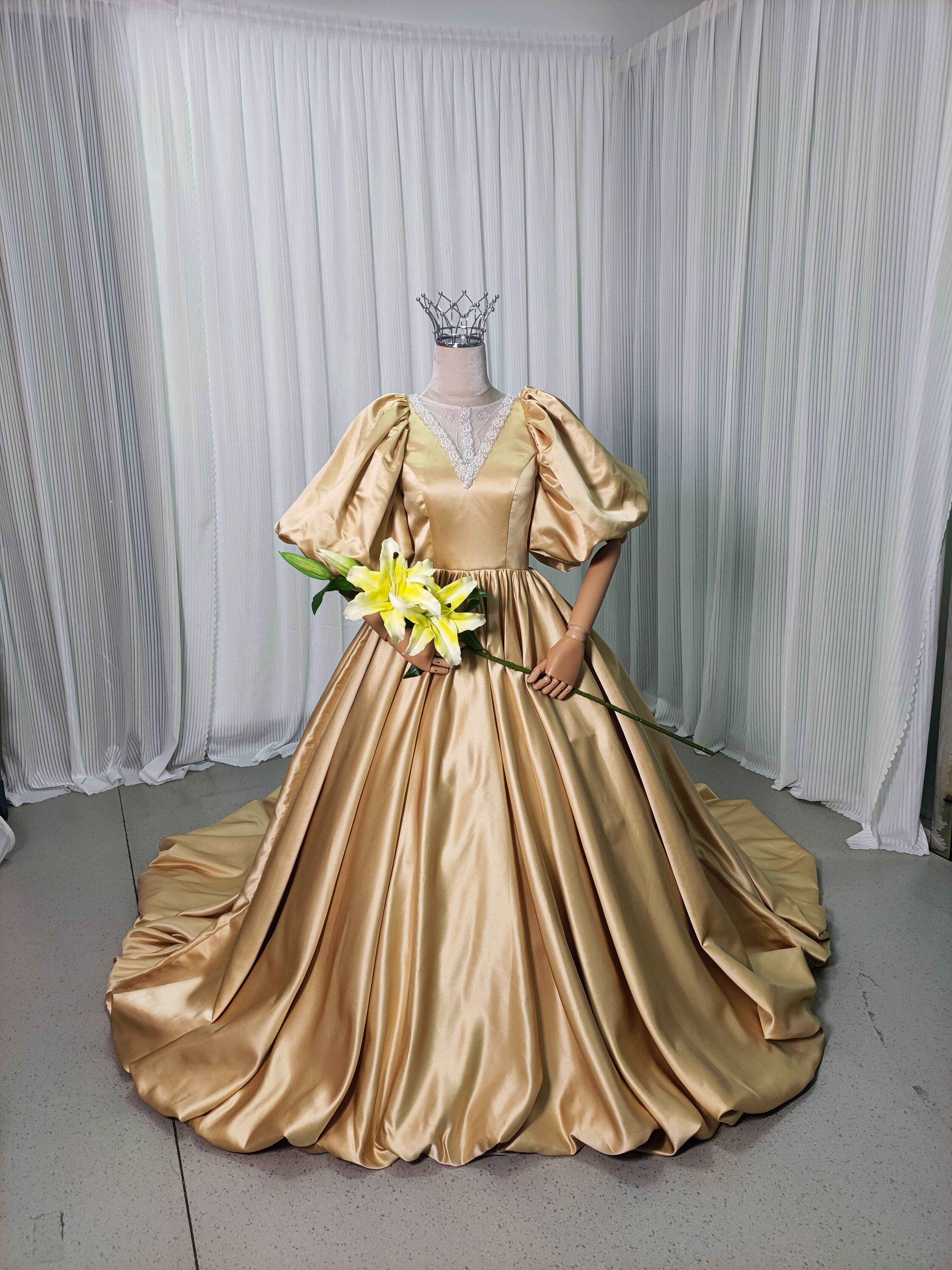 豪華!イエロー カラードレス 光沢サテン ランタンスリーブ ハンドメイド プリンセスライン 編み上げ 披露宴