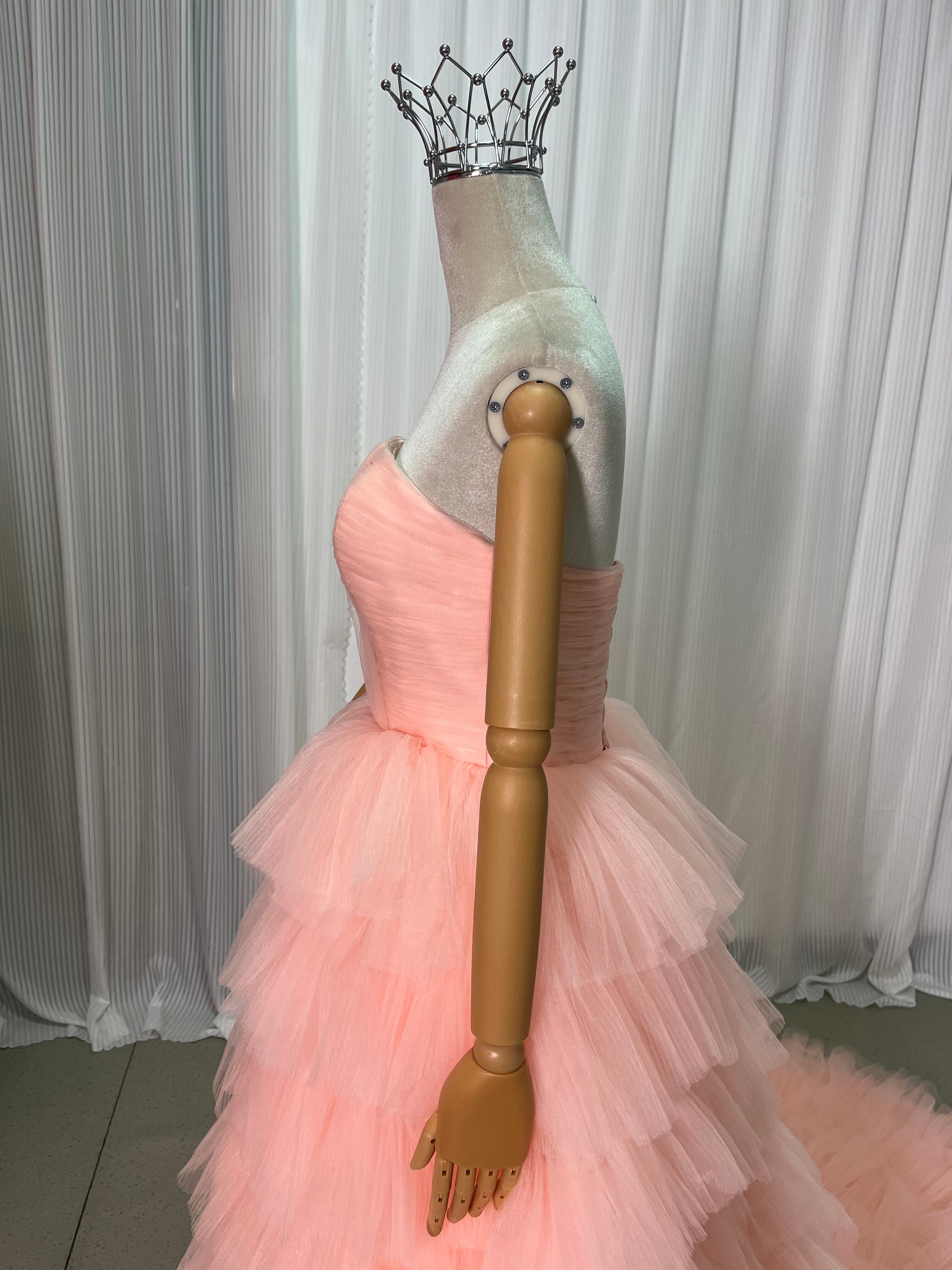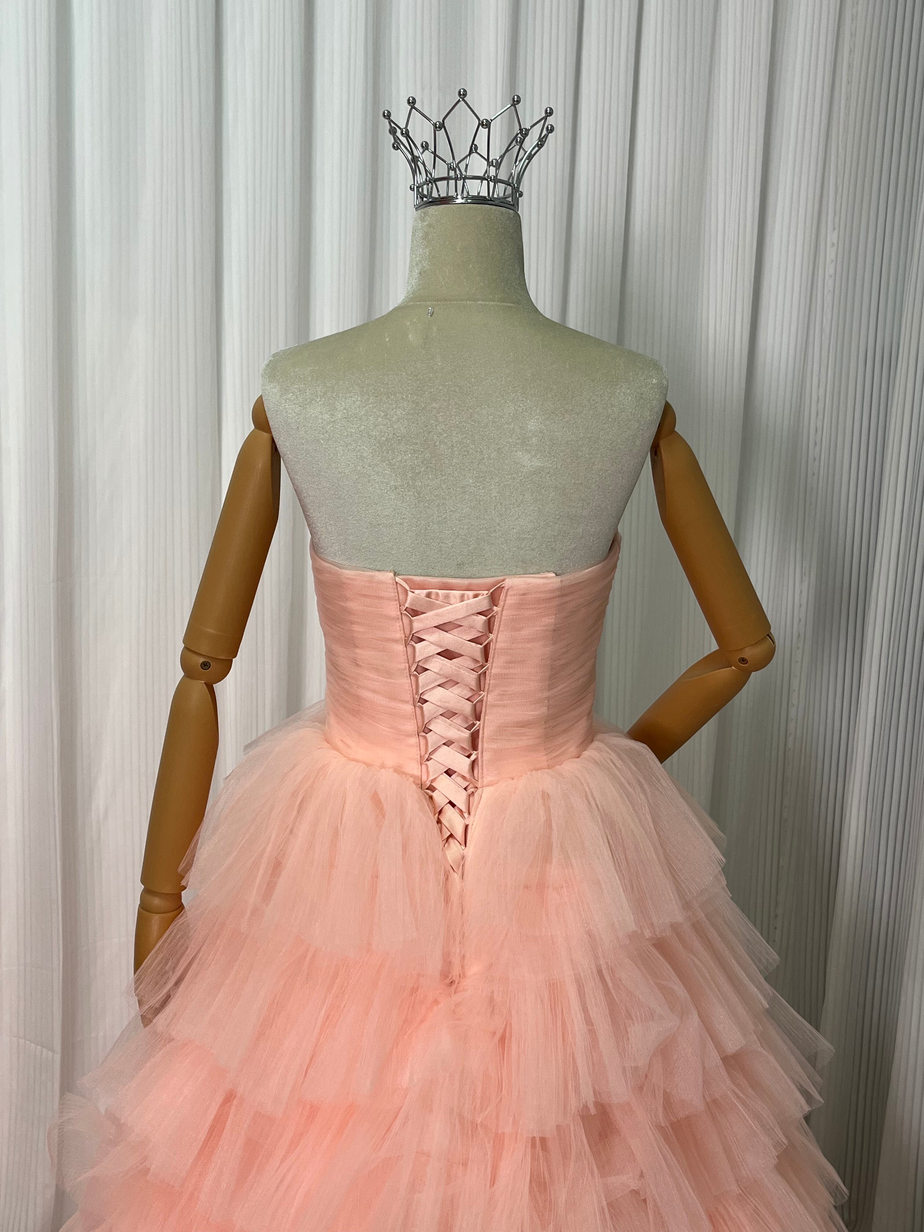 カラードレス ピンク ウエディングドレス ベアトップ 柔らかく重ねたチュールスカート 編み上げ 花嫁 披露宴