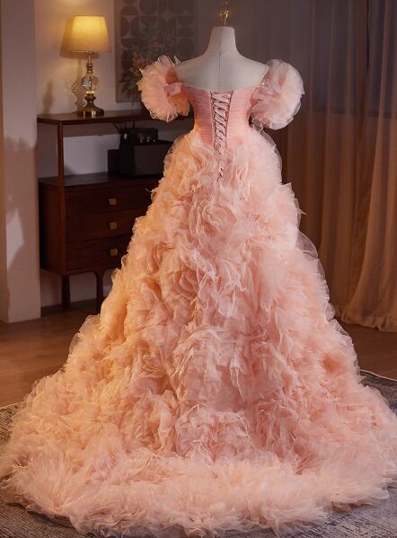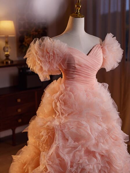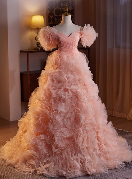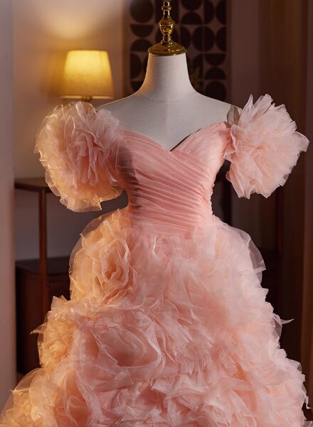 カラードレス ローズピンク ベアトップ フリル袖 フレアスカート ラッフルフリル 可愛い 前撮り