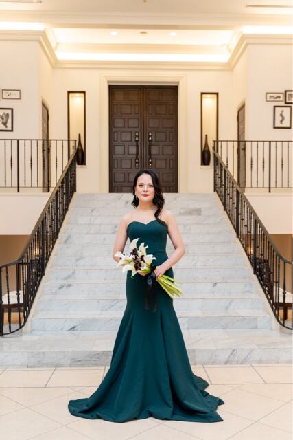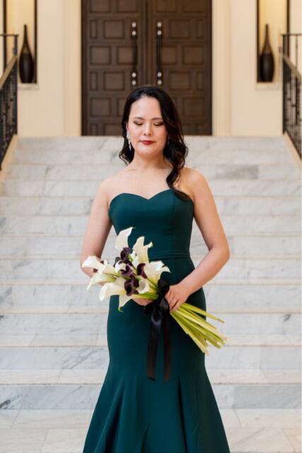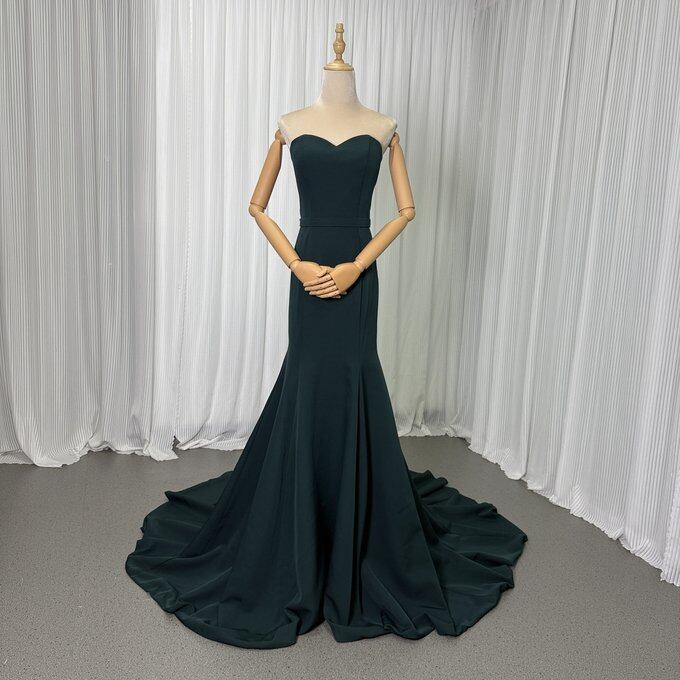 実例写真!深めな緑 カラードレス ベアトップ マーメイドライン クレープ生地 披露宴 前撮り