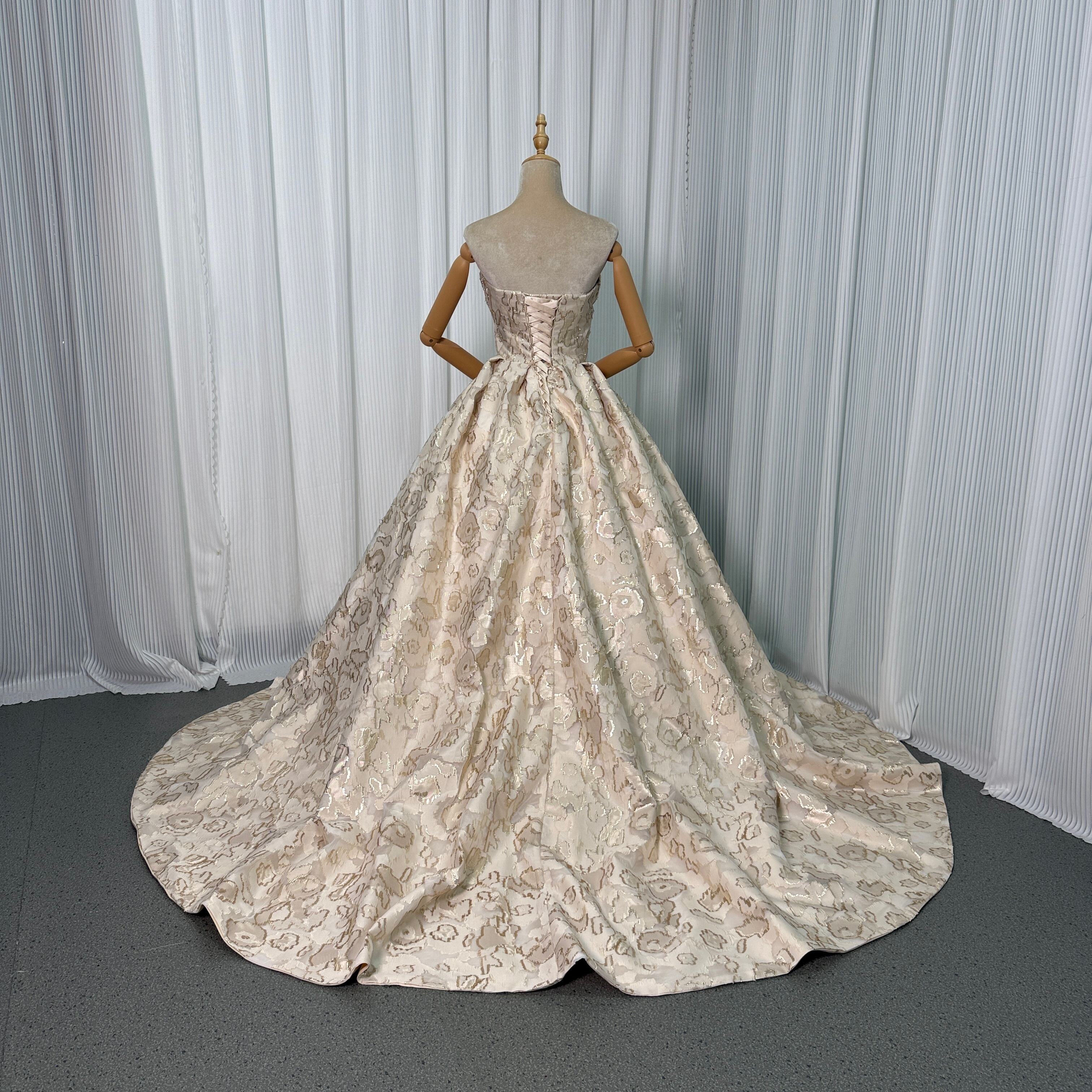 カラードレス シャンパン色 ジャガード生地 ベアトップ プリンセスライン 編み上げ 披露宴