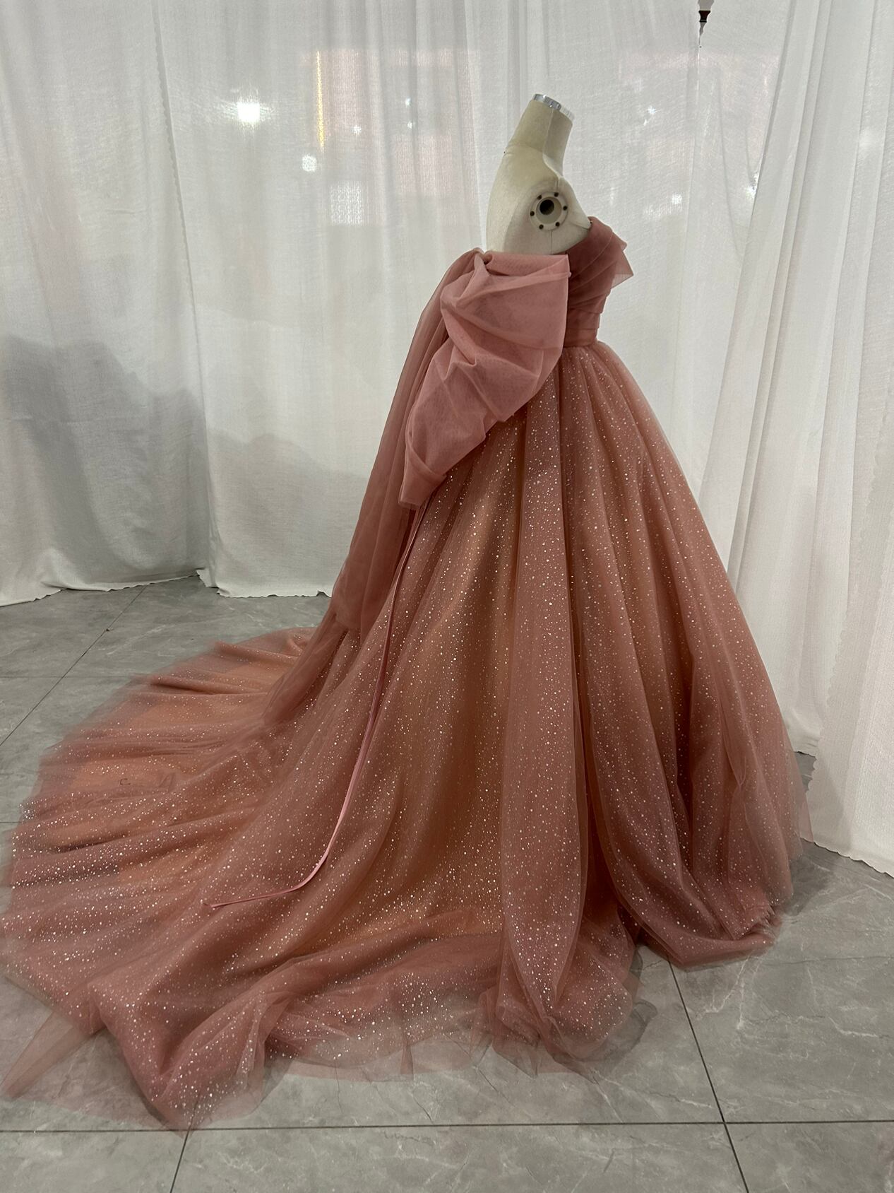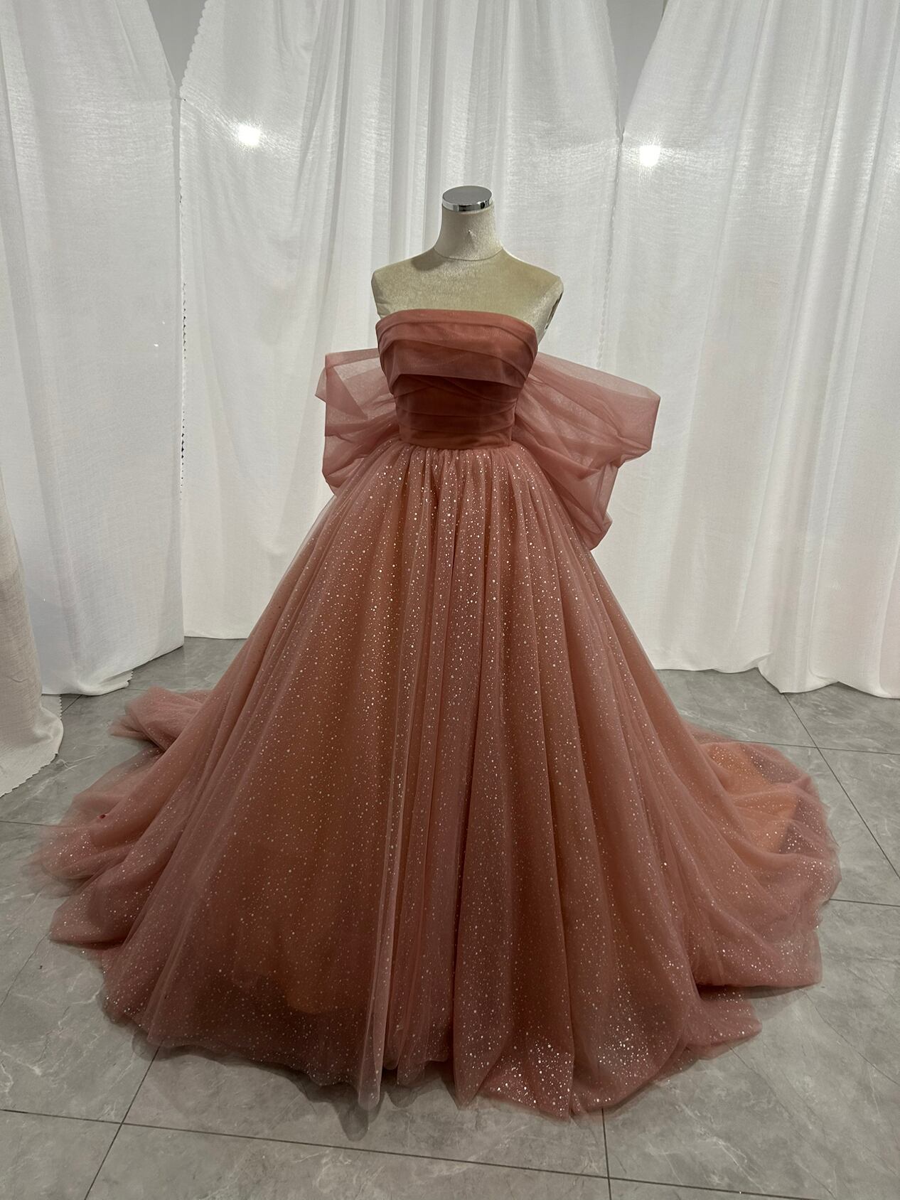 カラードレス くすみピンク キラキラチュール ベアトップ ふっくら柔らかなバックリボン 披露宴