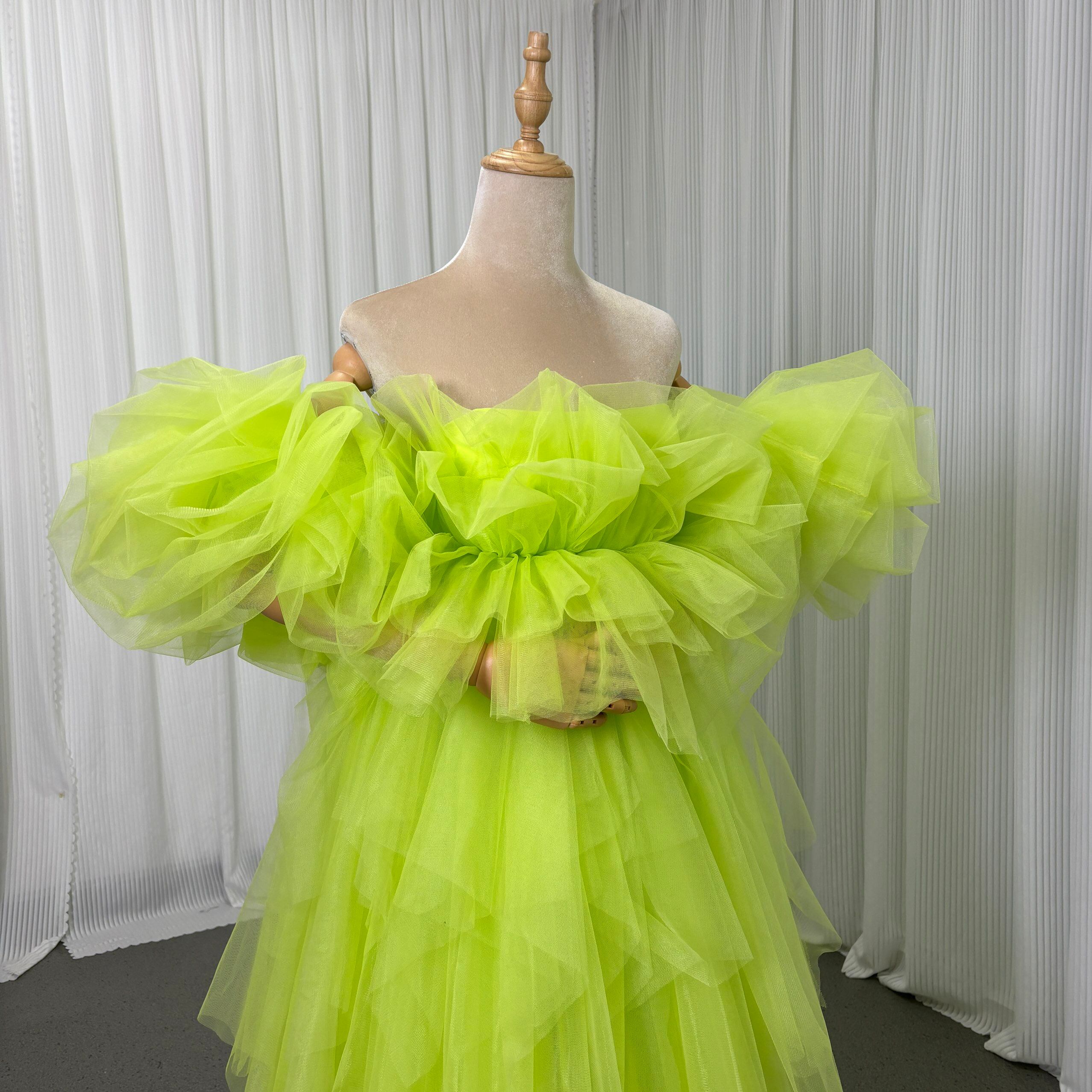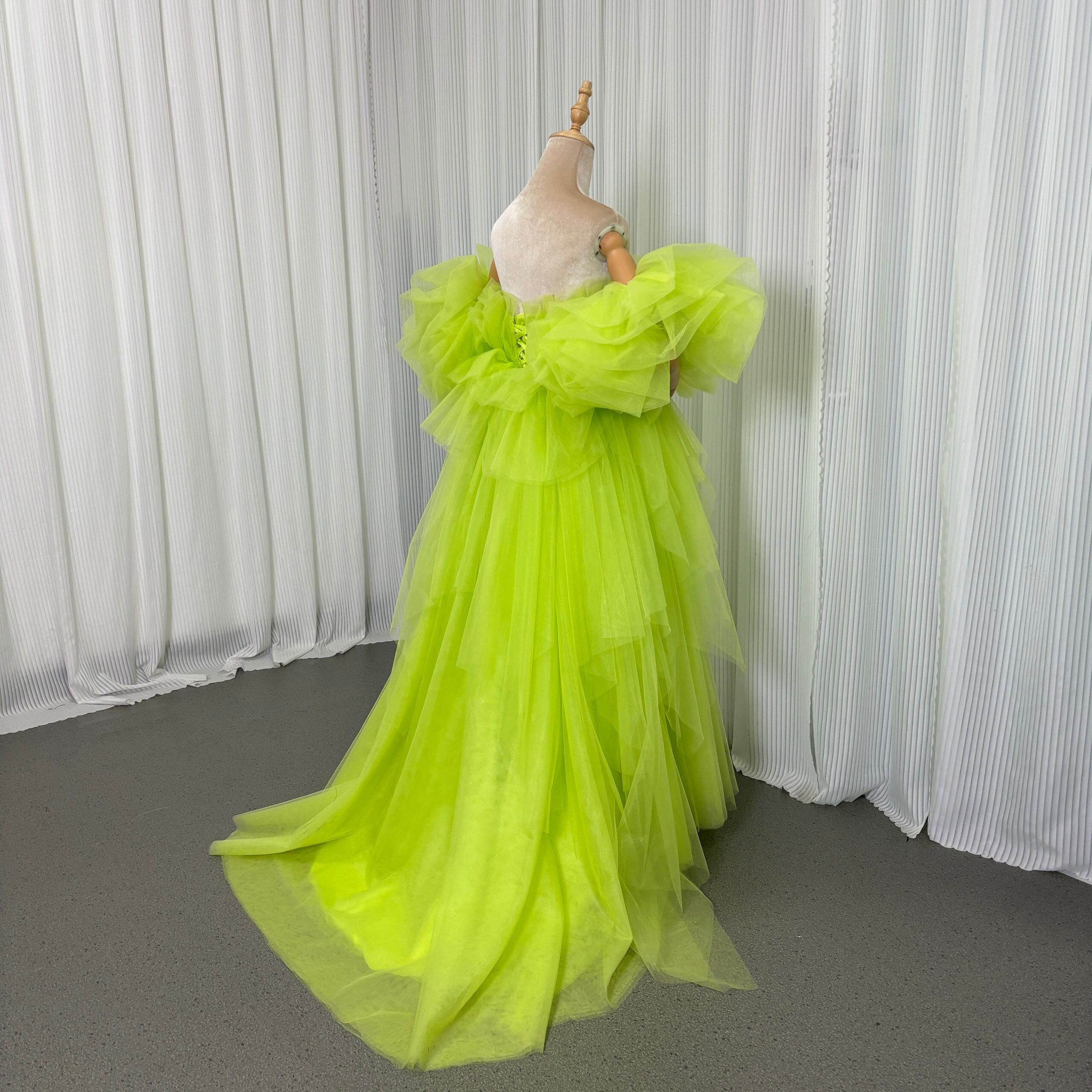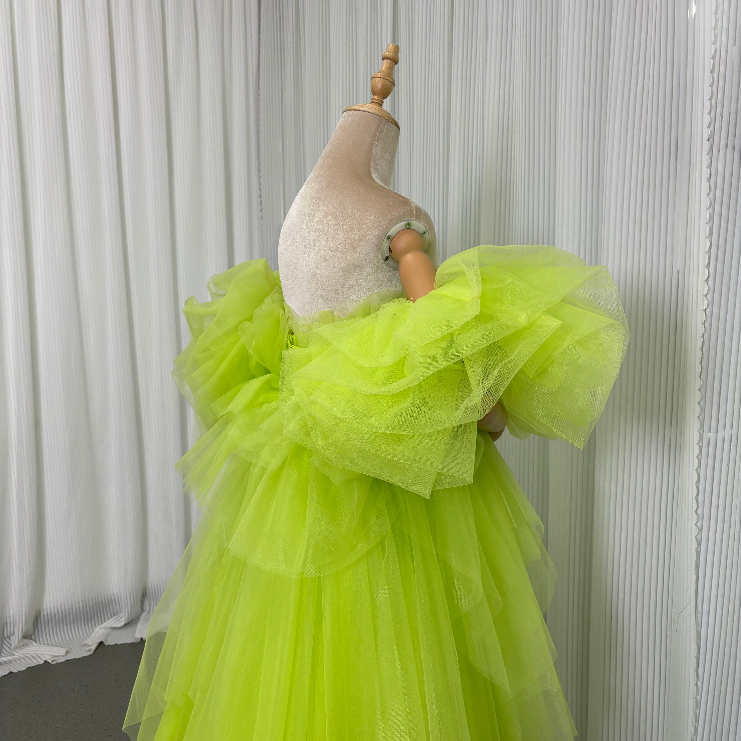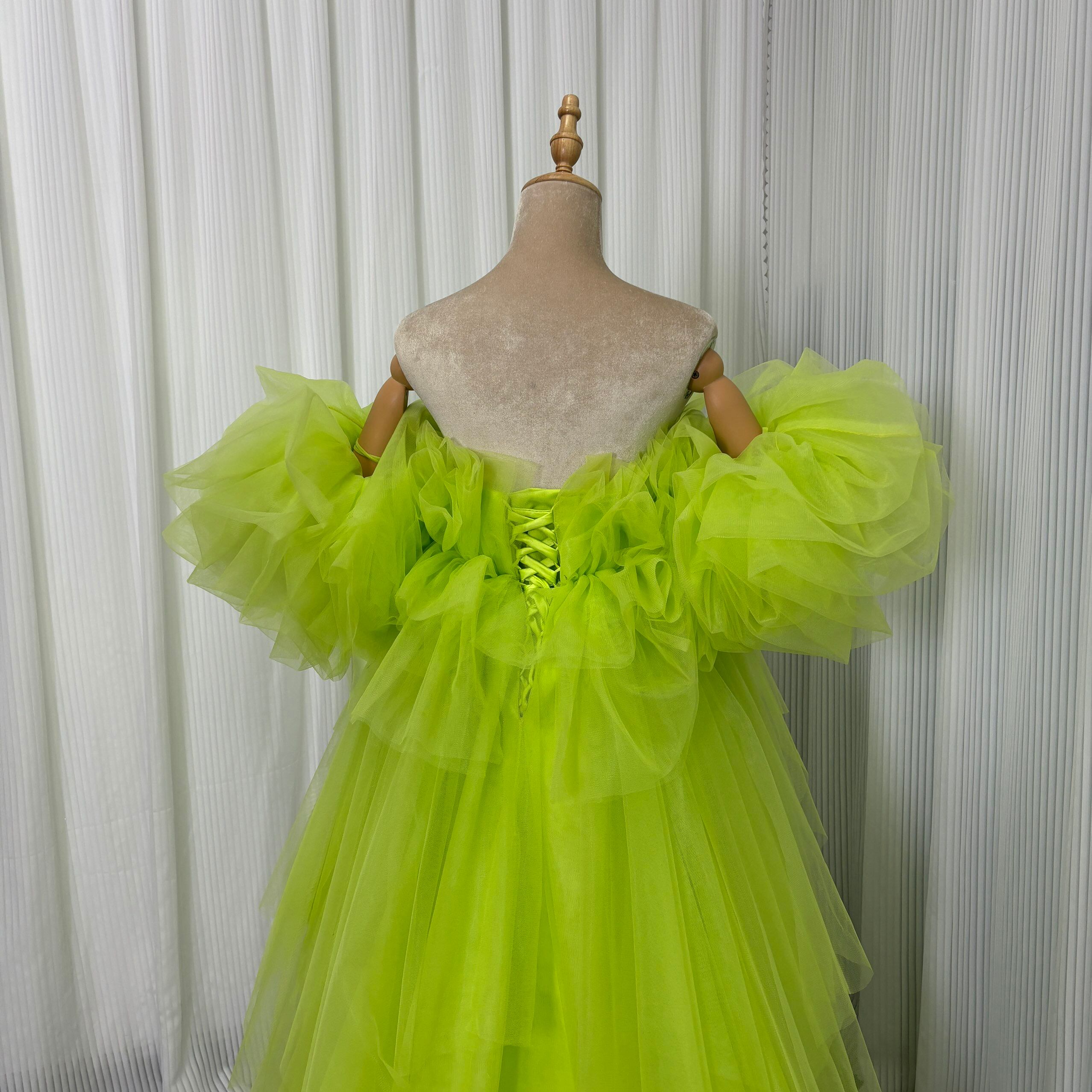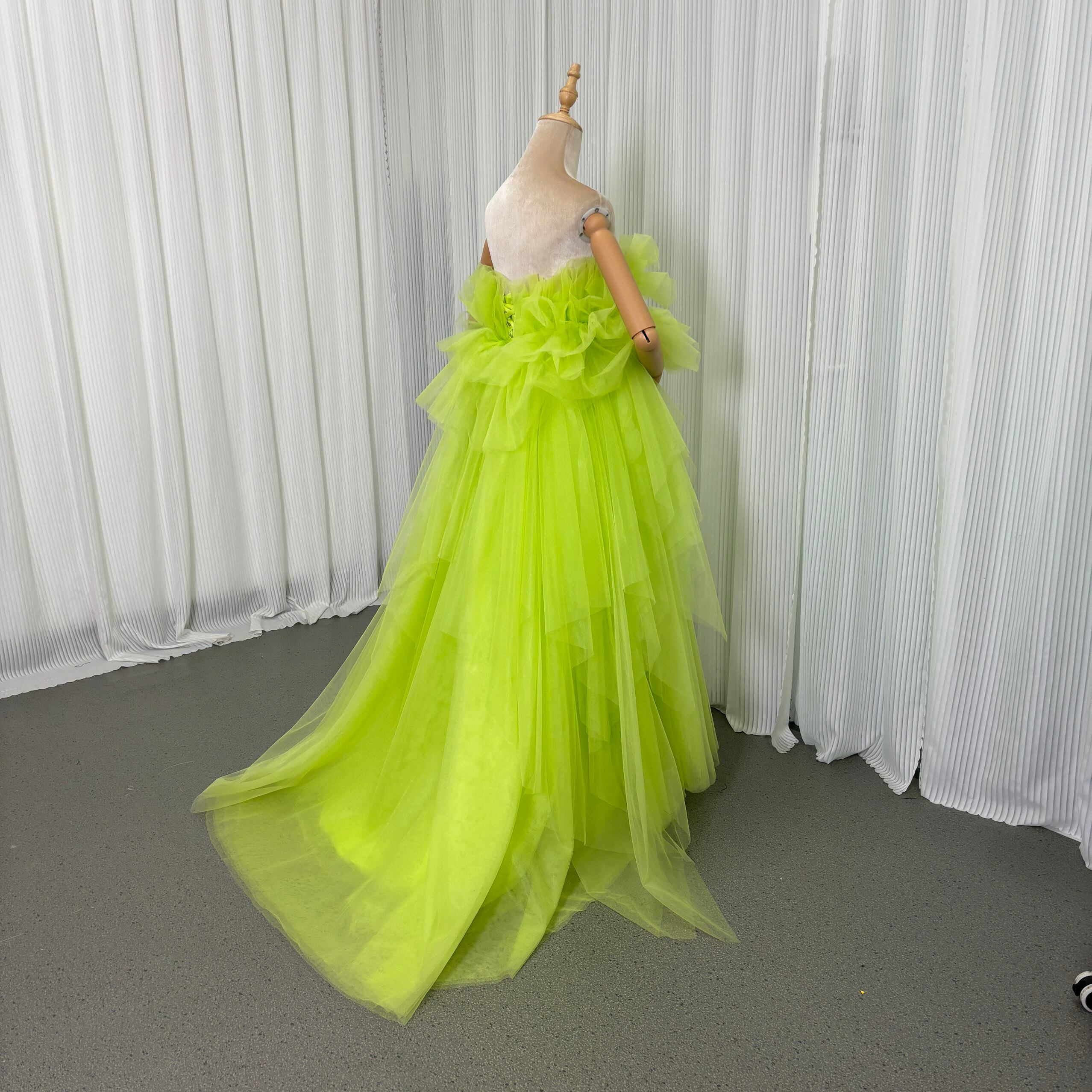 華やか カラードレス ミントグリーン フリル袖 胸元フリル デザイン感 チュールスカート 編み上げ 前撮り