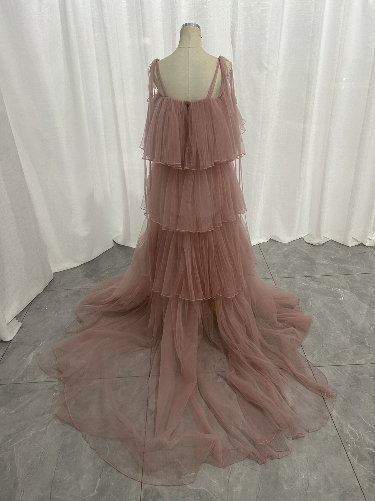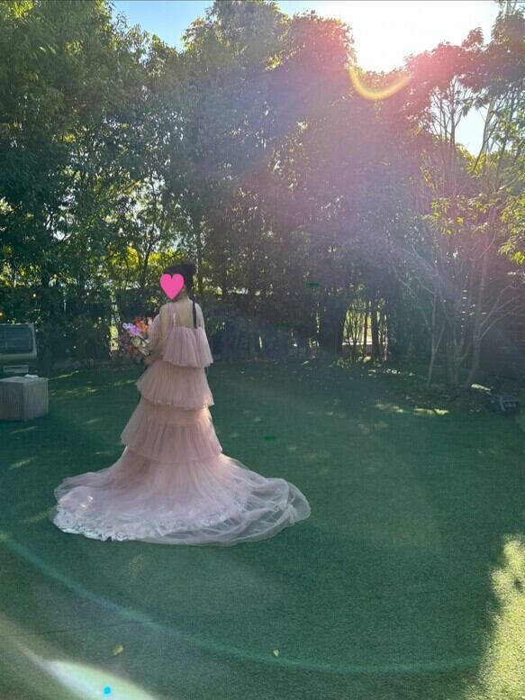 実例写真!カラードレス ピンク チュールスカート キャミソール ロングトレーン 前撮り