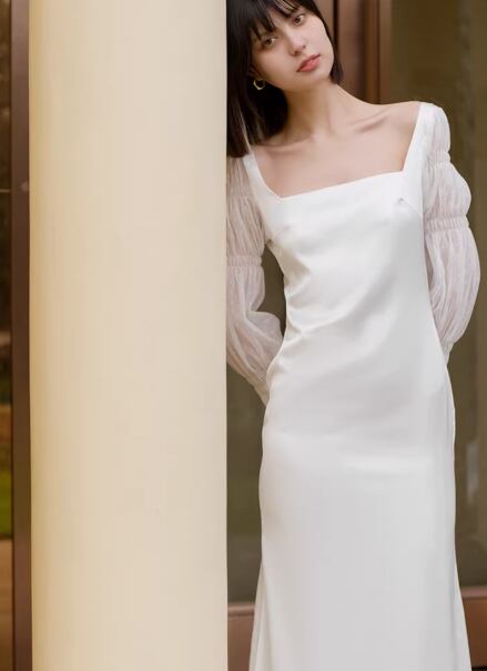 パーティードレス オフホワイト スクエアネック シースルー袖 背中見せ エレガント 2次会/合コン