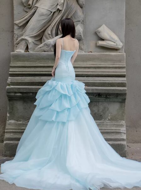 高品質!カラードレス ブルー キャミソール ベアトップ マーメイドライン デザイン感 ラッフルフリル 前撮り