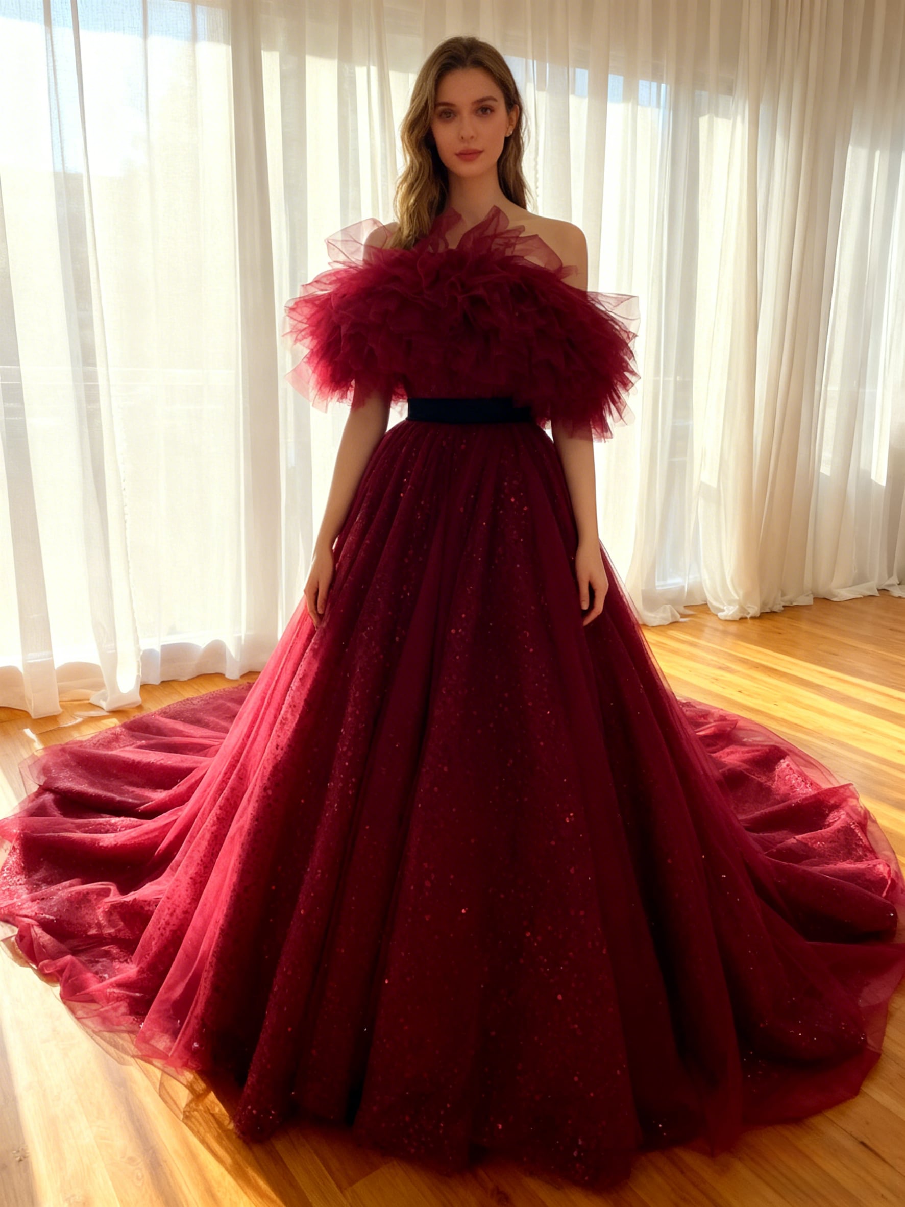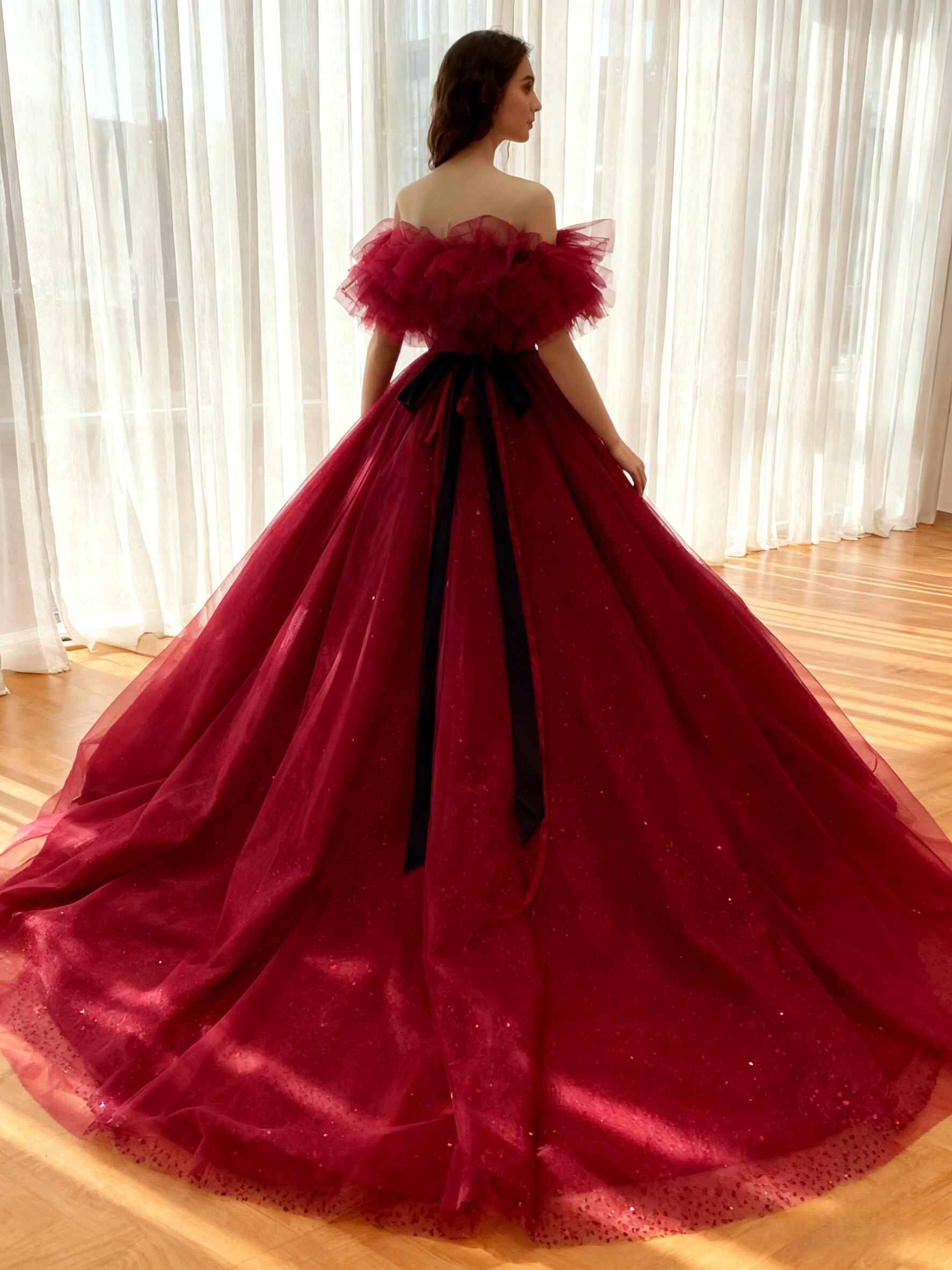 カラードレス ワインレッド オフショルダー シークインチュール ロングトレーン 華やか 花嫁