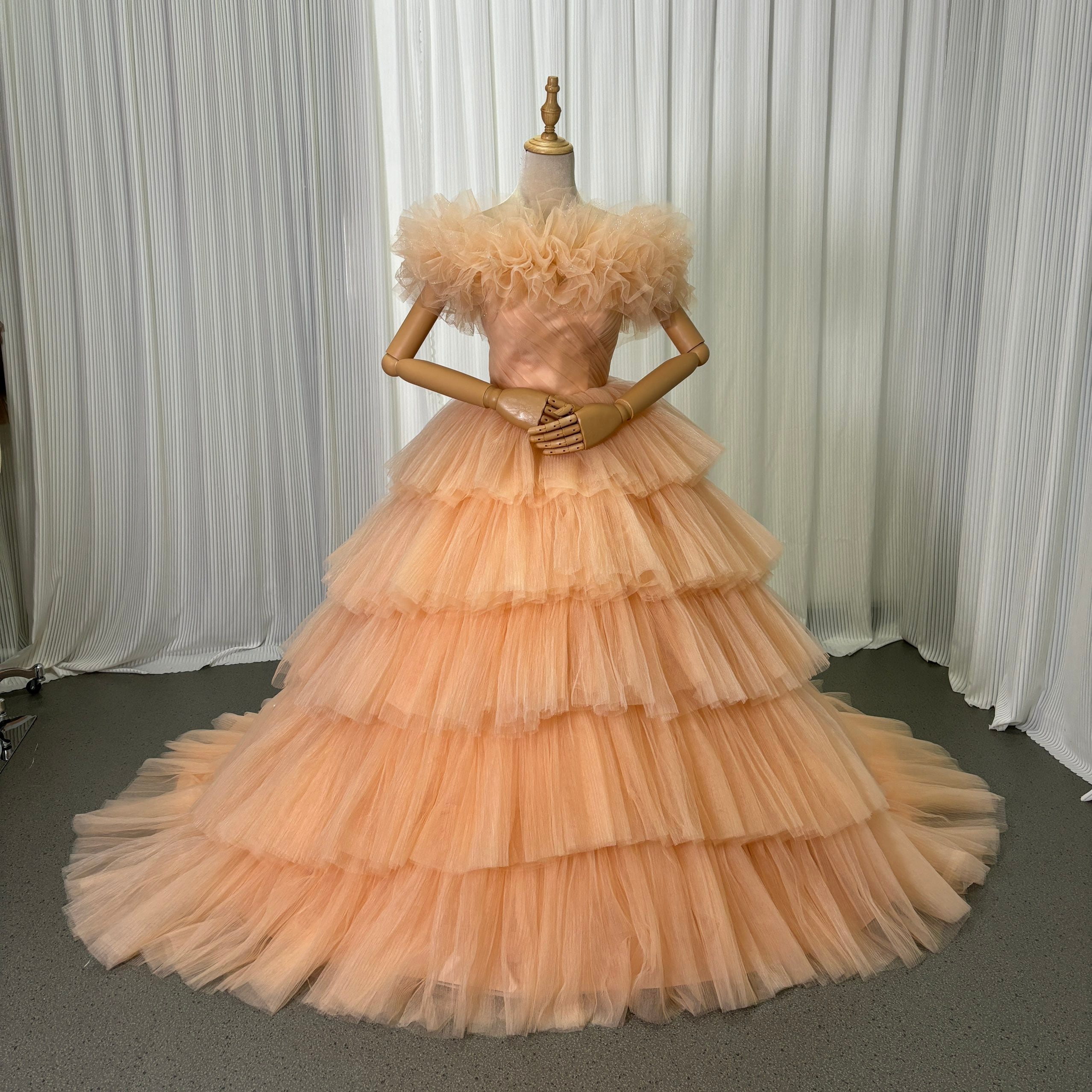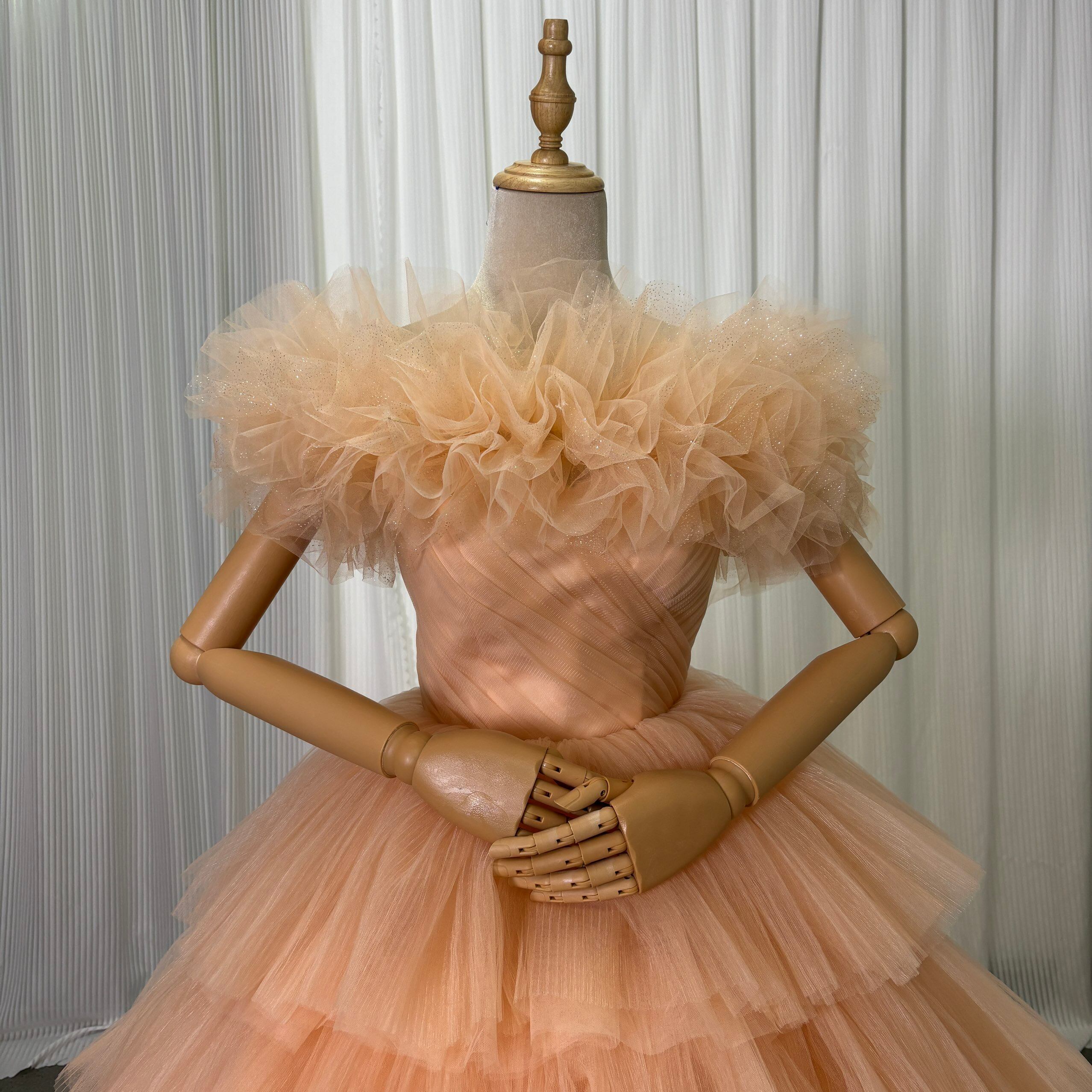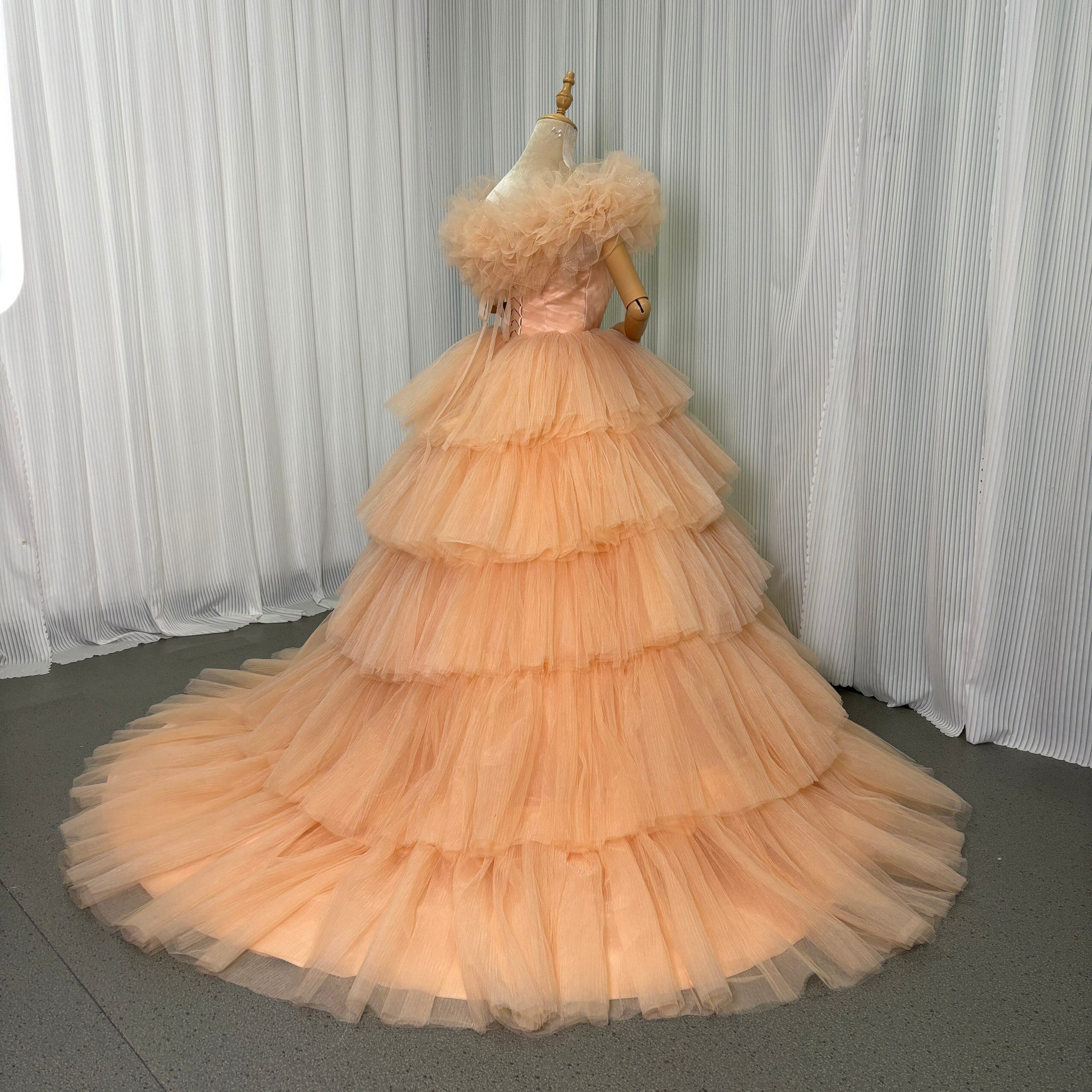 実例写真!可愛い カラードレス オレンジ 取り外しオフショルダー プリーツスカート ボリュームドレス 前撮り