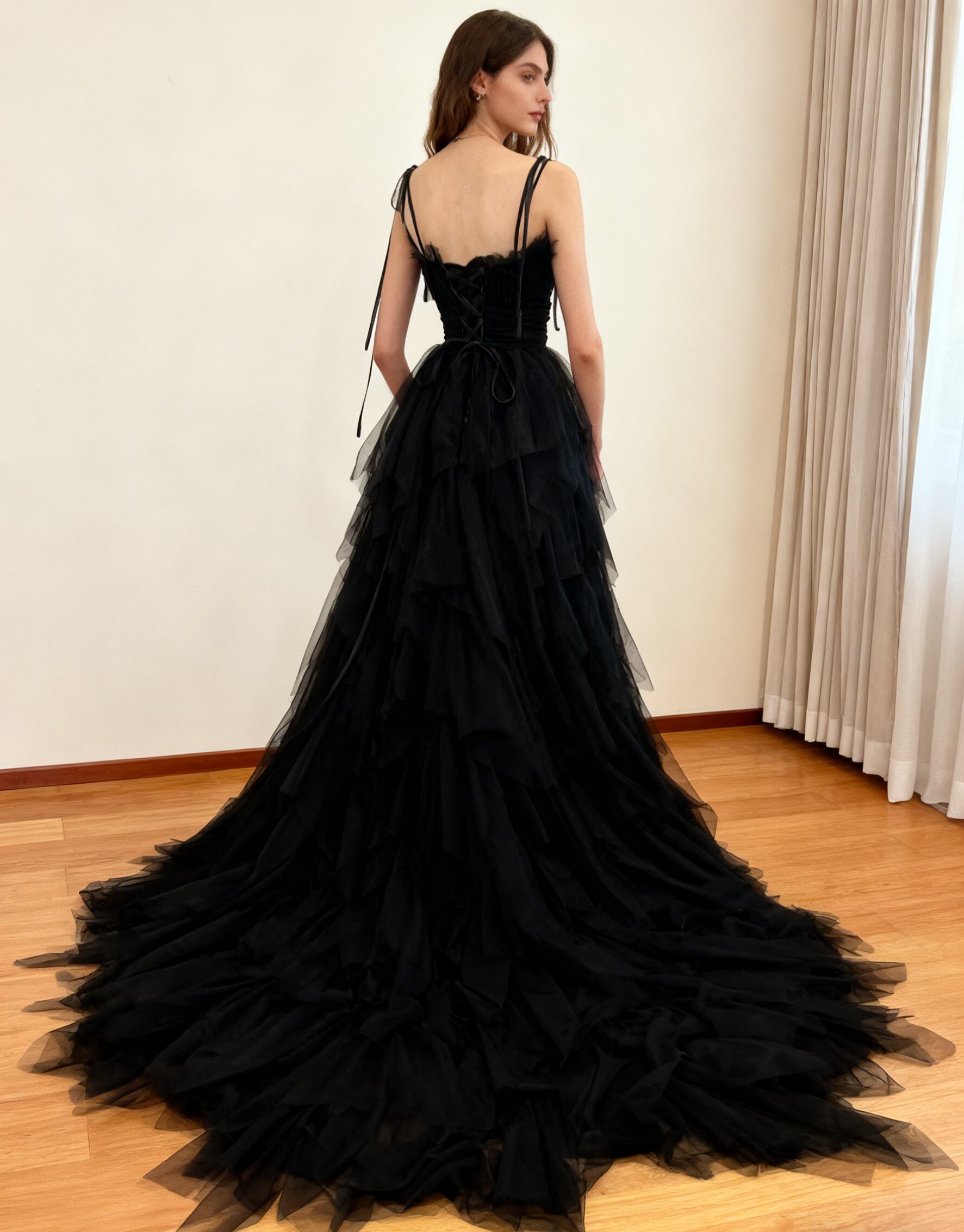 パーティードレス ブラック キャミソール ラッフルフリル ロングトレーン 演奏会/音楽会