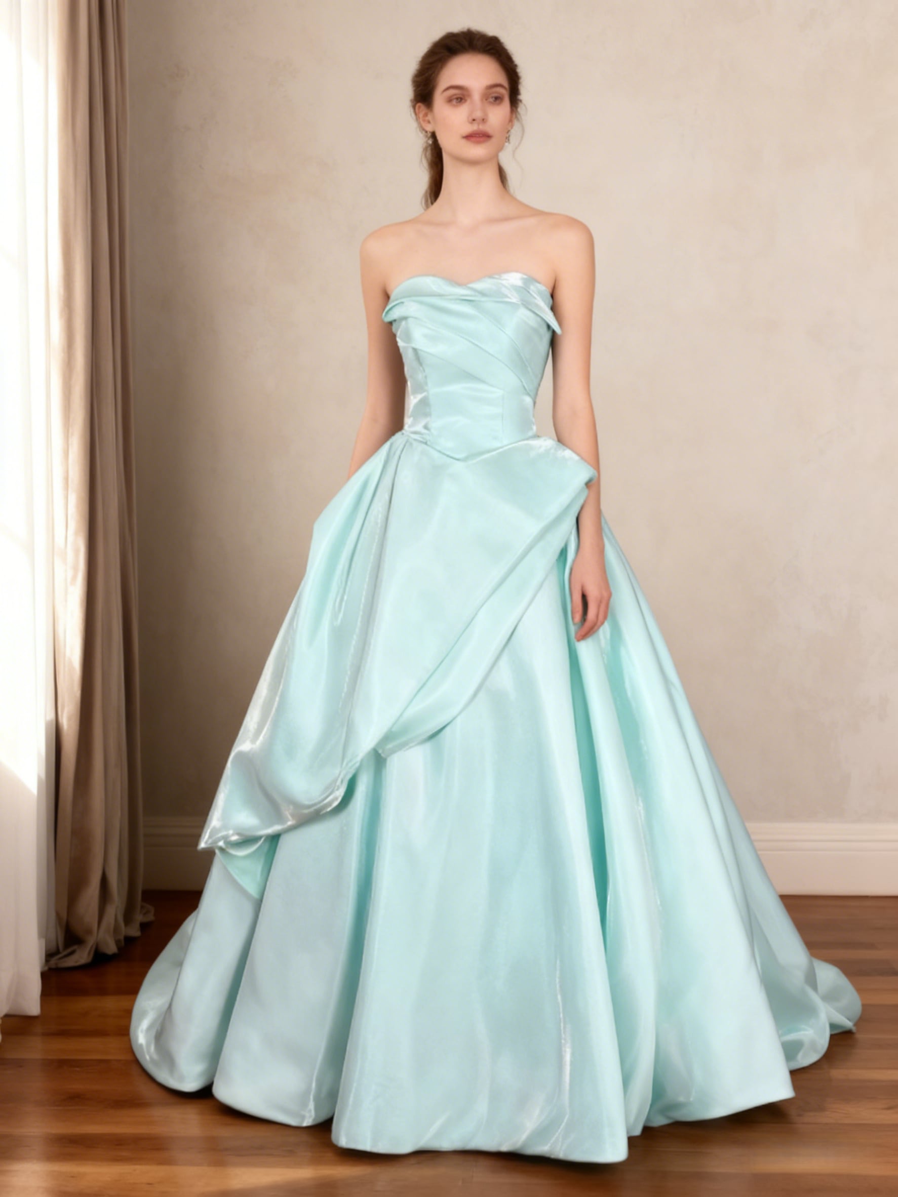 カラードレス ブルー 光沢サテン 取り外しオフショルダー ハンドドレープ 編み上げ 音楽会
