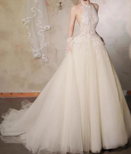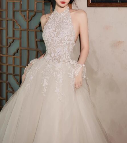 ウェディングドレス ホルターネック 魅惑の花レース 背中見せ フレアスカート セクシー 結婚式