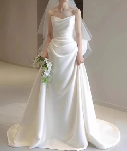 ウェディングドレス ベアトップ ふっくら柔らかなバックリボン 優雅なシルエット ロイヤルサテン 結婚式