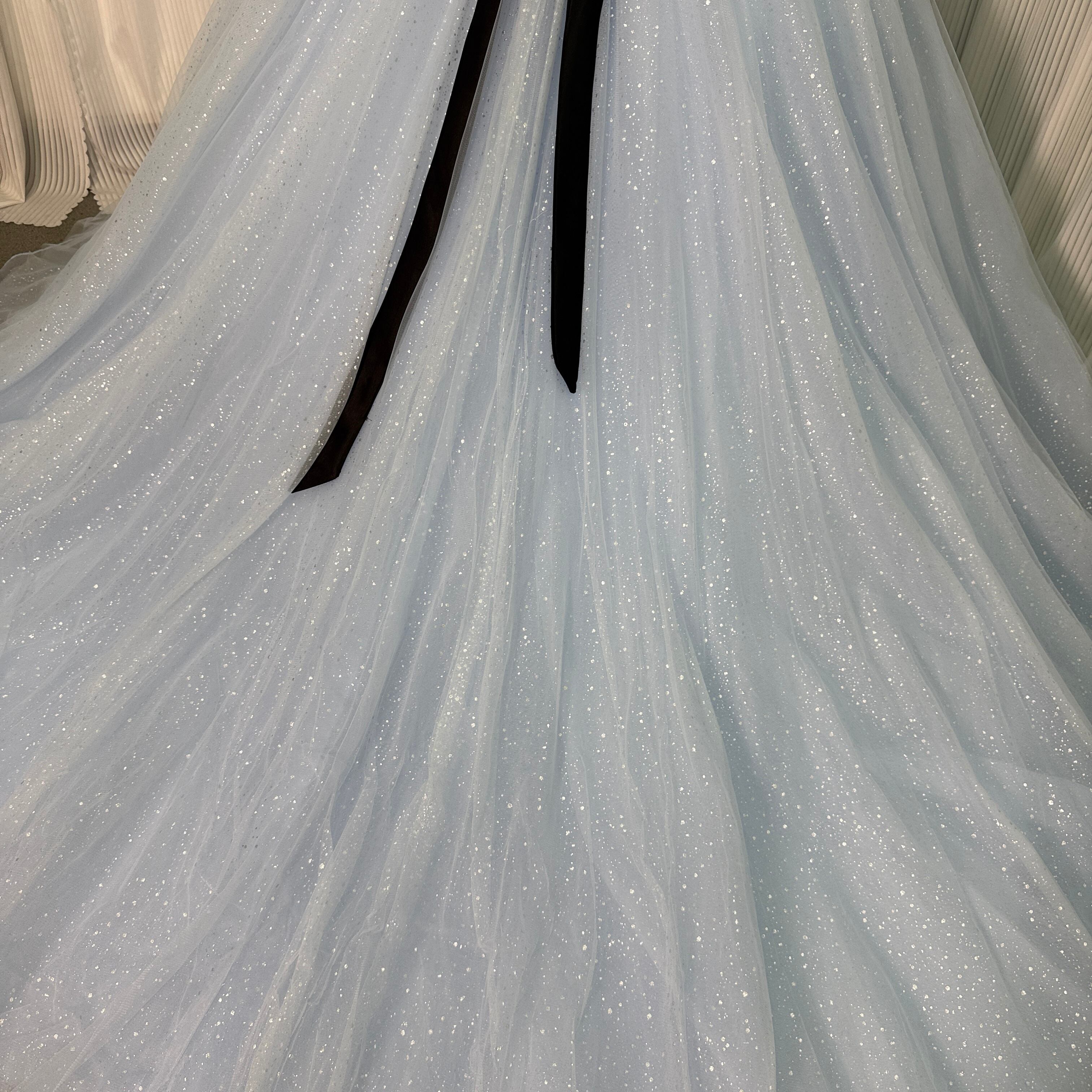 カラードレス ライトブルー ベアトップ サッシュベルト キラキラチュール ロングトレーン 披露宴