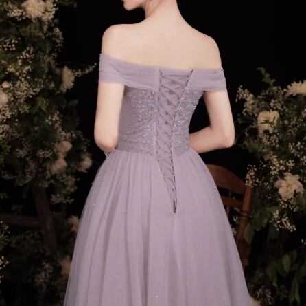 カラードレス パープル オフショルダー キラキラスパンコール 可愛い 謝恩会 チュールドレス 編み上げ