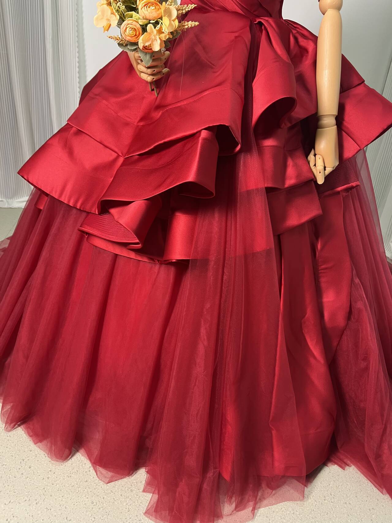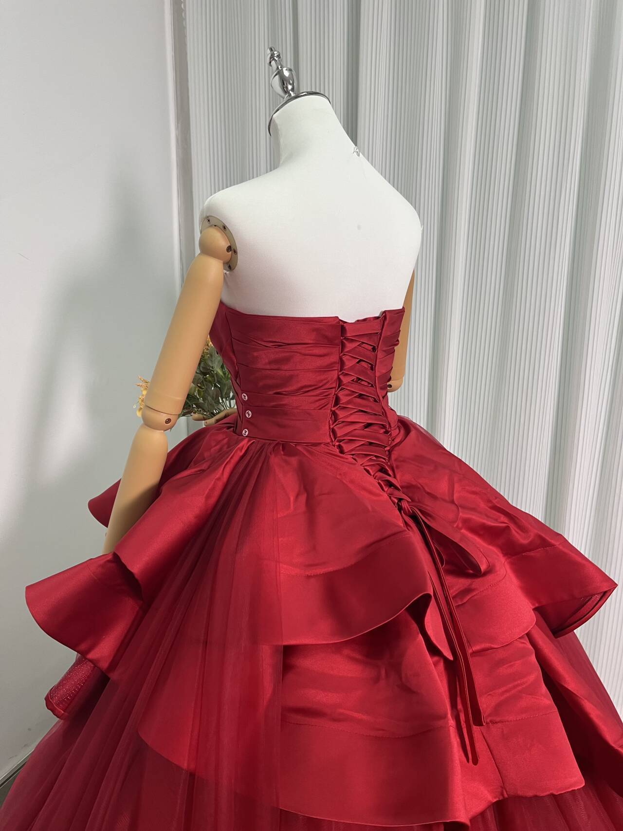 実例写真!カラードレス ボルドー色 ベアトップ ラッフルフリル プリンセスライン 花嫁 編み上げ