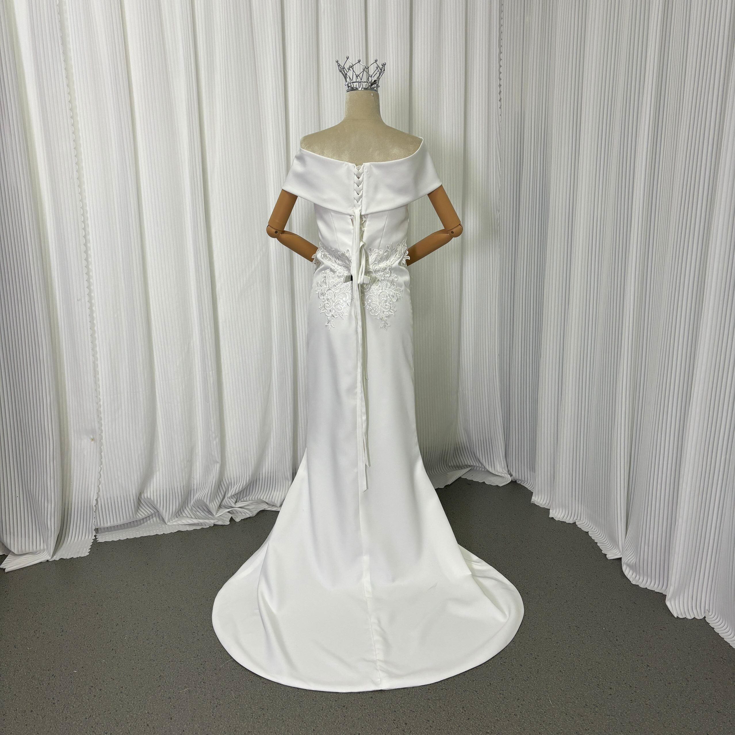 ウェディングドレス 取り外しオフショルダー スレンダーライン 繊細レース クレープ生地 ミニトレーン 編み上げ 2次会