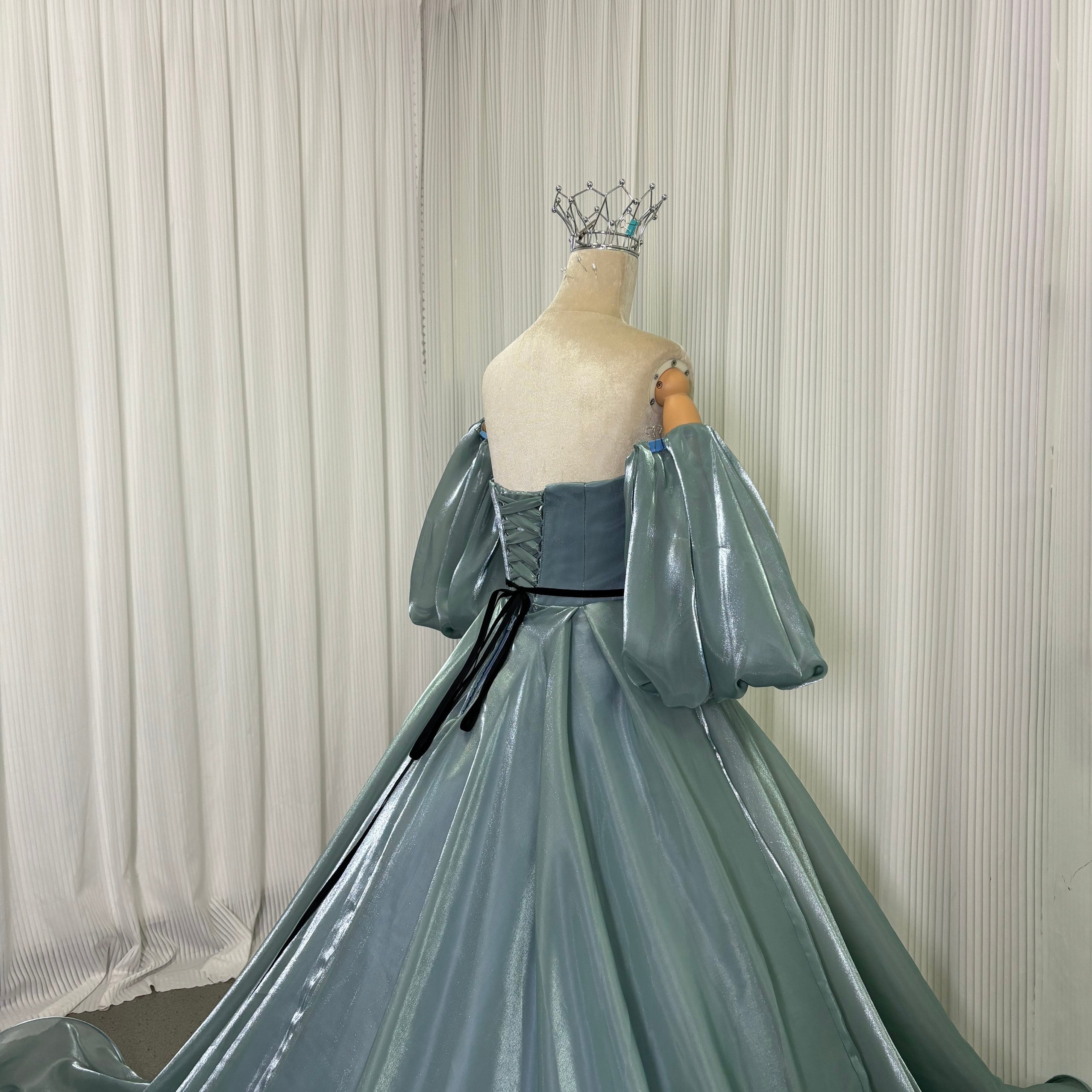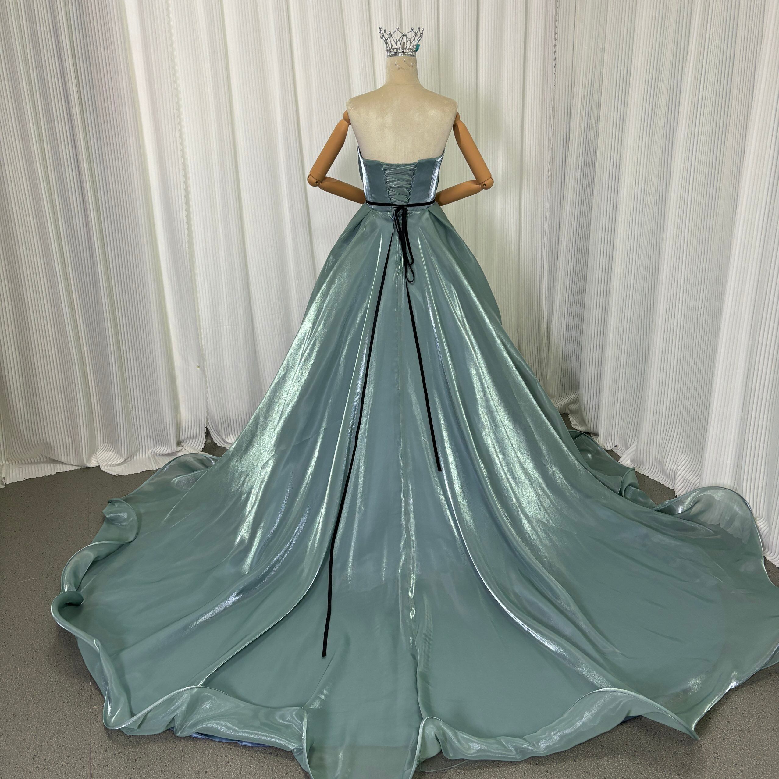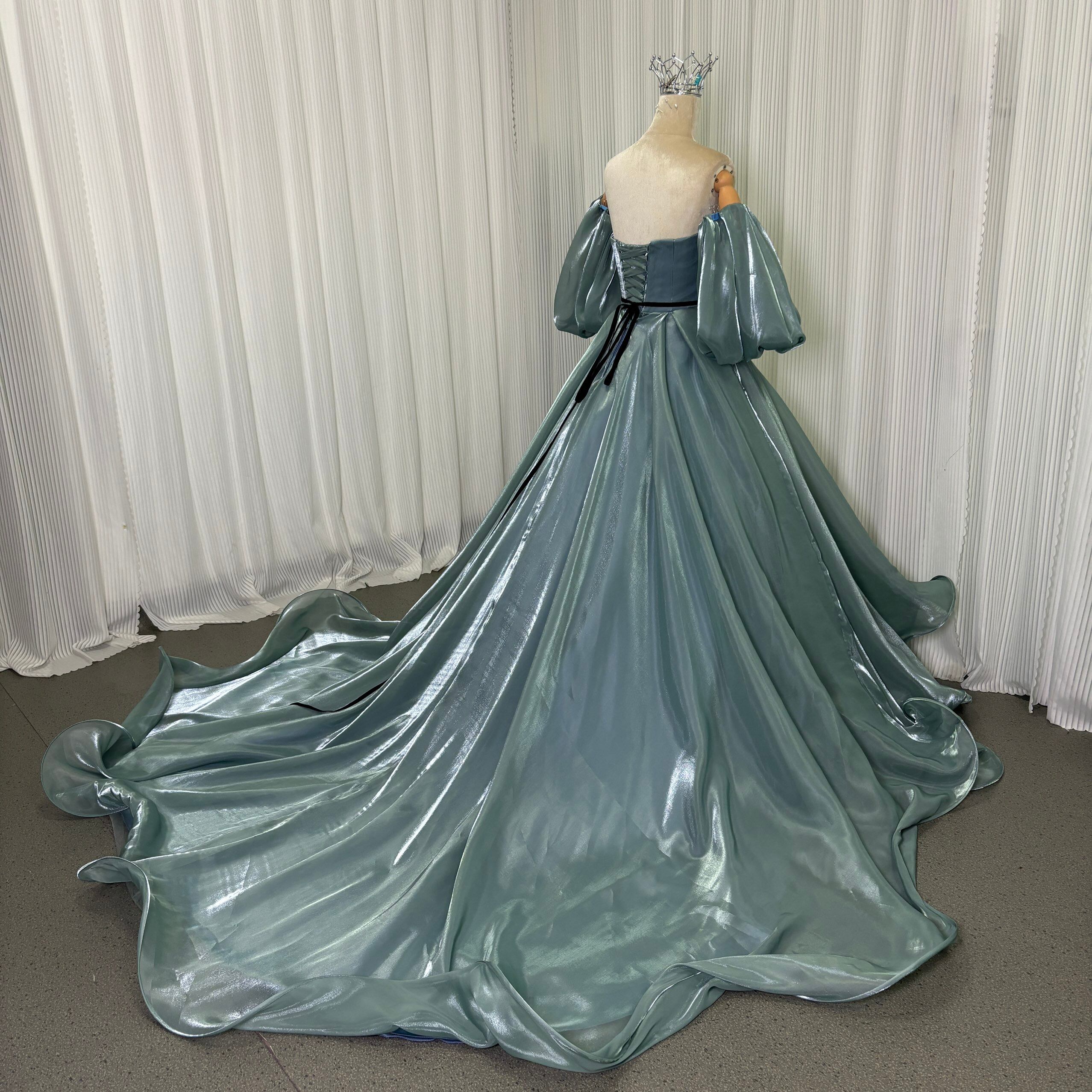 カラードレス ブルー ベアトップ パフスリーブ ロングトレーン サッシュベルト 光沢感 編み上げ 披露宴