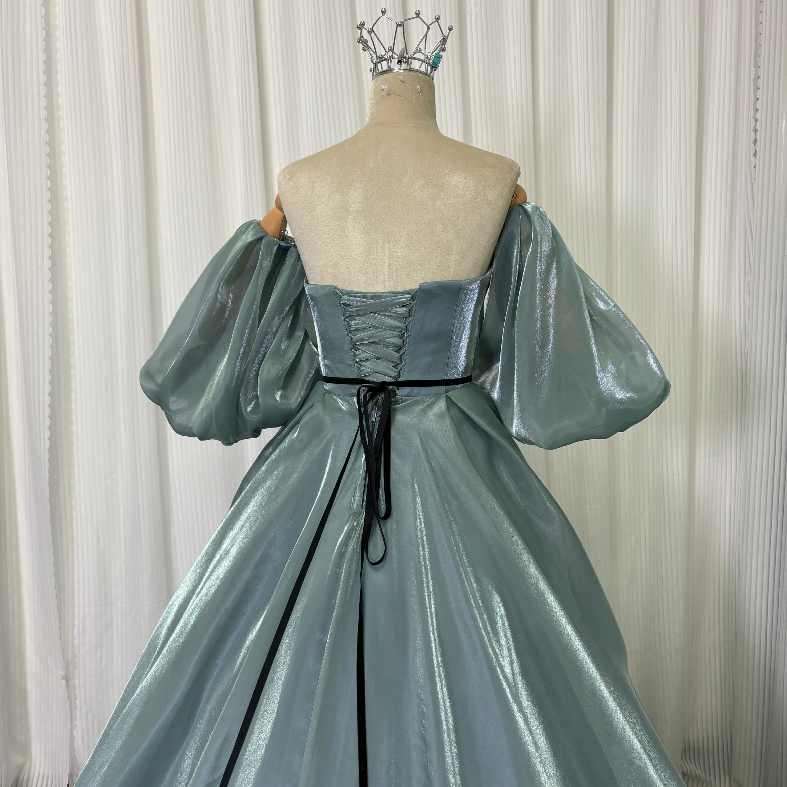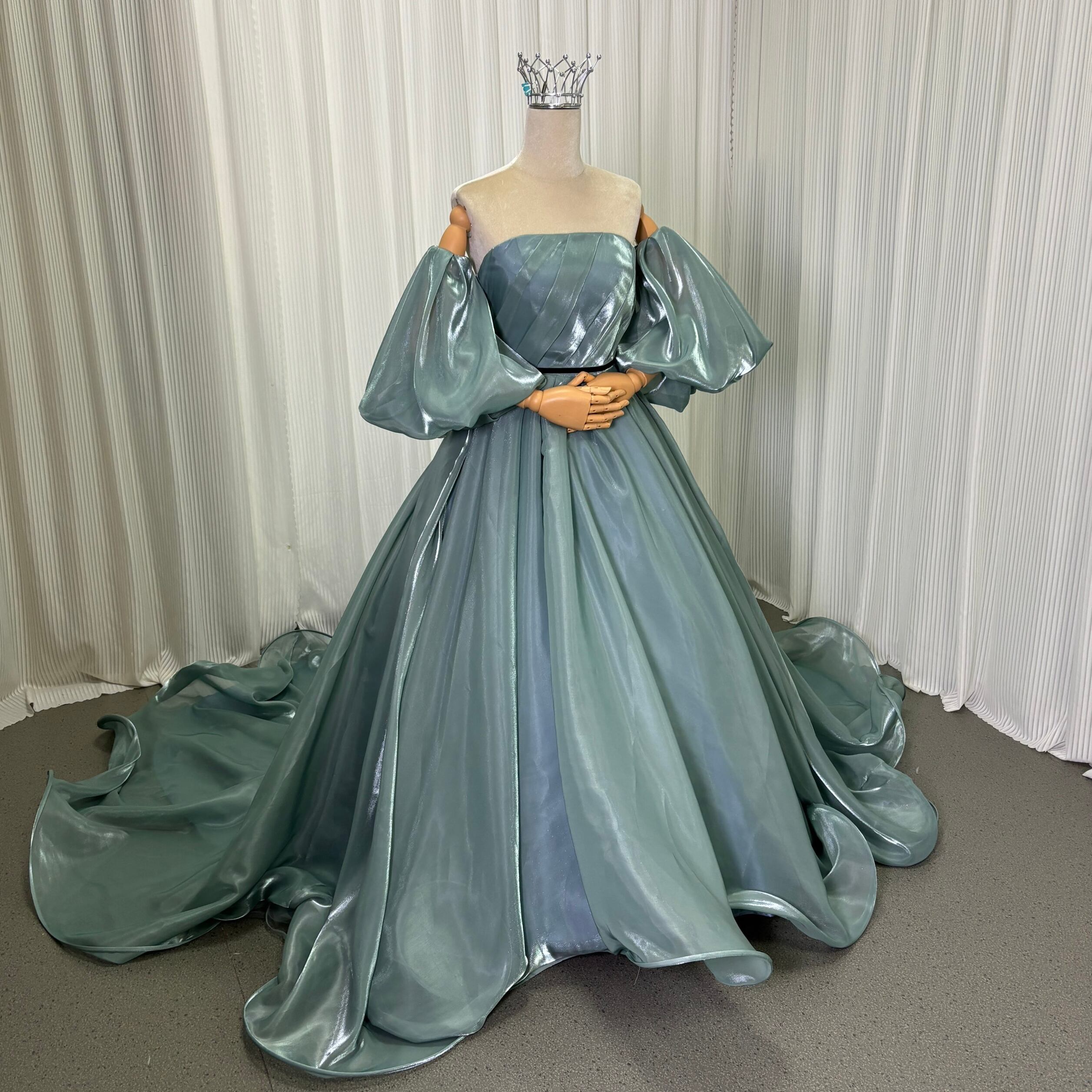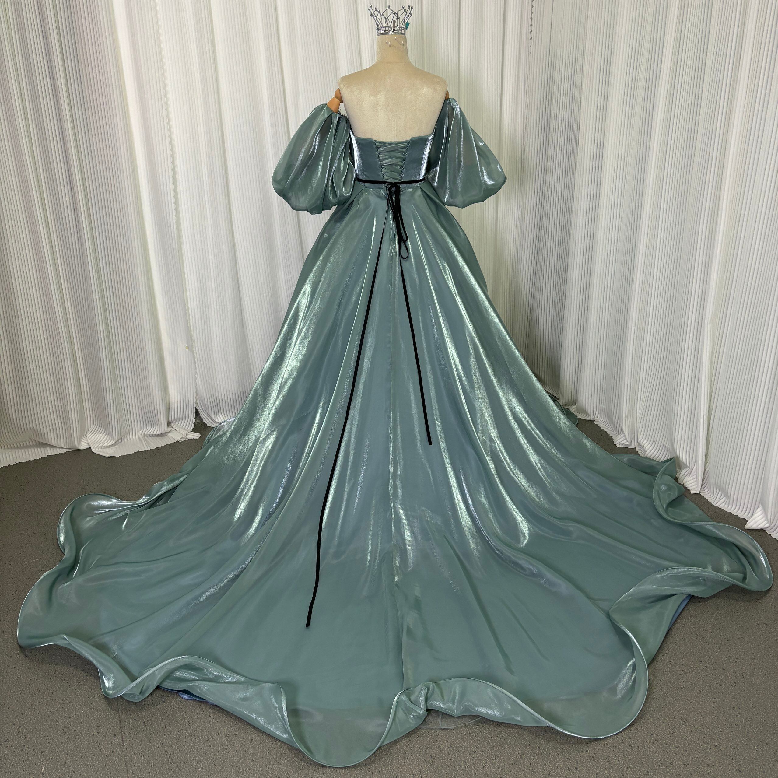 カラードレス ブルー ベアトップ パフスリーブ ロングトレーン サッシュベルト 光沢感 編み上げ 披露宴